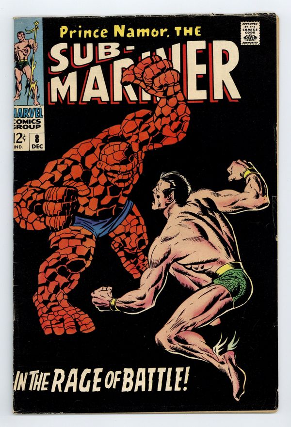 Tags: Fantastic Four, Sub-Mariner$72.001st Printing. "In the Rage of Battle!" Guest-starring the Thing. Written by Roy Thomas. Art by John Buscema and Dan Adkins. It's the heavyweight bout for the championship as the Savage Sub-Mariner clashes with the ever-lovin' blue-eyed Thing! 36 pages, full color. NOTE: 1994 JC Penney reprint exists. Can be identified by having a Stridex ad on the back cover. Cover price $0.12.