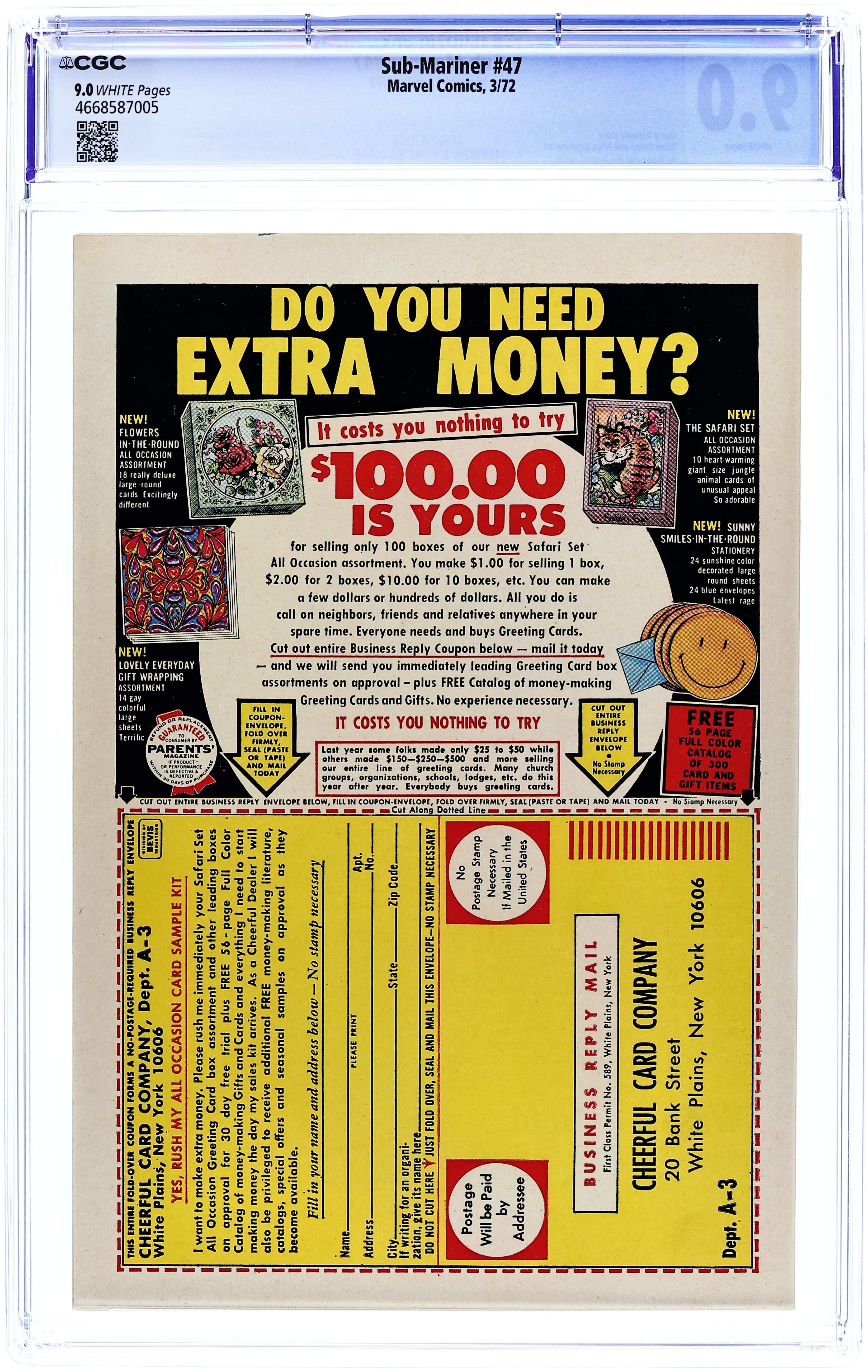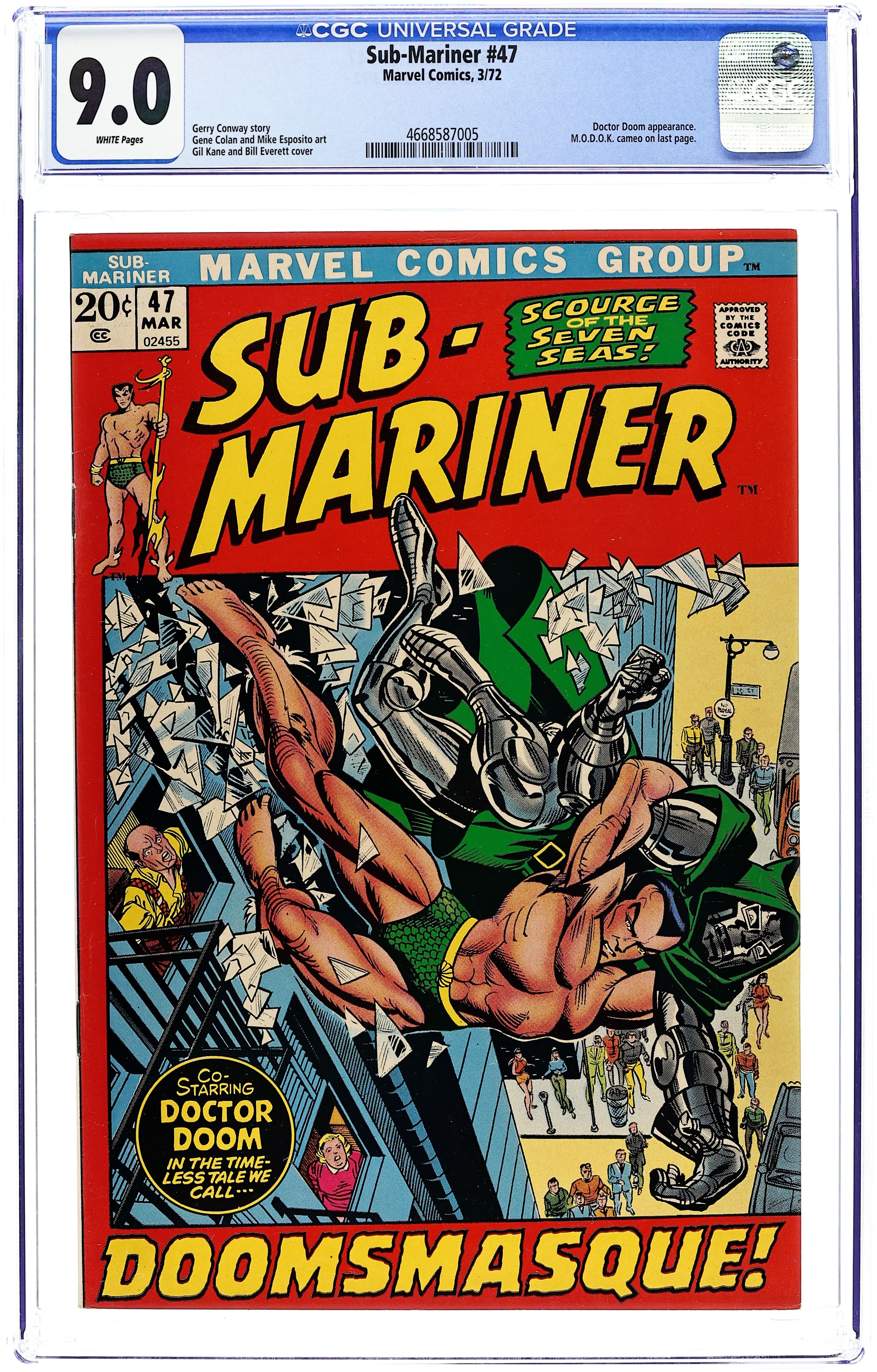 Cover pencils by Gil Kane and John Romita (alterations), inks by Bill Everet and John Romita (alterations). "Doomsmasque," script by Gerry Conway, pencils by Gene Colan, inks by Mike Esposito; Namor, without his memories and haunted by the figure of his father, is injured escaping from the authorities and is taken in by a young woman; However, Namor has drawn the attention of Dr. Doom who is well aware of Namor's memory loss and is eager to get him to join his cause; Fortunately, pieces of his memory convince Namor that Doom isn't to be trusted and attacks him; Their battle is stopped by the young woman, Cindy Jones, who took Namor in and Dr. Doom invites them both to the Latverian Embassy; Doom tricks Namor into becoming his ally once again and they head out to attack an A.I.M. installation so that Doom can get his hands on the Cosmic Cube. 36 pgs., full color. $0.20. Cover price $0.20.