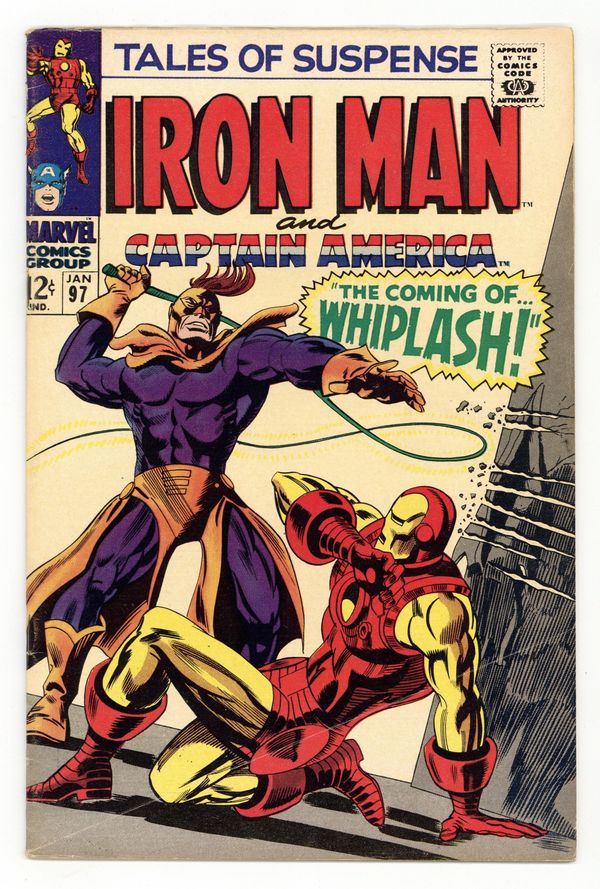 Tags: Marvel Legacy Numbering: Captain America (part 97), Marvel Legacy Numbering: Tales of Suspense (part 97), Black Panther, Captain America, Iron Man$50.00Cover pencils by Gene Colan, inks by Frank Giacoia. "The Coming of... Whiplash," script by Stan Lee, pencils by Gene Colan, inks by Frank Giacoia; Jasper Sitwell tries to remove Iron Mans helmet, but cant; Tonys cousin Morgan Stark tells the Maggia he can get them Iron Man, who battles Maggia goons. "And So It Begins--!", script by Stan Lee, pencils by Jack Kirby, inks by Joe Sinnott; Two men from a crime syndicate attack Captain America; Black Panther visits an outpost, but finds that the men guarding have been wiped out; SHIELD Agent 13, Caps lover, disguises herself as a female spy called Irma Kruhl before going on a dangerous mission. 36 pages, full color. Cover price $0.12.