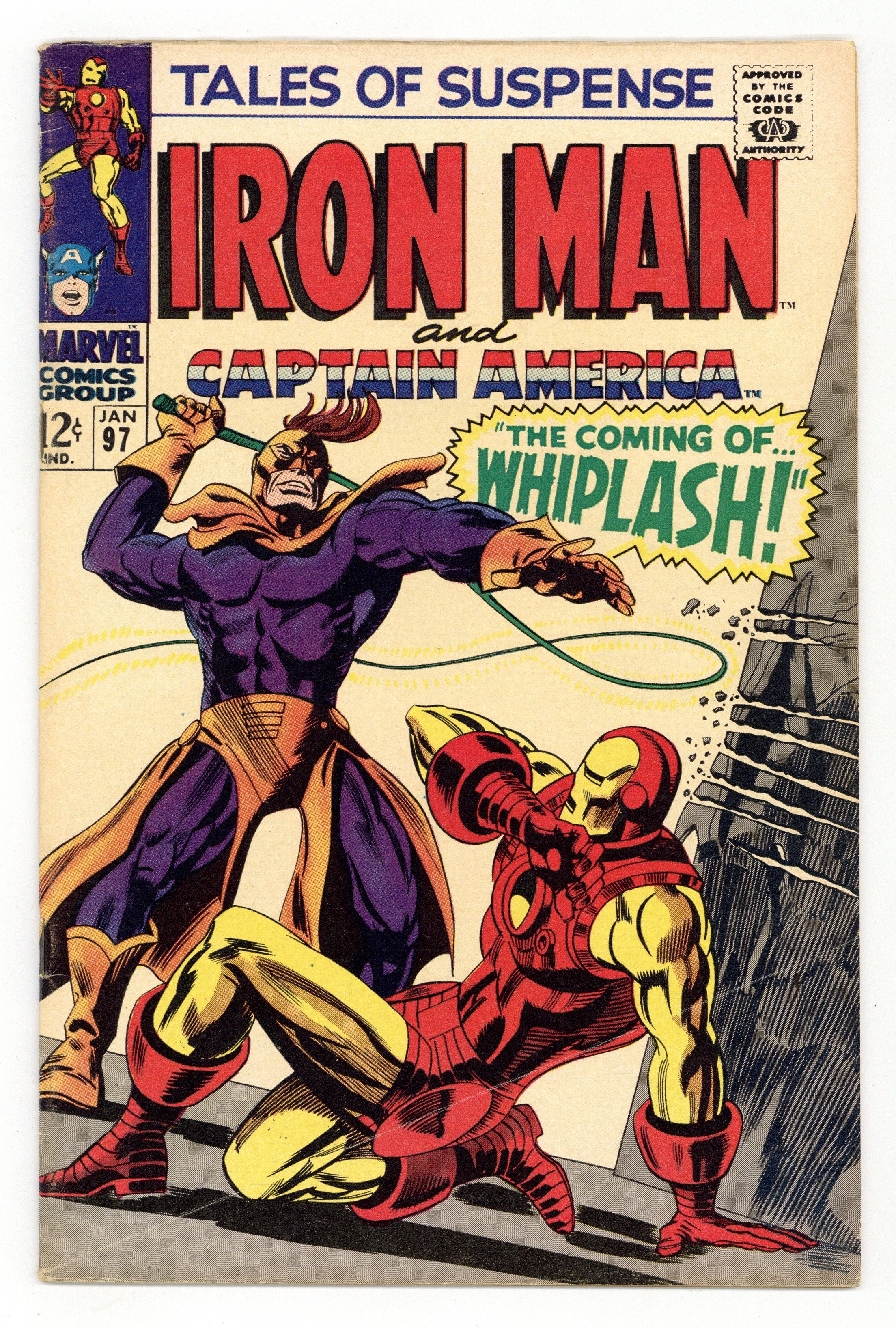 Cover pencils by Gene Colan, inks by Frank Giacoia. "The Coming of... Whiplash," script by Stan Lee, pencils by Gene Colan, inks by Frank Giacoia; Jasper Sitwell tries to remove Iron Mans helmet, but cant; Tonys cousin Morgan Stark tells the Maggia he can get them Iron Man, who battles Maggia goons. "And So It Begins--!", script by Stan Lee, pencils by Jack Kirby, inks by Joe Sinnott; Two men from a crime syndicate attack Captain America; Black Panther visits an outpost, but finds that the men guarding have been wiped out; SHIELD Agent 13, Caps lover, disguises herself as a female spy called Irma Kruhl before going on a dangerous mission. 36 pages, full color. Cover price $0.12.
