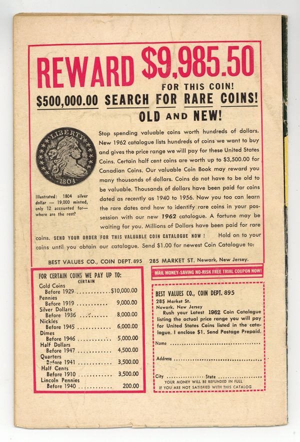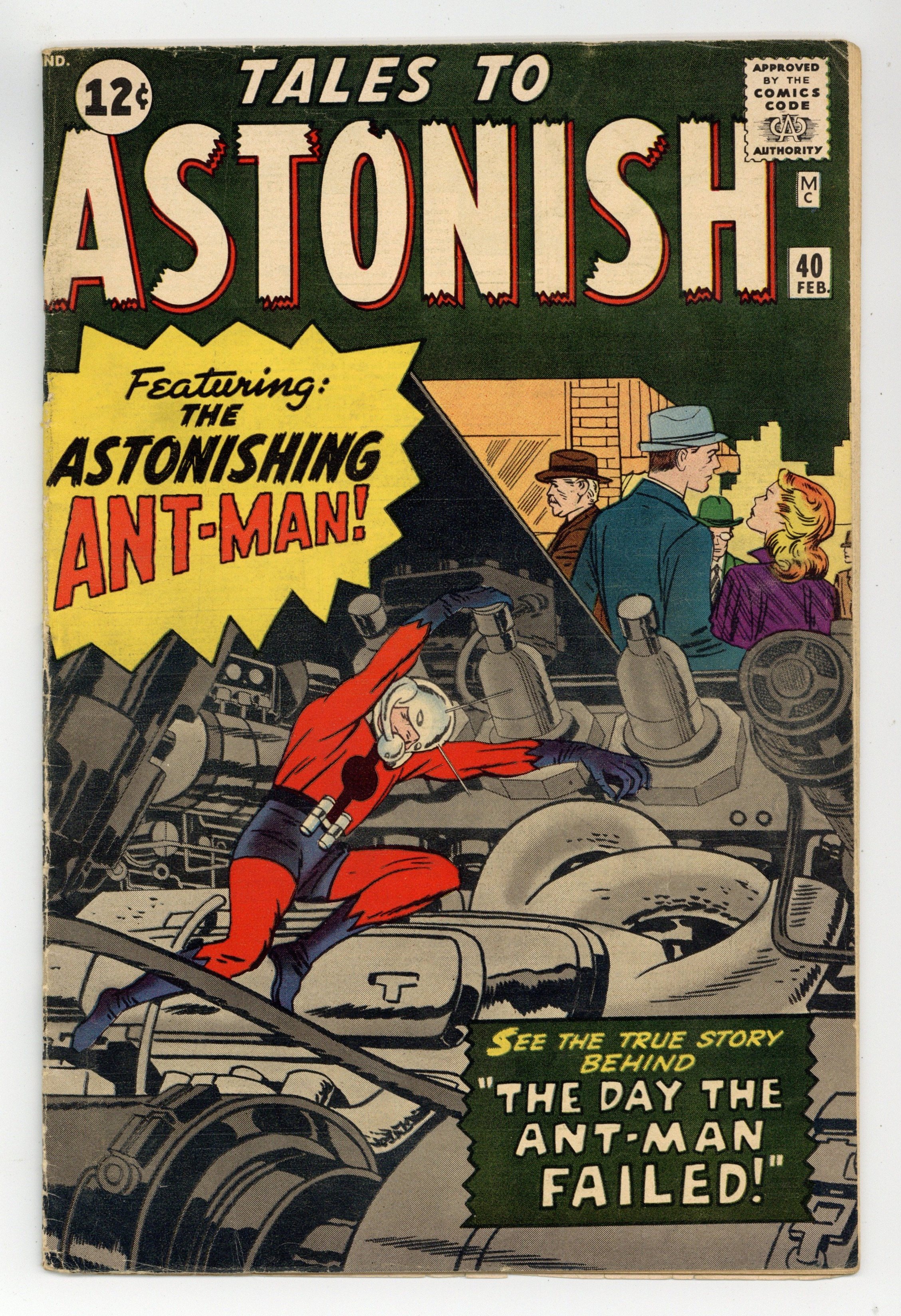 Cover by Jack Kirby. The Day Ant-Man Failed!, script by Stan Lee and Larry Lieber, art by Jack Kirby and Sol Brodsky; Ant-Man investigates a series of hijackings; He pretends to be sick to lure the hijacker into the open. I Was Trapped in the Mad Universe!, script by Stan Lee and Larry Lieber, art by Don Heck; A boy finds a device from the future that transports him to an alternate dimension with nearly identical versions of him and his family. Bird Talk text story. The Worst Man on Earth!, script by Stan Lee, art by Steve Ditko; A criminal in the year 2000 is sentenced to be exiled from humanity for his various crimes as the death penalty has been abolished. 36 pgs., full color. $0.12. Cover price $0.12.