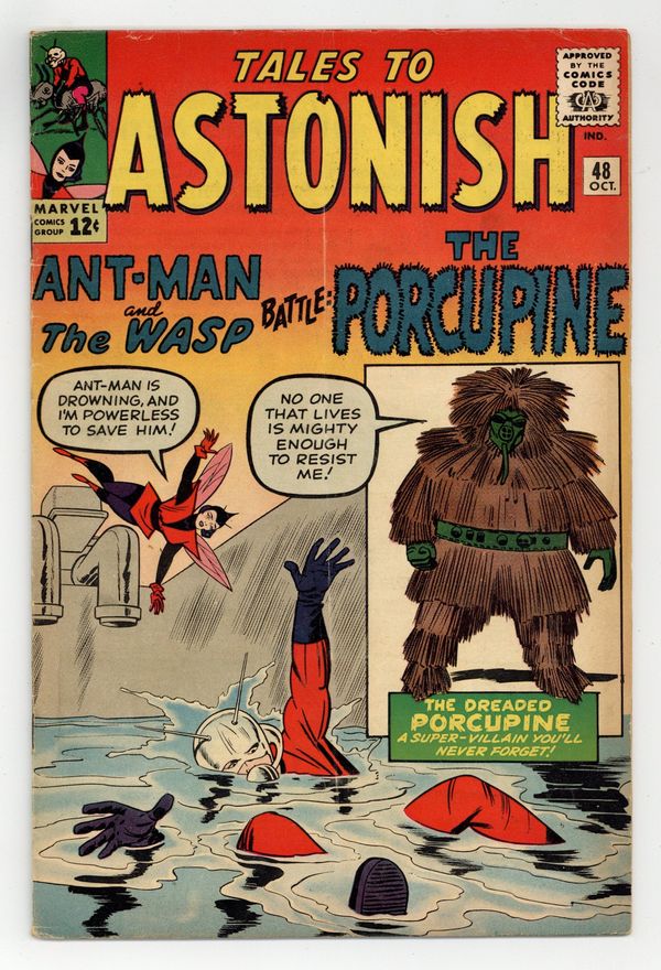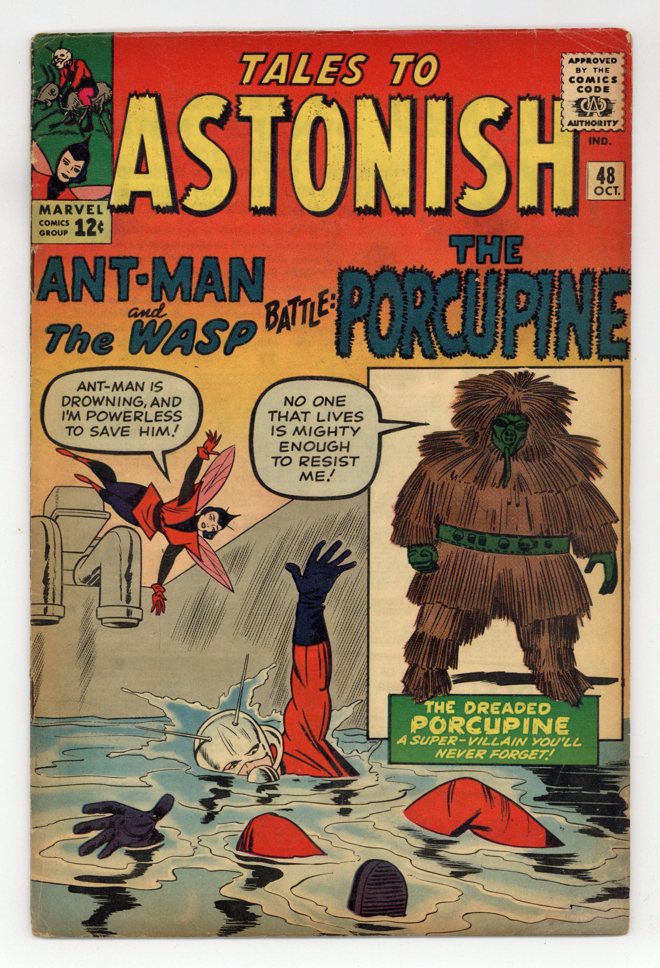 Ends Dec 8 9:37 PM CST Bid History 6 bids Current Bid $17 Your Secret Max Bid If you'd like to bid, please log in or register. Cover by Jack Kirby and Sol Brodsky. Ant-Man and the Wasp Defy the Porcupine!, script by Stan Lee and Ernie Hart [as H. E. Huntley], art by Don Heck; The Porcupine decides to rob a burglar-proof bank designed by Henry Pym. The Inventor text story. Grayson's Gorilla!, script by Stan Lee and Larry Lieber, art by Larry Lieber and Matt Fox; A scientist tries to give himself the strength of a gorilla for his own ends. The Little Green Man!, script by Stan Lee, art by Steve Ditko; An unscrupulous pilot tricks an alien into refitting his plane, but throws the creature out instead of rewarding it. 36 pgs., full color. $0.12. Cover price $0.12.