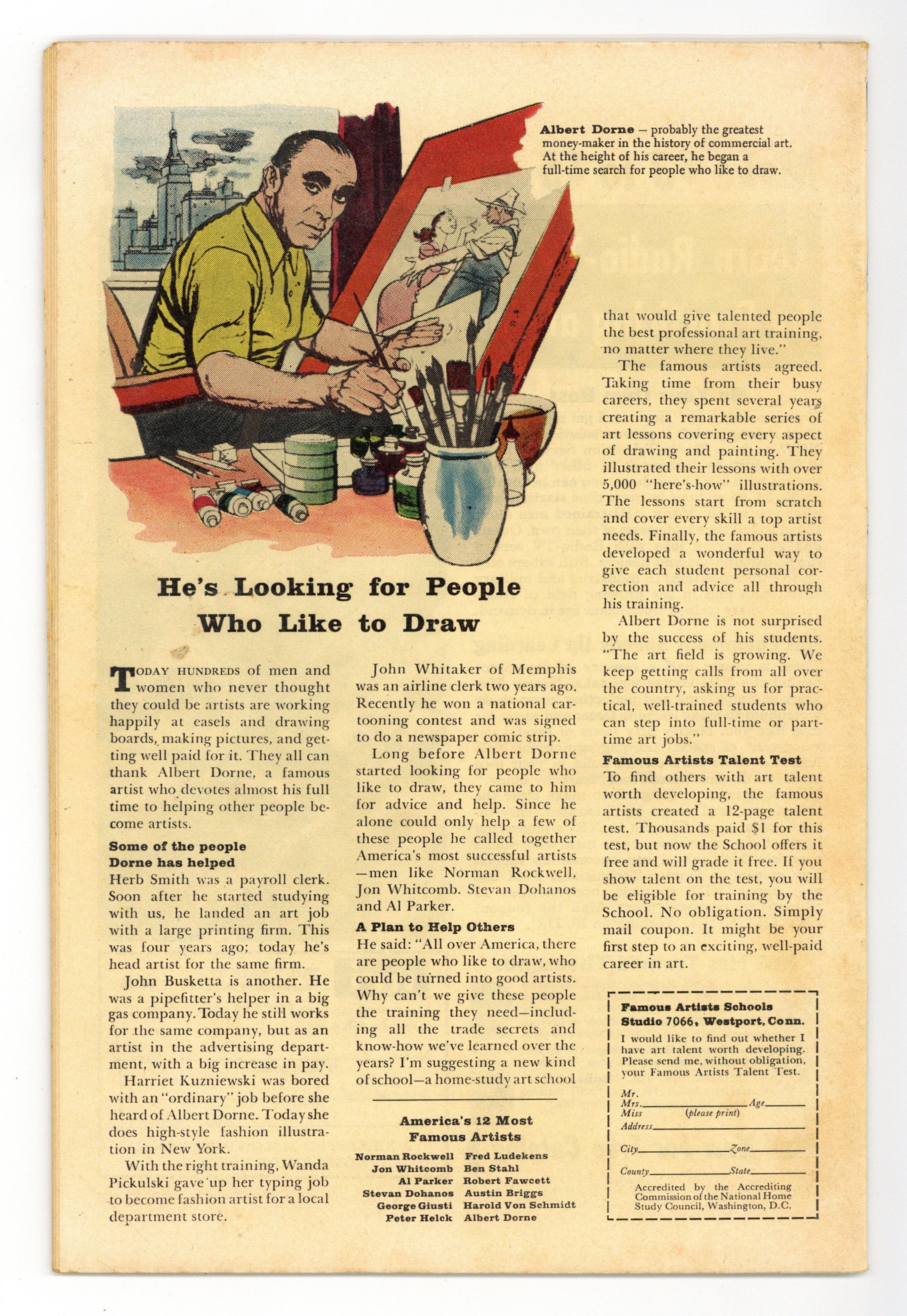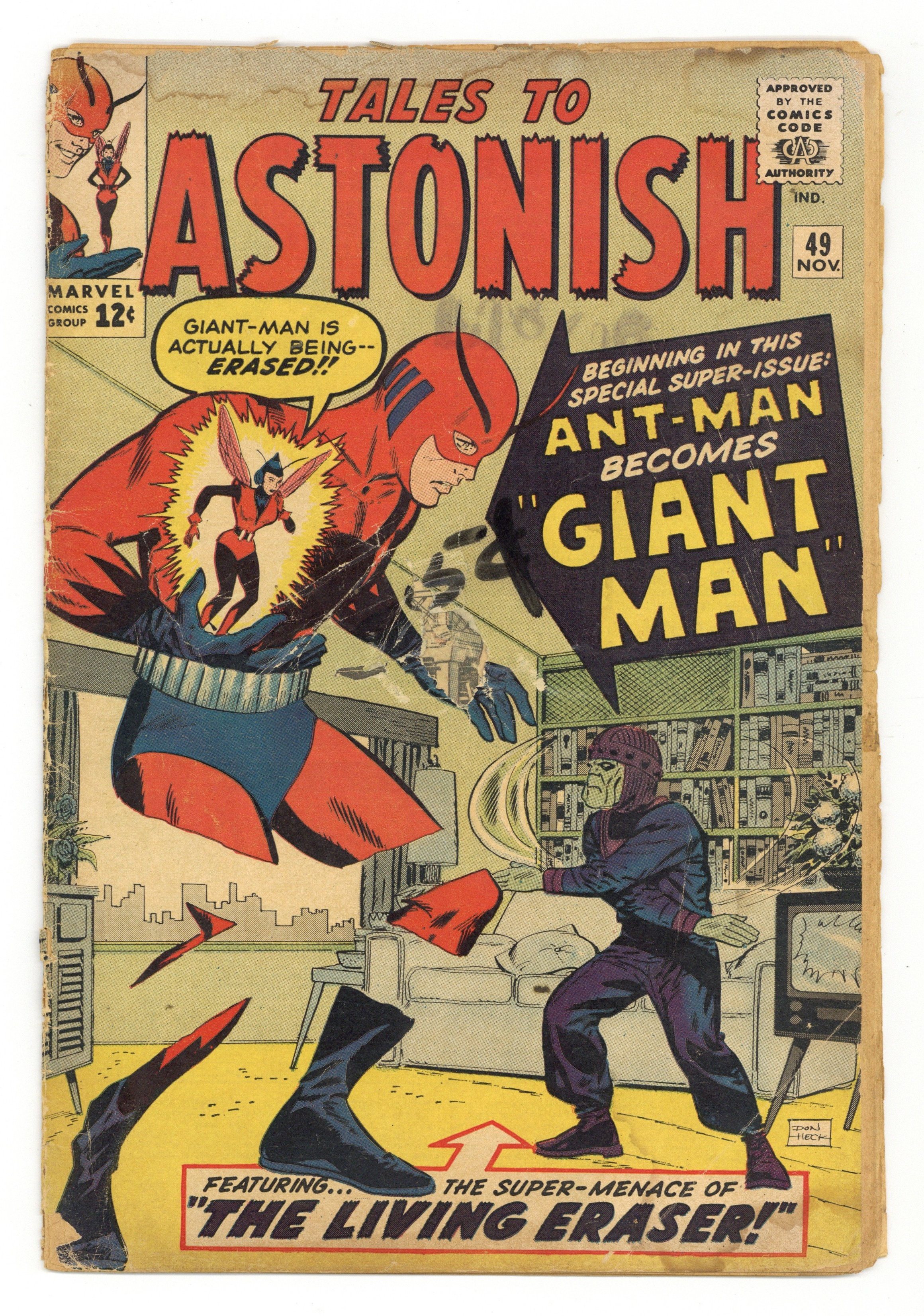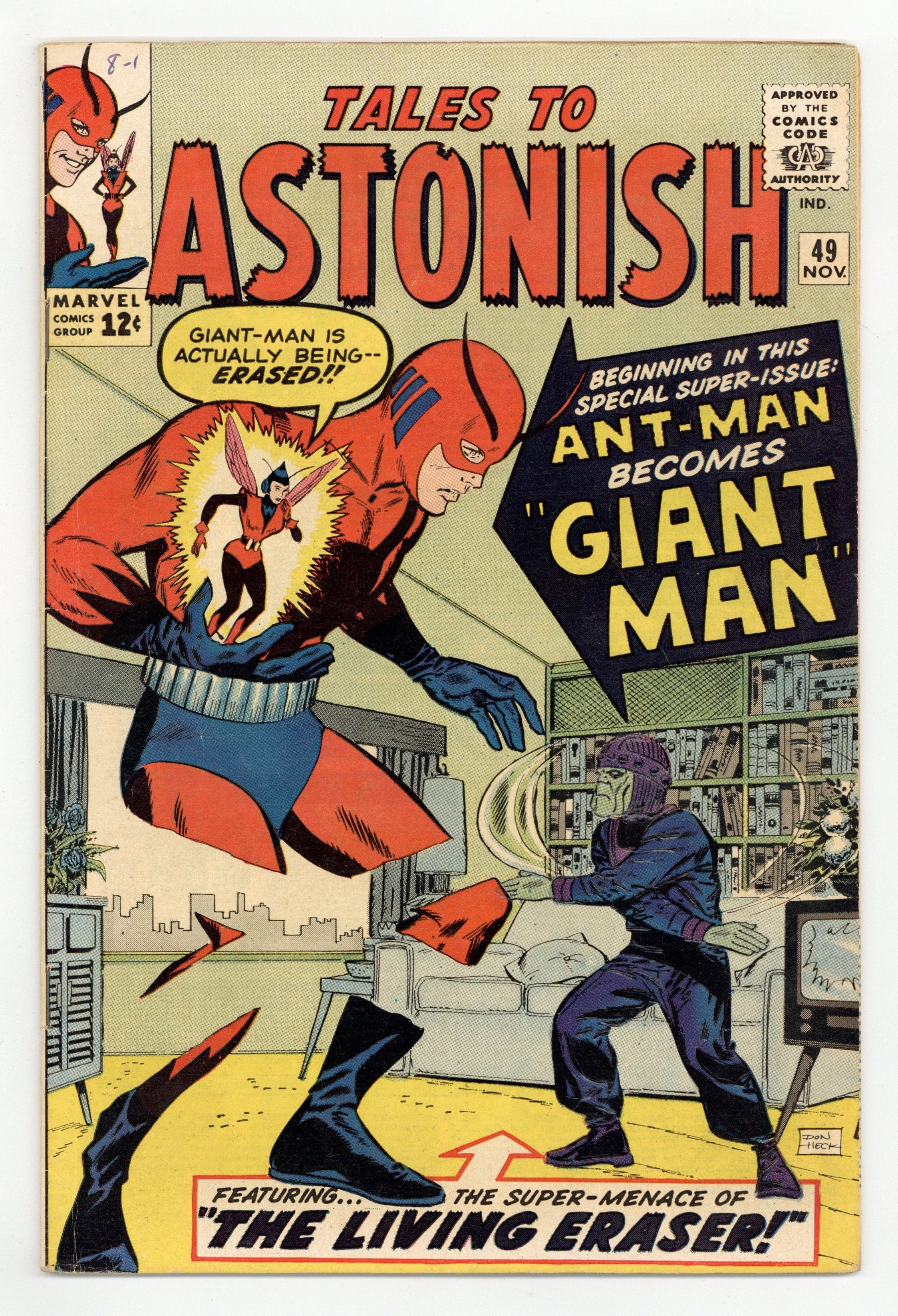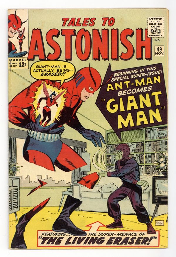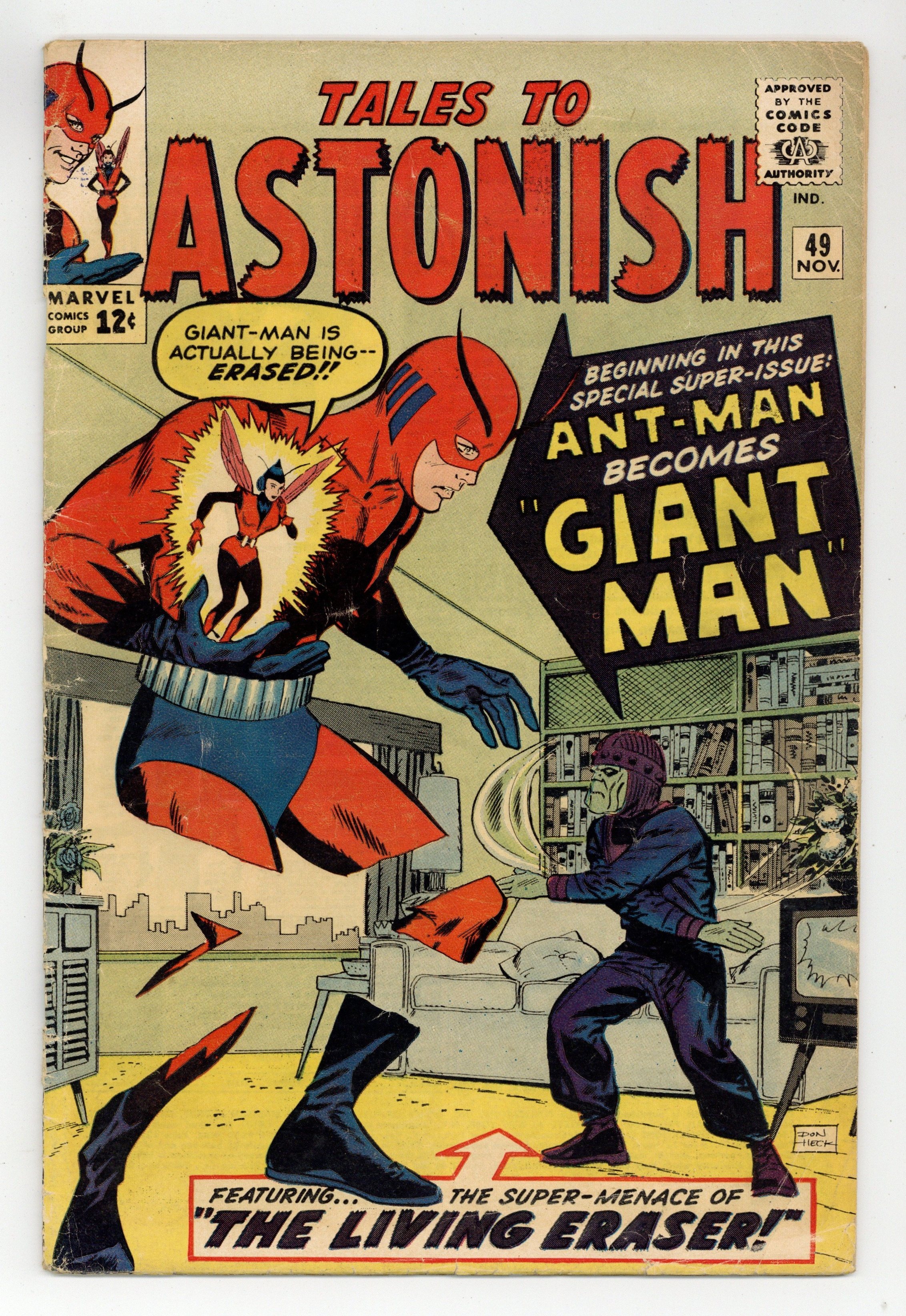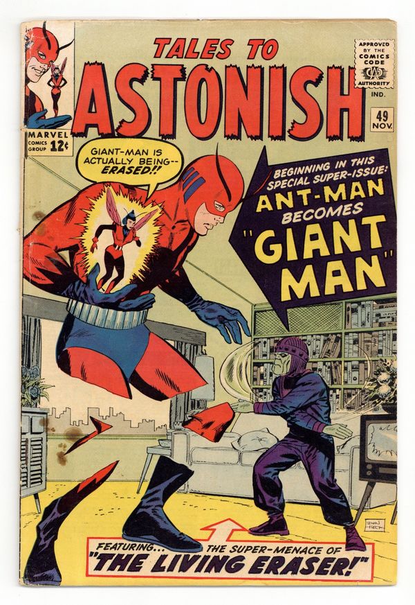 Starts Dec 15 Cover by Don Heck. The Birth of Giant-Man!, script by Stan Lee, art by Jack Kirby and Don Heck; While Henry Pym develops capsules that permit him to become giant-size as well as ant-size, the Eraser captures him and brings him to Dimension Z along with other scientists to build atomic weapons. Odd Skills text story, art by Joe Maneely. The End of a World!, script by Stan Lee and Larry Lieber, art by Larry Lieber and George Roussos [as G. Bell]; A ruler orders the destruction of an uninhabited galaxy as a tribute to his power. 36 pgs., full color. $0.12. Cover price $0.12.