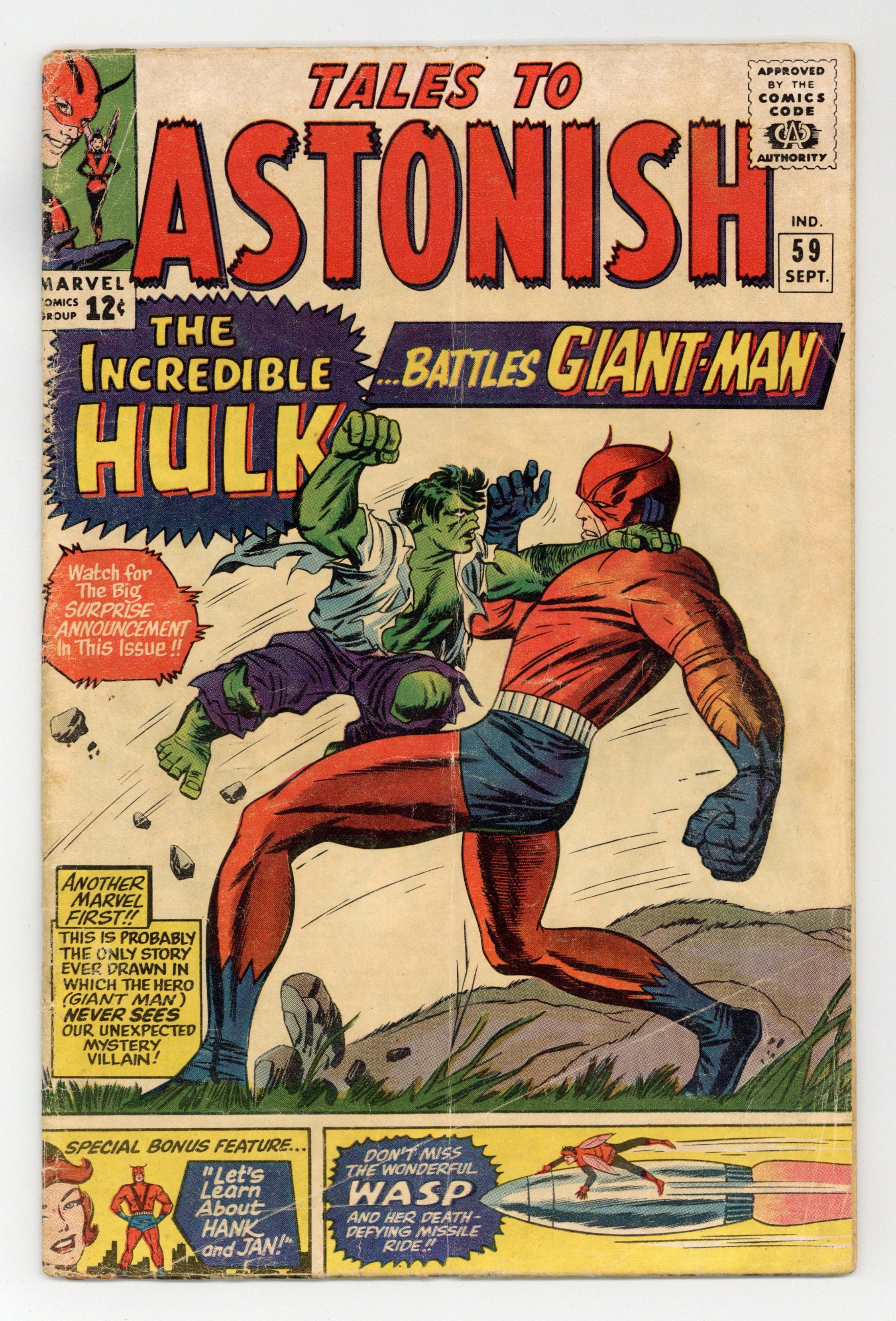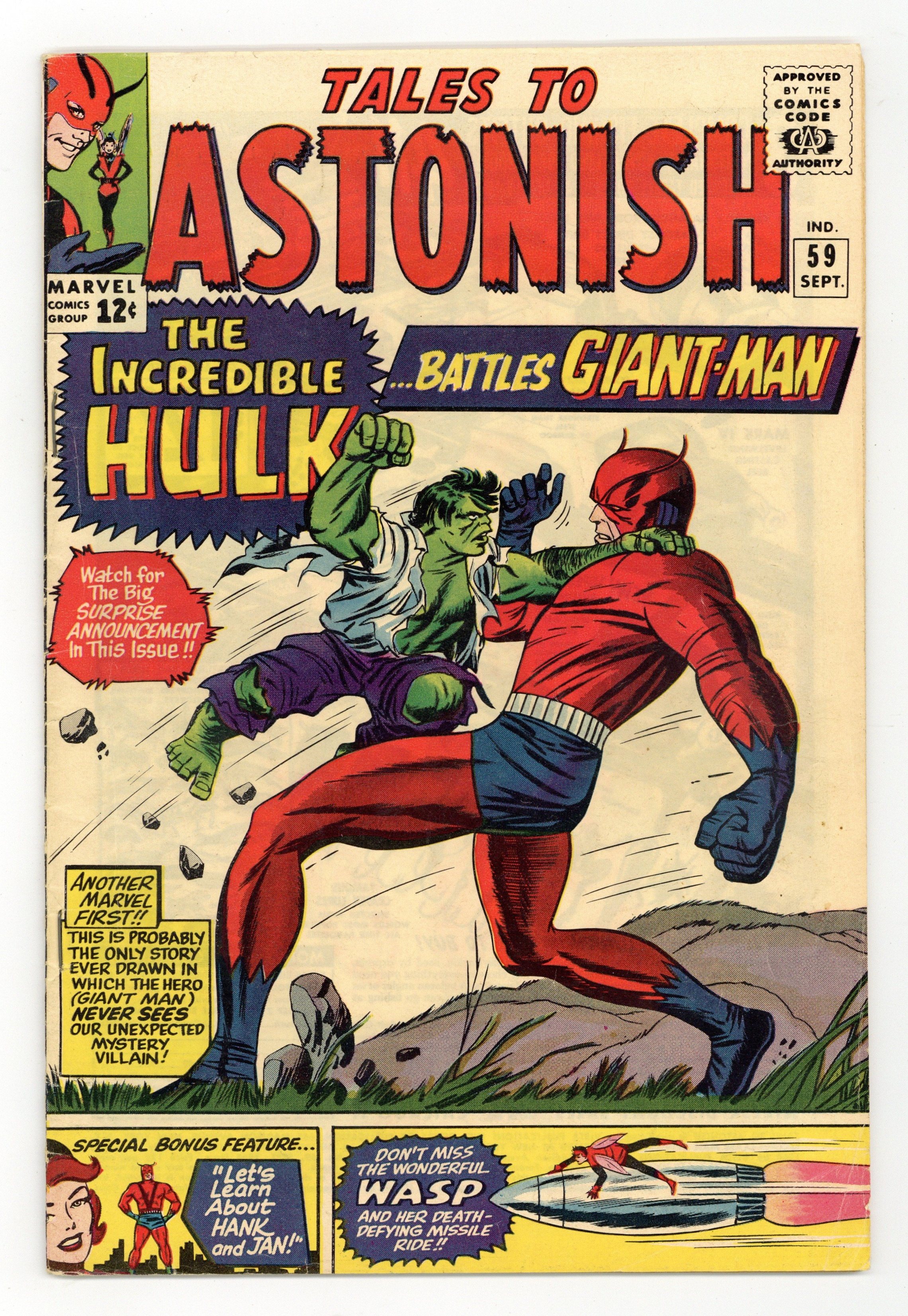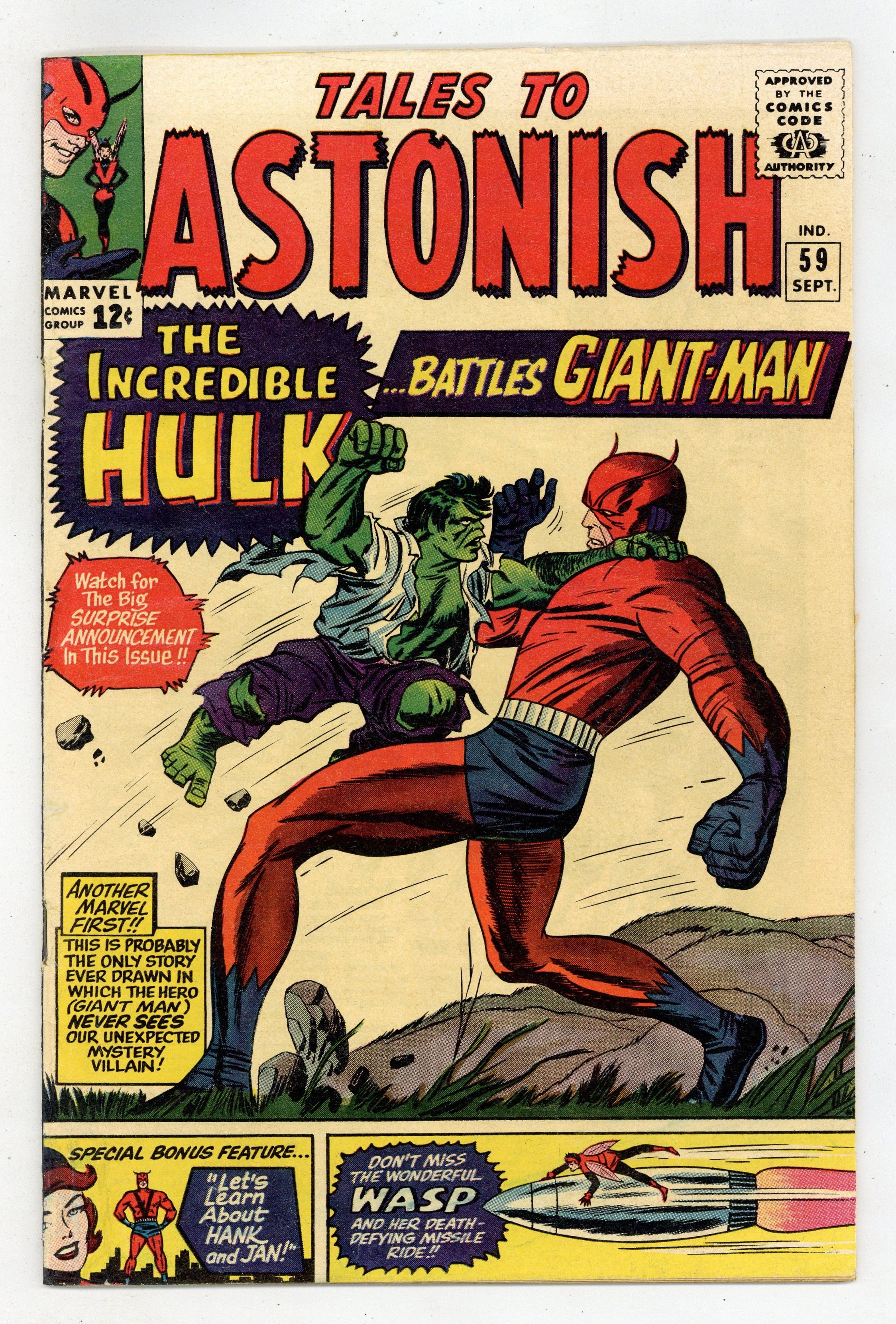 The Hulk battles Giant-Man in "Enter: The Hulk!" Script by Stan Lee, pencils by Dick Ayers, inks by Paul Reinman. Guest appearances by Thor, Iron Man, and Captain America. Spider-Man cameo. This is the Hulk's first appearance in this title. Back-up feature, "Let's Learn About Hank and Jan!" Script by Lee, pencils by Ayers, inks by Reinman. Jack Kirby/Sol Brodsky cover. 36 pgs. Cover price $0.12.
