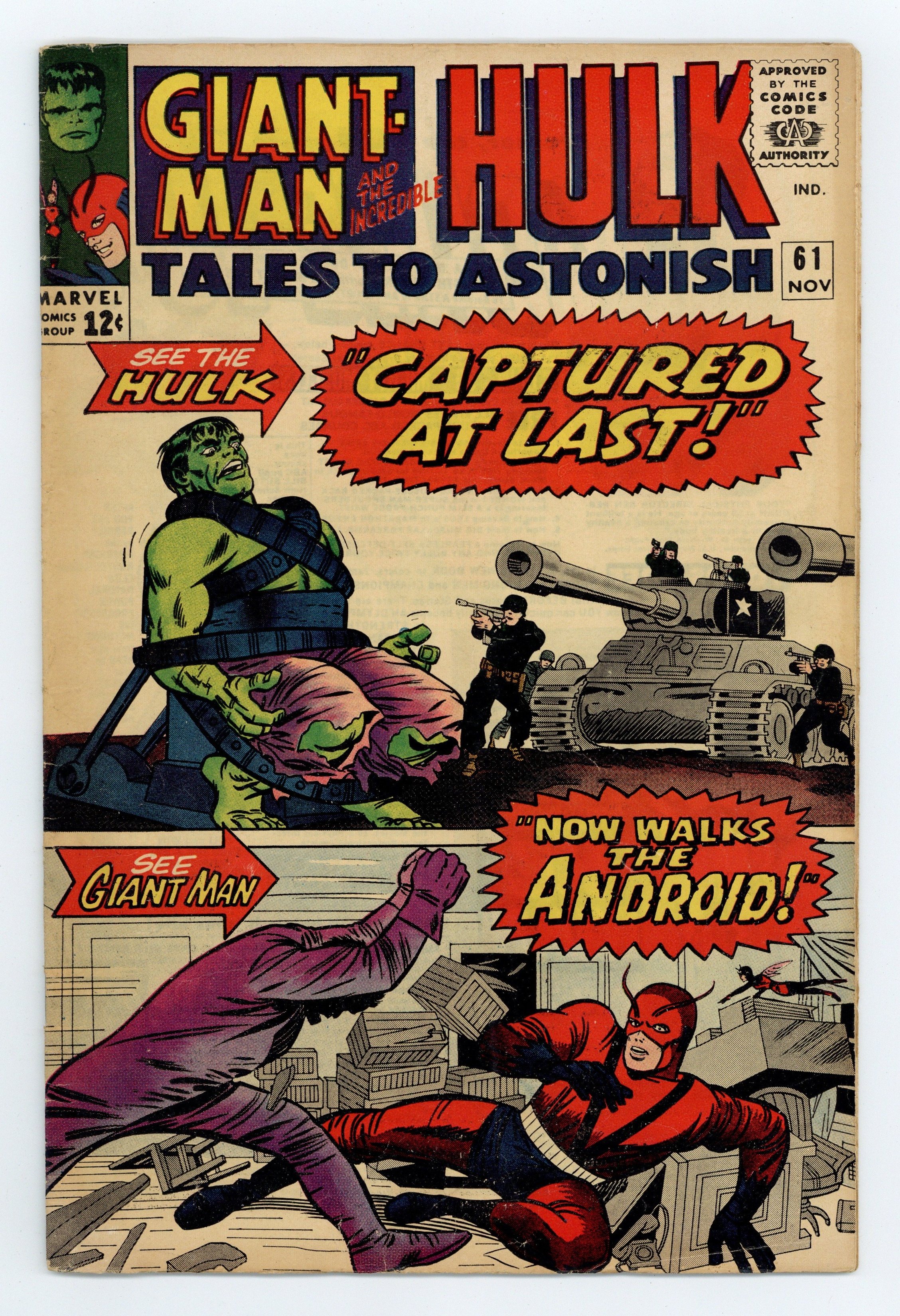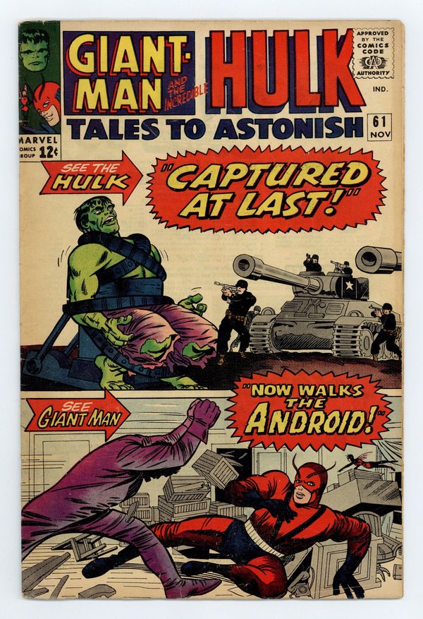 Tags: Marvel Legacy Numbering: Hulk (part 61), Hulk$24.001st appearance of Glen Talbot - Cover by Jack Kirby and Chic Stone. Now Walks the Android, script by Stan Lee, art by Steve Ditko, Joe Orlando, and George Roussos (as George Bell); Egghead uses a simple clothing store dummy to create a giant and powerful android which he plans on controlling mentally as it battles and defeats Giant-Man; He entices his arch-foe into his trap with the promise of a television series based on his heroic exploits (actually, it is Jan who is pretty keen on getting Hank into show biz). Captured at Last!, script by Stan Lee, art by Steve Ditko and George Roussos (as George Bell); The Hulk takes on the indestructable Banner created robot and, in one of the more dubious plot devices in comics, succeeds in kicking him down a bottomless hole when he realizes that he cannot beat the machine; Glenn Talbot arrives on gamma base sent by the Pentagon to keep an eye on the suspicious activity of Bruce Banner; Glenn decides that keeping an eye on Betty seems like a good idea as well. 36 pgs., full color. $0.12. Cover price $0.12.