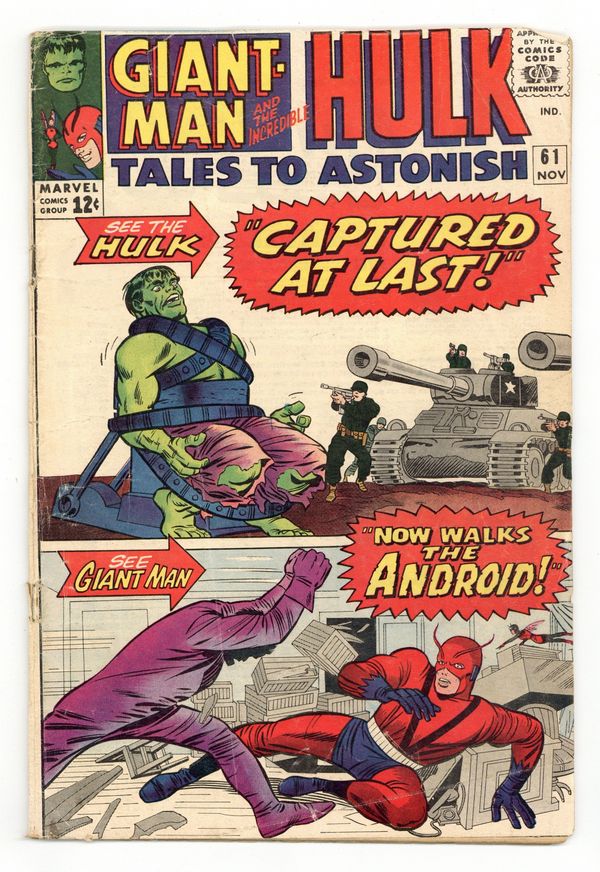 1st appearance of Glen Talbot - Cover by Jack Kirby and Chic Stone. Now Walks the Android, script by Stan Lee, art by Steve Ditko, Joe Orlando, and George Roussos (as George Bell); Egghead uses a simple clothing store dummy to create a giant and powerful android which he plans on controlling mentally as it battles and defeats Giant-Man; He entices his arch-foe into his trap with the promise of a television series based on his heroic exploits (actually, it is Jan who is pretty keen on getting Hank into show biz). Captured at Last!, script by Stan Lee, art by Steve Ditko and George Roussos (as George Bell); The Hulk takes on the indestructable Banner created robot and, in one of the more dubious plot devices in comics, succeeds in kicking him down a bottomless hole when he realizes that he cannot beat the machine; Glenn Talbot arrives on gamma base sent by the Pentagon to keep an eye on the suspicious activity of Bruce Banner; Glenn decides that keeping an eye on Betty seems like a good idea as well. 36 pgs., full color. $0.12. Cover price $0.12.