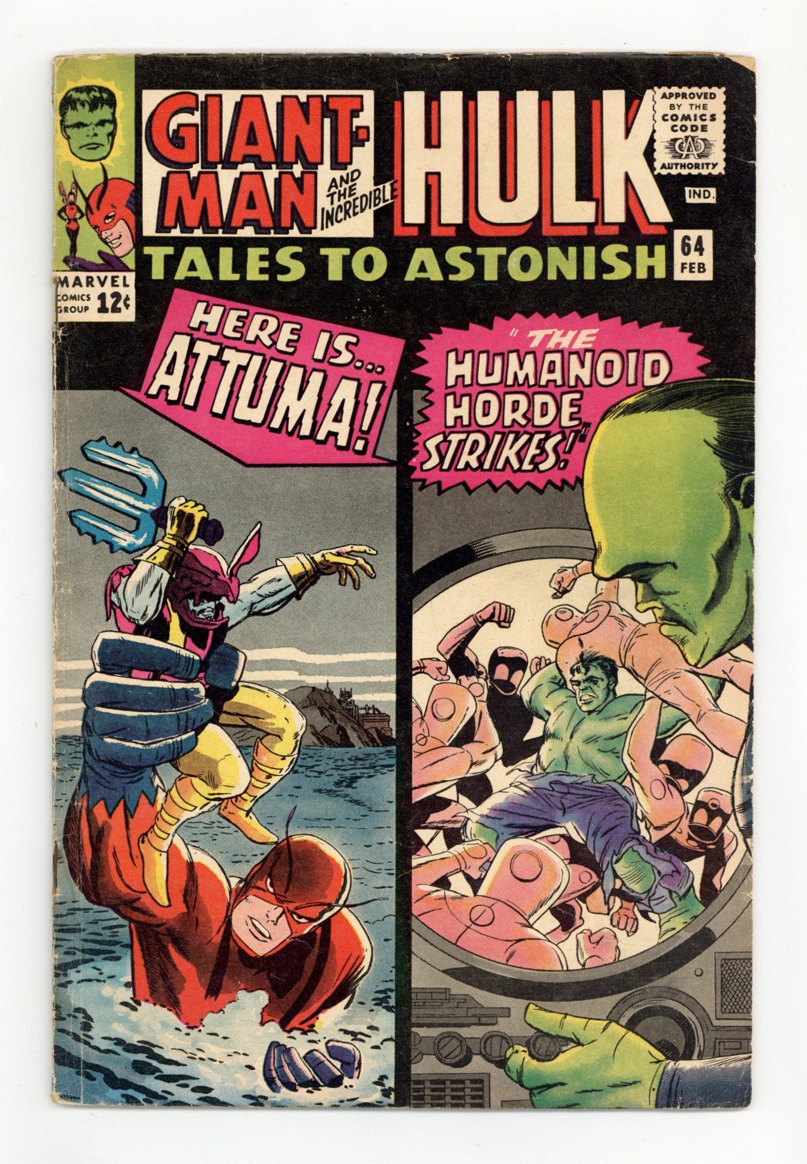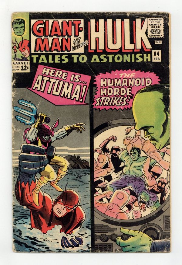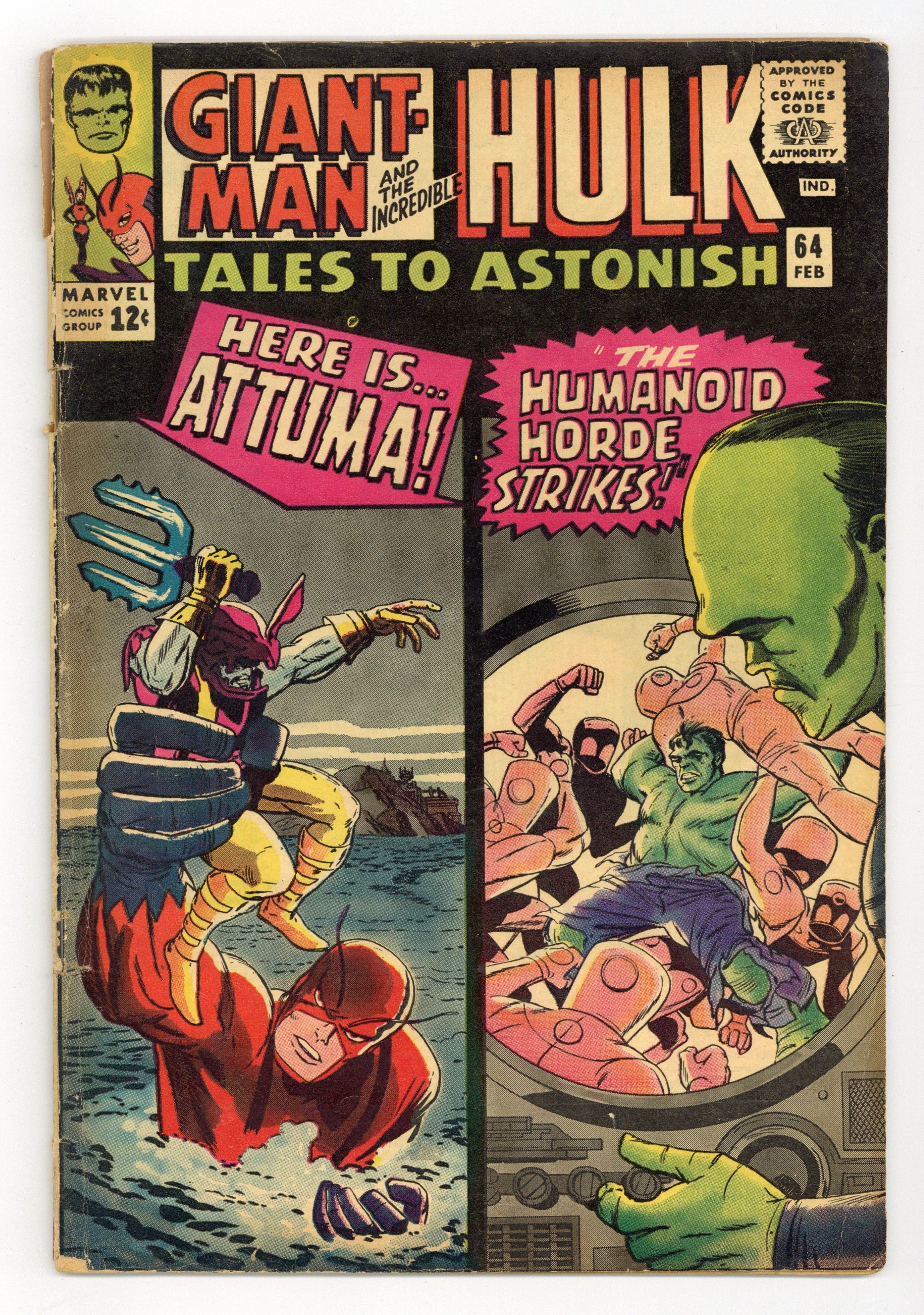 Cover by Jack Kirby and Dick Ayers. When Attuma Strikes!, script by Leon Lazarus, art by Carl Burgos and Paul Reinman; When Hank snaps at Jan for making a clumsy error during an experiment, she tearfully decides to get away from his abuse and take a trip; When her plane is captured in Attuma's latest bid for surface world conquest, a remorseful Giant-Man comes to the rescue. The Horde of Humanoids!, script by Stan Lee, art by Steve Ditko and George Roussos (as George Bell); Banner has been jailed as a traitor and is popping tranquilizers to keep himself from turning into the Hulk; Rick goes right to the commander in chief to tell the prez Banner's secret and to ask for his release; Much to Talbot's chagrin, the president orders Bruce's release and the two are sent to Astra Island to oversee testing of Banner's absorbatron which has the power to soak up a nuclear blast. 36 pgs., full color. $0.12. Cover price $0.12.
