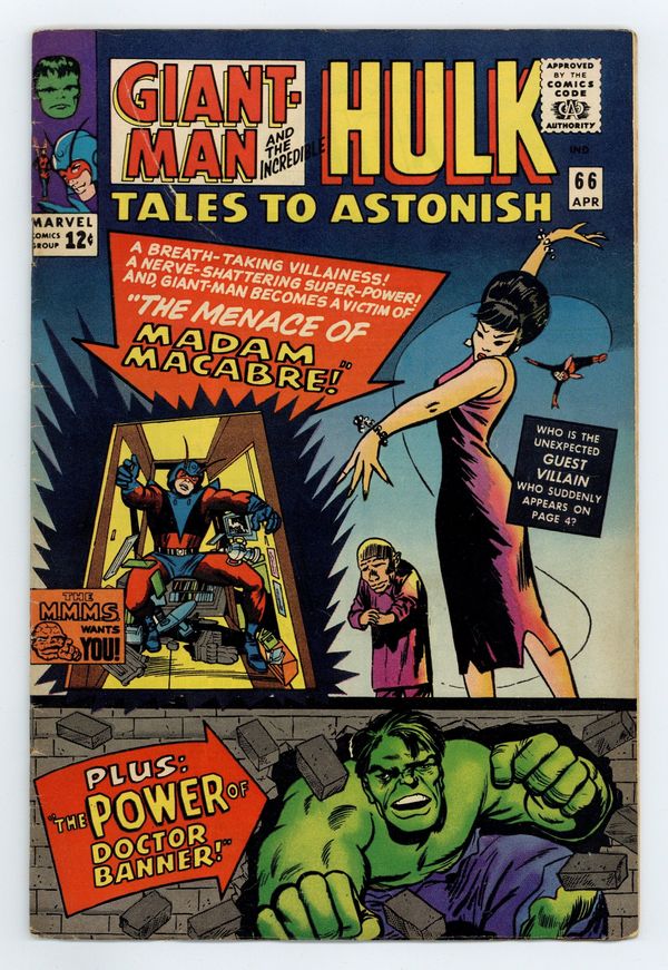 Cover by Jack Kirby, Bob Powell, and Frank Giacoia. The Menace of Madam Macabre, script by Stan Lee, art by Bob Powell and Frank Giacoia (as Frankie Ray); Giant-Man is pitted against a disciple of the Mandarin who also has the power to grow and shrink things at will. The Power of Dr. Banner!, script by Stan Lee, art by Steve Ditko and Vince Colletta; The Hulk escapes from his Russian captors with a fellow fugitive who gives his life to save the jade giant from a blast from the powerful proton gun; Angry at the death of his friend, Hulk decides to take his fight to the commies. 36 pgs., full color. $0.12. Cover price $0.12.