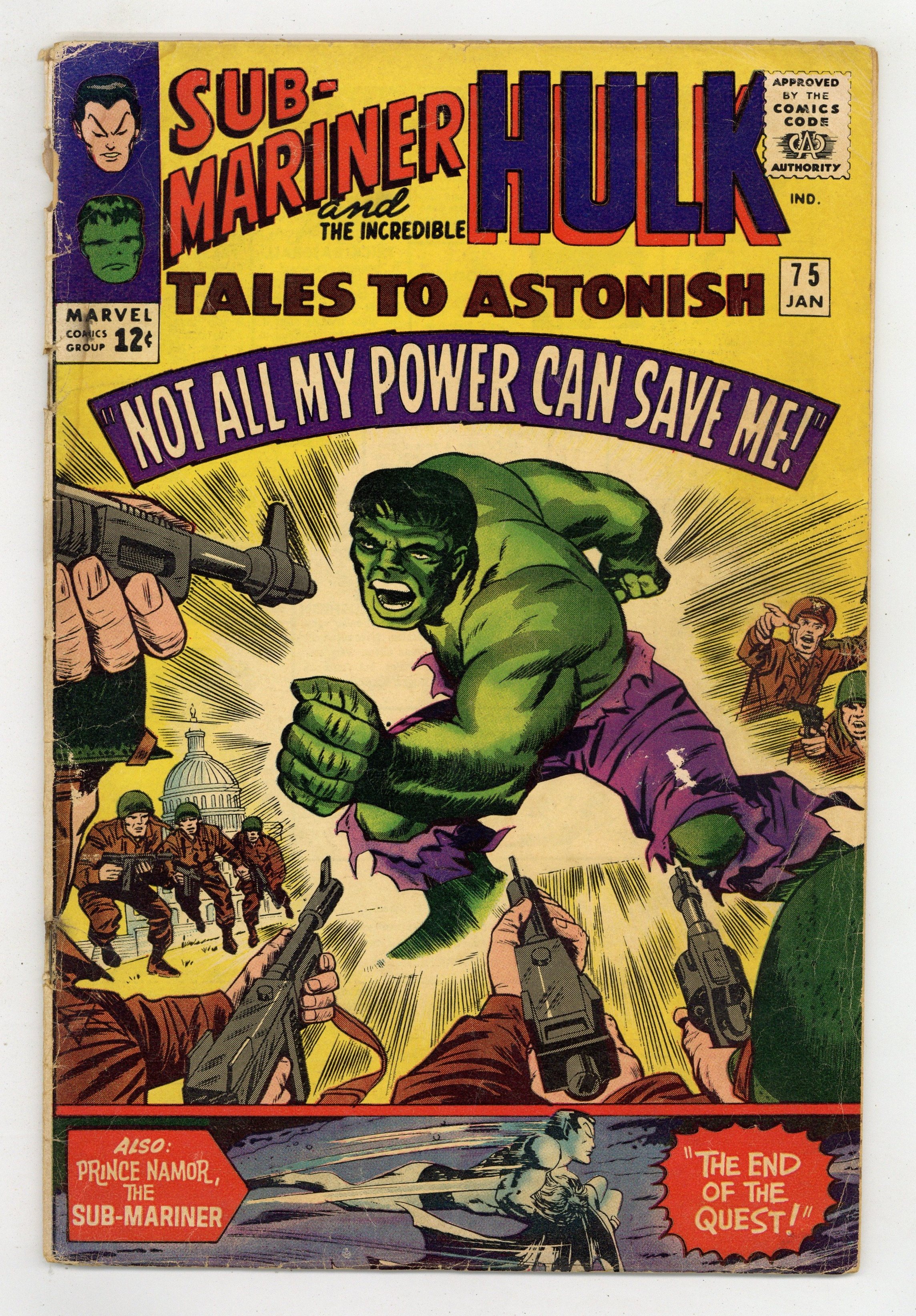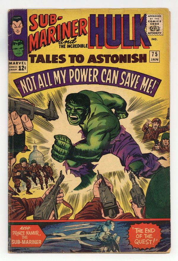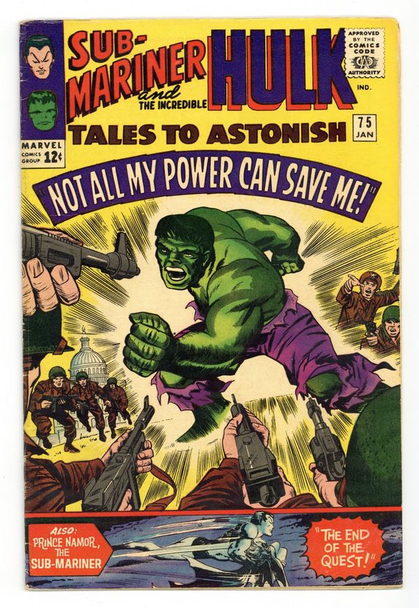 Cover by Jack Kirby, Gene Colan, Sol Brodsky, and Vince Colletta. The End of the Quest!, script by Stan Lee, art by Gene Colan (as Adam Austin) and Vince Colletta; Prince Namor returns to Atlantis to save Dorma and battle Krang. Not All My Power Can Save Me!, script by Stan Lee, art by Jack Kirby and Mike Esposito (as Mickey Demeo); With the Leader dead, the Hulk uses the Watcher's ultimate machine on himself and its only effect is to let him know that Rick has once again been captured by the miltary so they can learn the connection between Bruce Banner and the Hulk; Leaping to the rescue, Hulk is zapped by the t-gun which propels him into the future. 36 pgs., full color. $0.12. Cover price $0.12.
