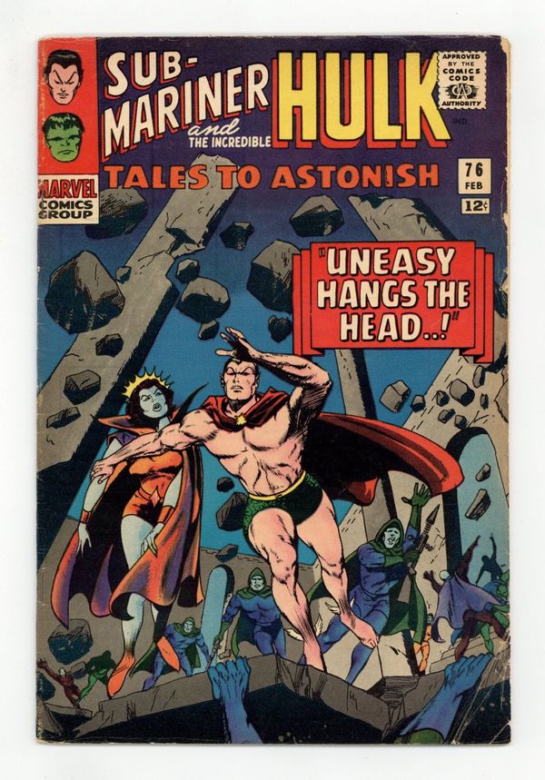 Cover by Gene Colan and Vince Colletta. Uneasy Hangs the Head..!, script by Stan Lee, art by Gene Colan (as Adam Austin) and Vince Colletta; Namor defeats Krang, reclaims the throne of Atlantis and has Krang exiled. I, Against a World!, script by Stan Lee, art by Jack Kirby, Gil Kane (as Scott Edward) and Mike Esposito (as Mickey Demeo): The Hulk has been zapped into the future by the t-gun and fights with King Arrkam's forces before he is finally overcome; Once he regains consciousness, Arrkam asks his help in fighting "The Evil One" who turns out to be none other than the Executioner. 36 pgs., full color. $0.12. Cover price $0.12.