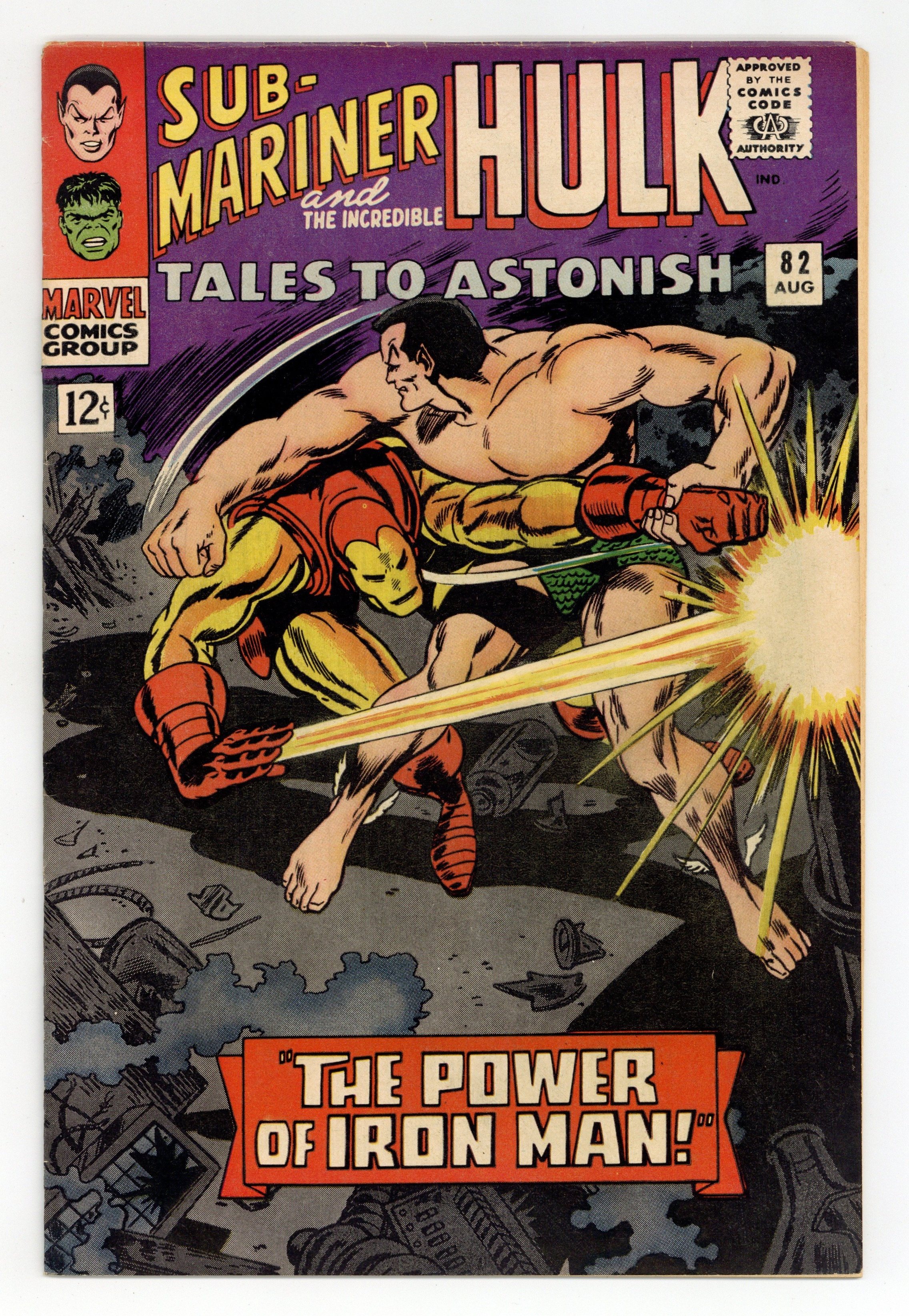 Cover by Gene Colan and Dick Ayers. The Power of Iron Man!, script by Stan Lee and Roy Thomas, art by Gene Colan, Jack Kirby, and Dick Ayers; Namor and Iron Man beat up on each other; Namor abandons the battle when he spots the battle cruiser of Krang floating the water nearby. The Battle Cry of the Boomerang!, script by Stan Lee, art by Jack Kirby and Bill Everett; The Hulk saves Betty from Boomerang and in so doing thwarts the initial plans of the Secret Empire in stealing the secret of the deadly Orion missile. 36 pgs., full color. $0.12. Cover price $0.12.