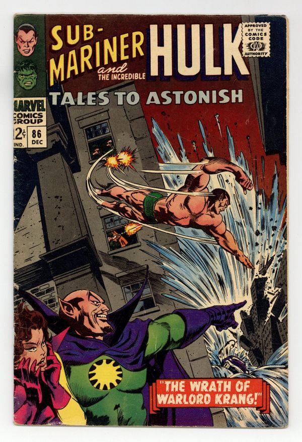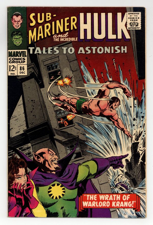 $13.00Cover by Gene Colan and Bill Everett. The Wrath of Warlord Krang!, script by Stan Lee, art by Jerry Grandenetti and Bill Everett; Krang sends a giant tidal wave to devastate New York City and then makes an anonymous tip to the Army to tell them that Namor is the culprit. The Birth...of the Hulk-Killer!, script by Stan Lee, art by John Buscema and Mike Esposito (as Mickey Demeo); Banner is hanging on the Orion missile heading for the heart of New York City and is able to change its course before he transforms to the Hulk once again; Military genius that he is, Ross thinks that it is the Hulk who tried to blow up New York and activates the Leader's most powerful Humanoid robot to take on the jade giant. 36 pgs., full color. $0.12. Cover price $0.12.