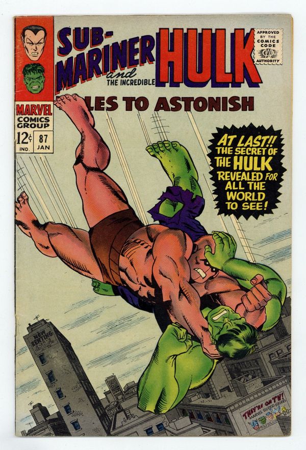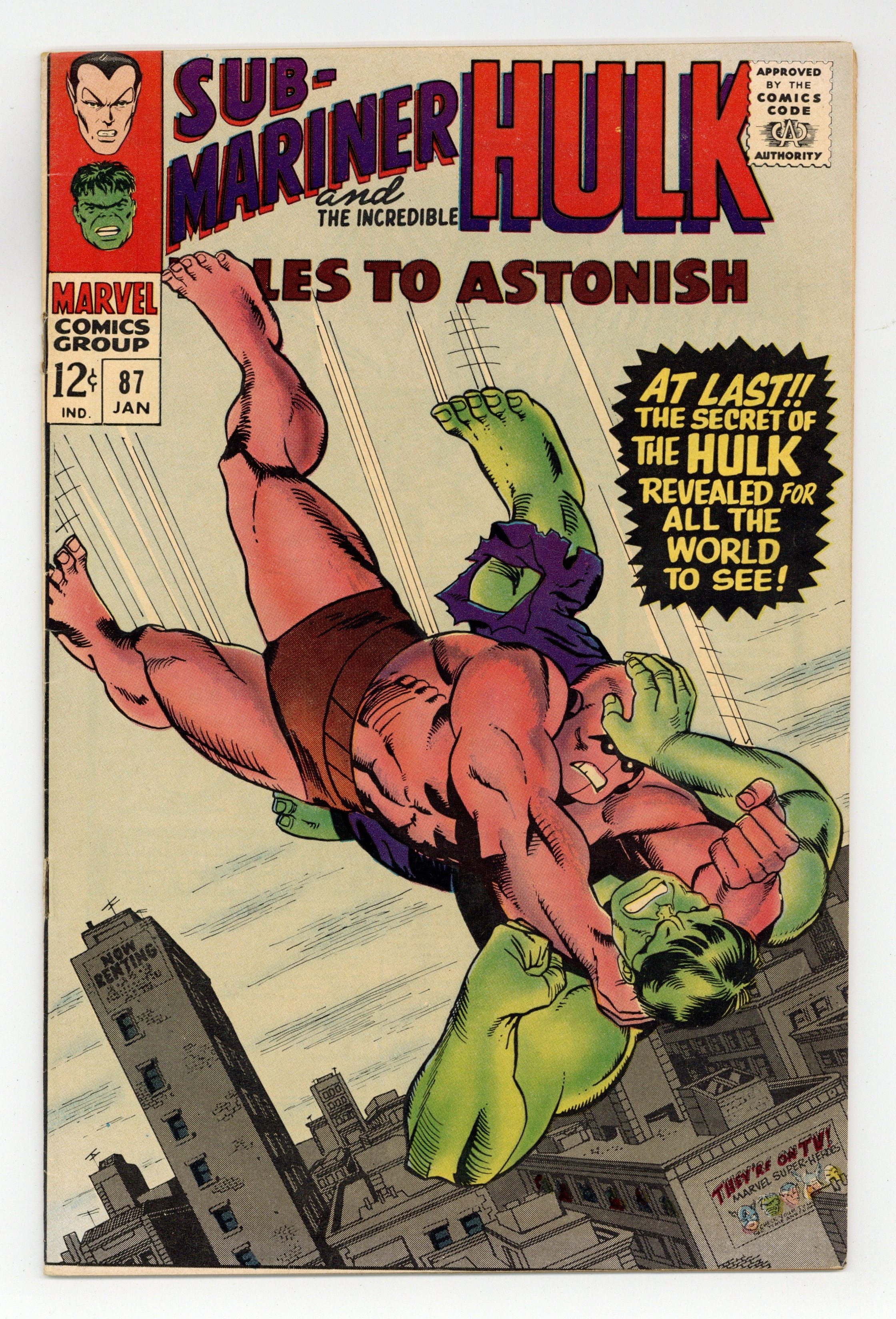 Cover by Gil Kane. Moment of Truth!, script by Stan Lee, art by Bill Everett, Frank Giacoia, and Dick Ayers; Namor brings Krang and Dorma back to Atlantis to face judgment; To settle the question of leadership once and for all, Namor decides to battle Krang in front of his assembled subjects; So his extraordinary powers do not give him an unfair advantage, Namor battles unarmed while Krang is permitted to use any weapons that he chooses; Even armed to the teeth, Krang is unable to defeat the avenging son. The Humanoid and the Hero!, script by Stan Lee, art by John Buscema and Mike Esposito; The Hulk battles the Leader's Hulk-Killer Humanoid as Ross and his cronies learn that they sent the deadly android after the jade giant for all the wrong reasons; Boomerang gets a new costume. 36 pgs., full color. $0.12. Cover price $0.12.