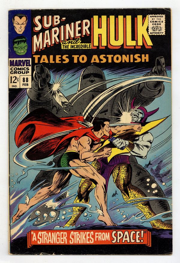 Cover by Gene Colan and Bill Everett. A Stranger Strikes from Space!, script by Stan Lee, art by Bill Everett; A giant alien robot accidentally falls out of a passing spaceship and into the lap of Attuma in depths of the ocean; He decides to use this turn of good fortune to destroy Namor and Atlantis. Boomerang and the Brute!, script by Stan Lee, art by Gil Kane; Since they have discovered that the Hulk is not the total villain he has been painted to be, the president tells Ross to pardon him if he thinks the threat is over; Of course, Boomerang picks that exact moment to secretly enrage the jade giant, causing him to go on another rampage and causing Ross to still see him as a menace; Hulk fights the new and improved (but still fashion-impaired) Boomerang. 36 pgs., full color. $0.12. Cover price $0.12.
