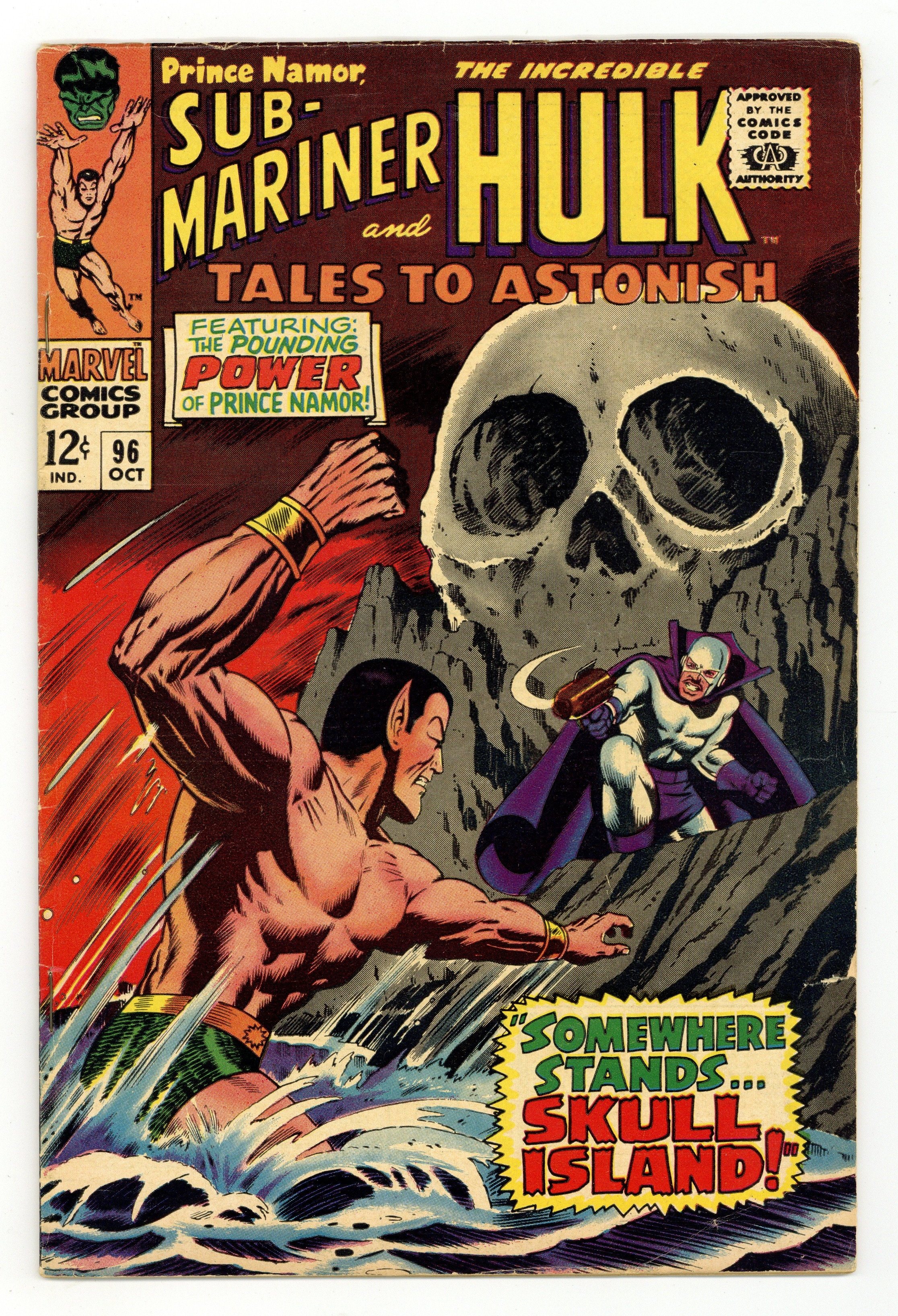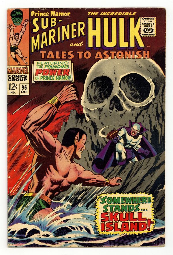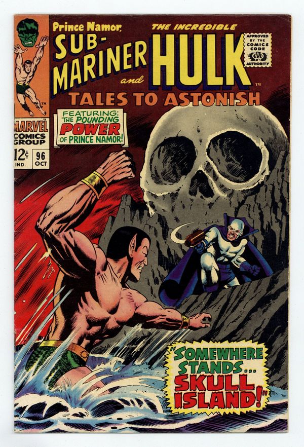 Cover by Dan Adkins. Somewhere Stands... Skull Island!, script by Raymond Marais, art by Bill Everett, Werner Roth, and Vince Colletta; Before conducting war against the surface-dweller, Namor visits the Savage Land beneath the continent of Antarctica; Dorma, against orders, follows behind him. Meanwhile the Plunderer, unknown to the Atlanteans, has constructed a base on Skull Island and as Namor and Dorma approach, fires on them; Namor is captured while Dorma flees back to Atlantis. What Have I Created?, script by Stan Lee, art by Marie Severin and Herb Trimpe; With Banner trapped and about to be evolved by the High Evolutionary, the New Men attack and stop the experiment; Banner becomes the Hulk and fights the New Men and the Evolutionary decides that the only way to stop his former creations is to do to himself what he planned on doing to Banner--evolving himself a thousand years into humanity's future. 36 pgs., full color. $0.12. Cover price $0.12.