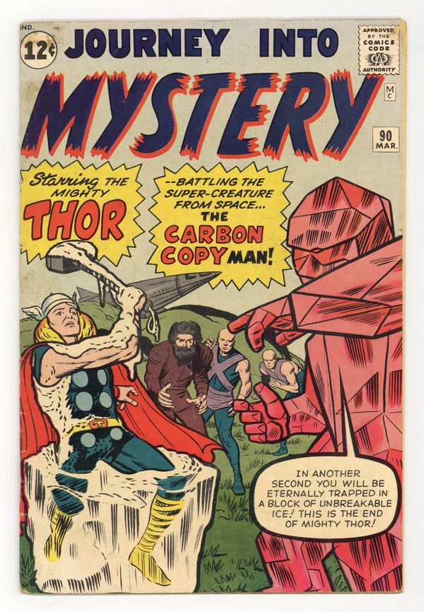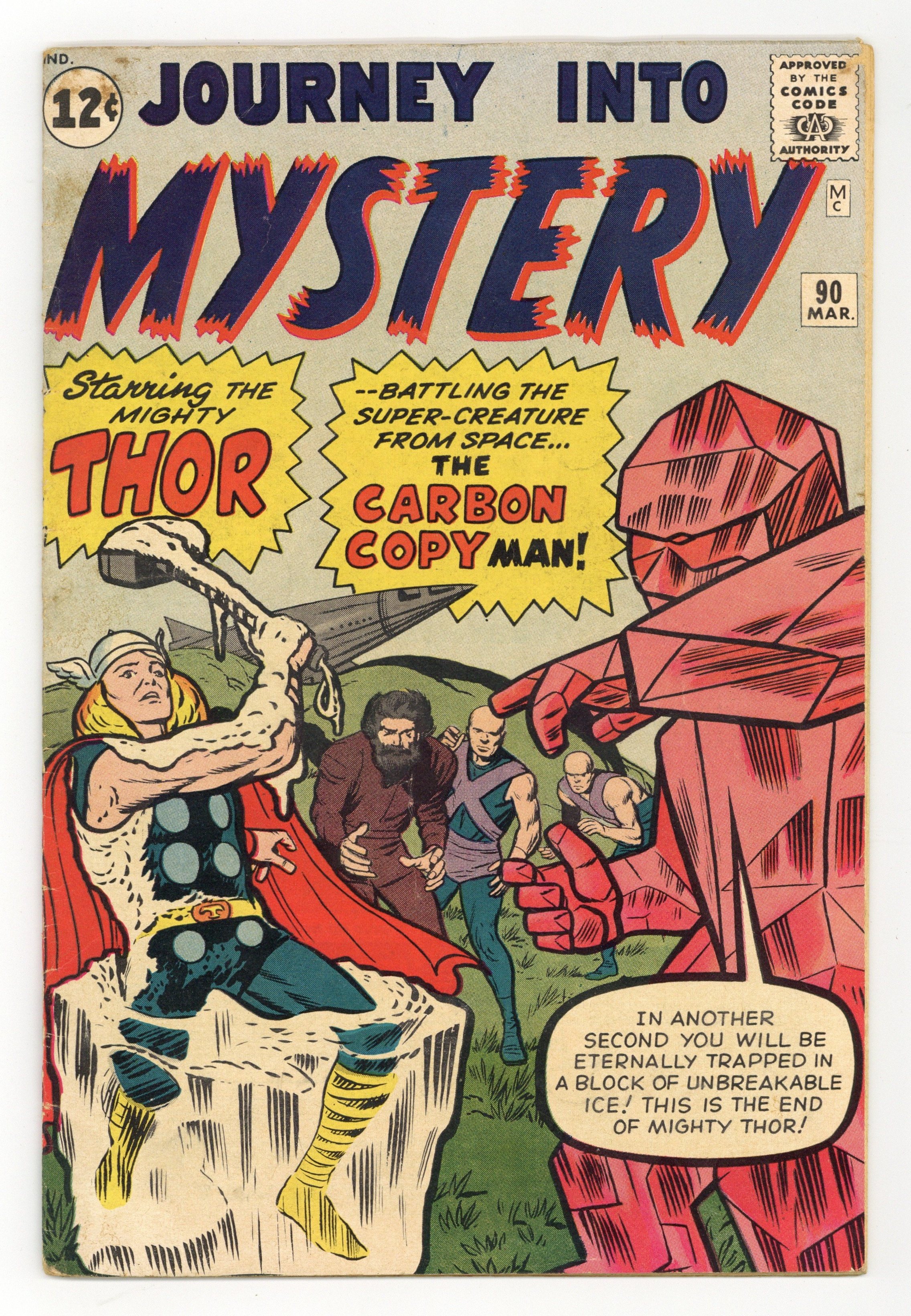 Cover pencils by Jack Kirby, inks by Dick Ayers. "Trapped By the Carbon-Copy Man!", script by Stan Lee (plot) and Larry Lieber (script), art by Al Hartley; The heir to the throne of a race of shape-shifting aliens leads an attack on Earth as his rite of passage; The aliens replace officials in New York and disrupt the government, but Thor discovers their plan and defeats them. "Mystery Mansion" text story. "The Midnight Caller!", script by Stan Lee, art by Steve Ditko; In a communist bloc country a fugitive seeks shelter from an elderly couple who grant it to him; The next day they find their shack has been transplanted outside of the iron curtain and repaired to look as new; They regard the event as impossible but their guest says he was merely repaying the kindness shown to a stranger and is revealed to be an angel who was traversing the communist-occupied country for an unknown reason and then he ascends back to heaven. "I Am A Robot!", script by Stan Lee (plot) and Larry Lieber (script), art by Joe Sinnott; A criminal steals an advanced robot and uses it to rob a bank, but when he orders it to guard the door of his hideout an error in wording traps him inside permanently. 36 pgs., full color. Cover price $0.12.