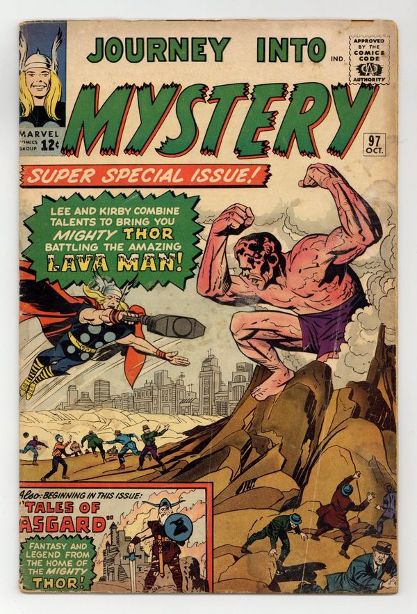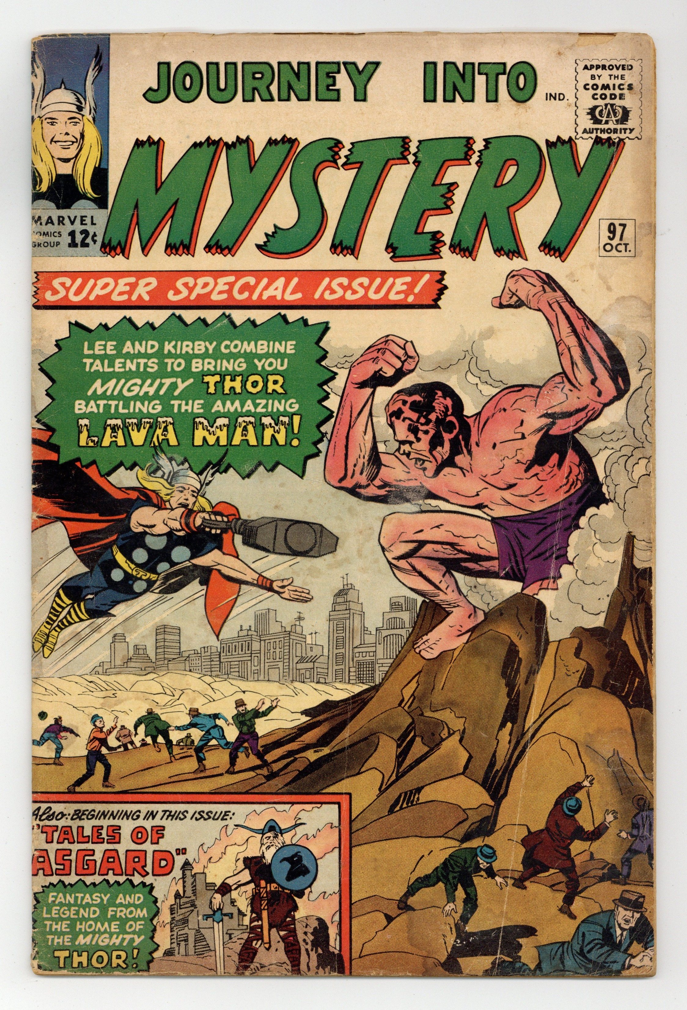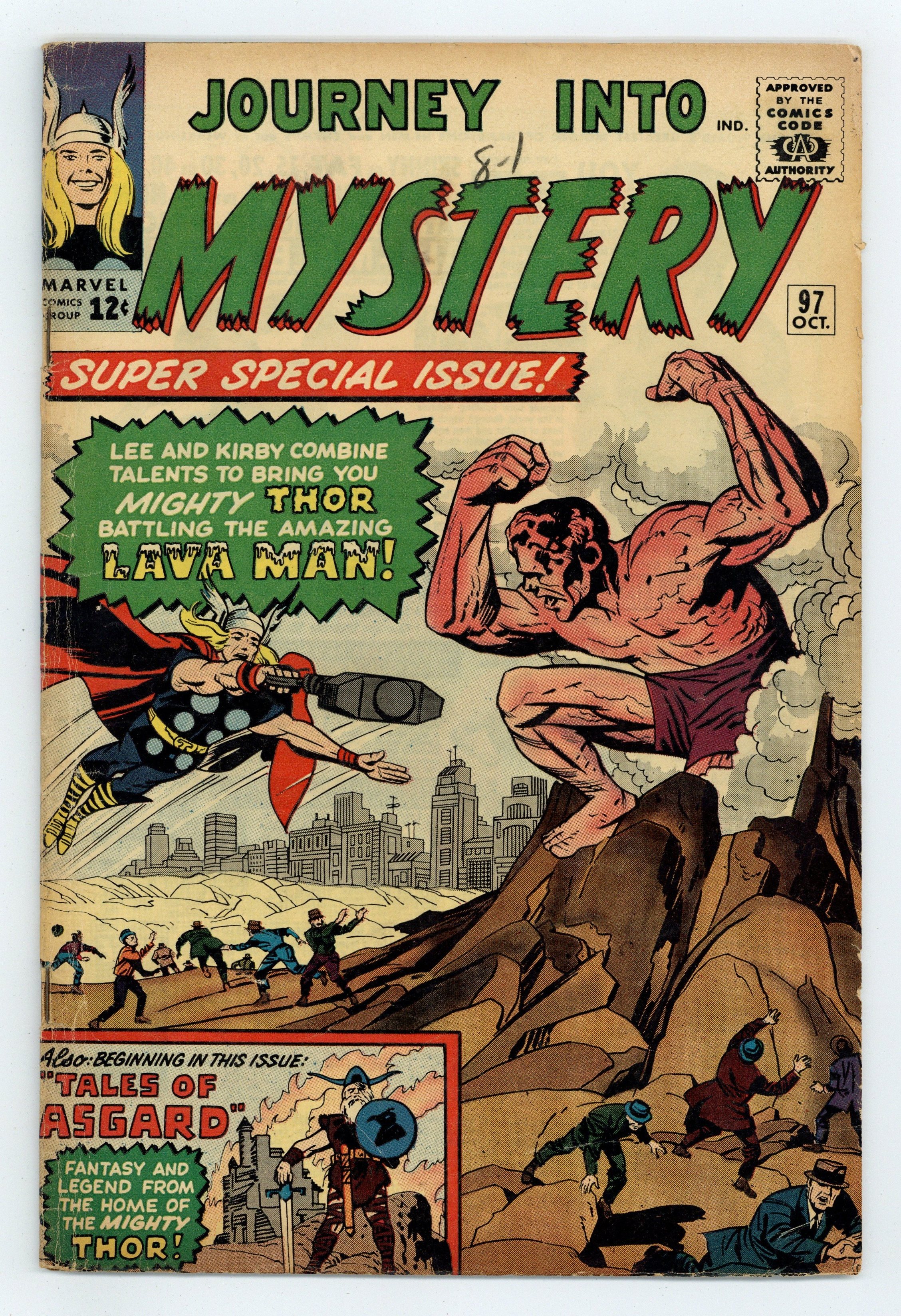 Cover pencils by Jack Kirby, inks by George Roussos. First appearance of the Lava Man in "The Mighty Thor Battles the Lava Man!", script by Stan Lee, pencils by Jack Kirby, inks by Don Heck; Thor battles the Lava Man, a monster brought to the surface by Loki, who claims all the dry surface of Earth for his people; Odin forbids Thor to love Jane Foster, leading to her leaving her job as Dr. Blake's nurse. "The Traveler" text story. "The Perfect Defense!", script by Stan Lee (plot) and Larry Lieber (script), pencils by Larry Lieber, inks by George Roussos (as George Bell); In the future, Earth has conquered all planets except one, which no expedition returns from; The military thinks they have some horrific defense, but in fact they are simply so kind to the humans that arrive to conquer that they don't want to leave. "Tales of... ...Asgard! Home of the Mighty Norse Gods," script by Stan Lee, pencils by Jack Kirby, inks by George Roussos (as G. Bell); Beneath Asgard lies the Well of Life. From it came Ymir, greatest of the Frost Giants and Buri, the first Norse God who gave life to Borr. Borr had three sons. Odin was one of them. 36 pgs., full color. Cover price $0.12.