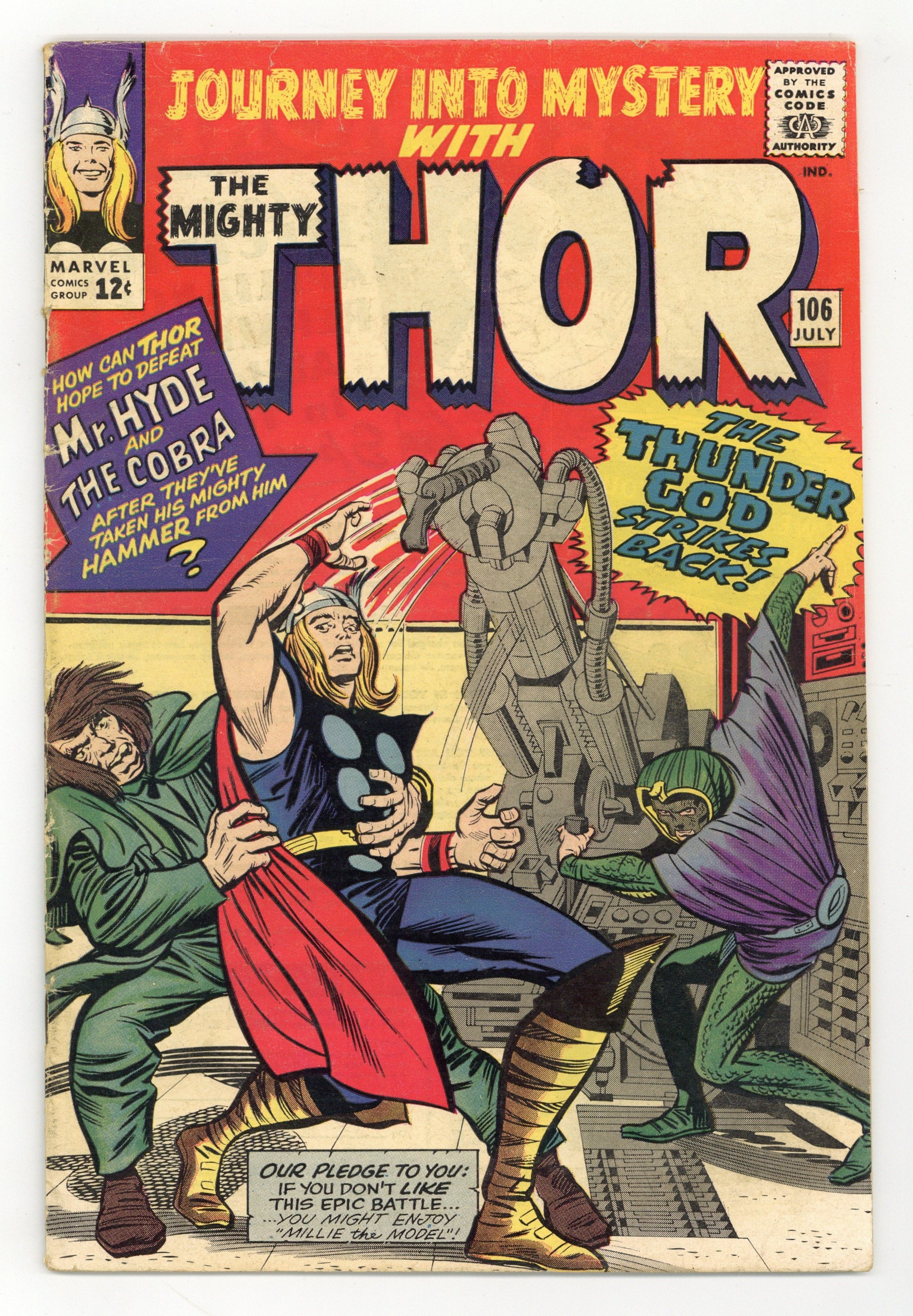 Cover pencils by Jack Kirby, inks by Chic Stone. Thor's battle against the Cobra and Mr. Hyde continues in "The Thunder God Strikes Back!", script by Stan Lee, pencils by Jack Kirby, inks by Chic Stone; Thor evades the villains and transforms back into Dr. Blake, then pretends to betray Thor in order to get his cane back; He becomes Thor and defeats the Cobra easily, though Hyde escapes by becoming Calvin Zabo and slipping away; Hyde attacks Thor later, but is defeated; When Blake returns to the office he discovers that Jane hates him because of his seeming betrayal of Thor. The Mighty Thor Also Appears In...The Avengers comic book ad. "Tales of Asgard" back-up, "Balder the Brave!", script by Stan Lee, pencils by Jack Kirby, inks by Vince Colletta; Odin orders Balder executed for leaving a battle to rescue a fallen bird, but Balder is so beloved that the animals and plants keep any harm from coming to him, and Odin makes him invincible; Origin of Balder. Second half of a two-page text story, "Marauder." 36 pgs., full color. Cover price $0.12.