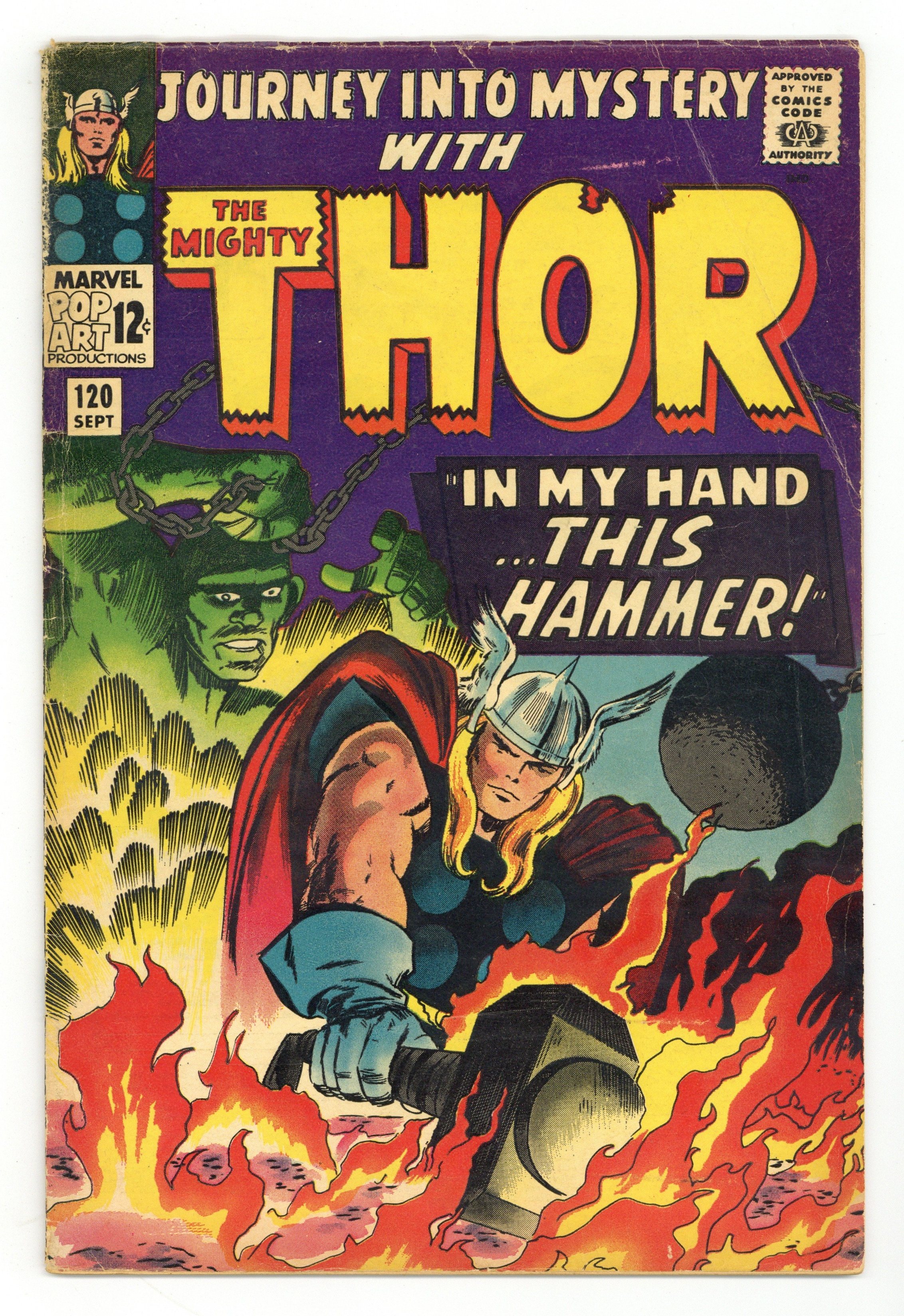 Tags: Marvel Legacy Numbering: Thor (part 120), Thor$21.00Cover pencils by Jack Kirby, inks by Vince Colletta. "With My Hammer In Hand...!", script by Stan Lee, pencils by Jack Kirby, inks by Vince Colletta; Thor reforges Mjolnir, returns to Asgard with the Norn Stones, and is declared the victor in the contest with Loki; But Thor cannot long endure the peacefulness of Asgard and begs Odin to send him back to Earth; On Earth, Thor finds Dr. Blake's office deserted and in disarray, with bills unpaid for weeks, and Jane Foster nowhere to be found!; Loki, meanwhile, has overthrown the warlock Ularic. Tales of Asgard tale: "Set Sail!", script by Stan Lee, pencils by Jack Kirby, inks by Vince Colletta; Thor leads the Asgardian gods on a voyage into unknown territory to discover what has cracked the Oversword. The Merry Marvel Bullpen Page. 36 pgs., full color. $0.12. Cover price $0.12.