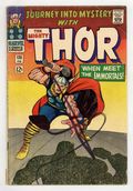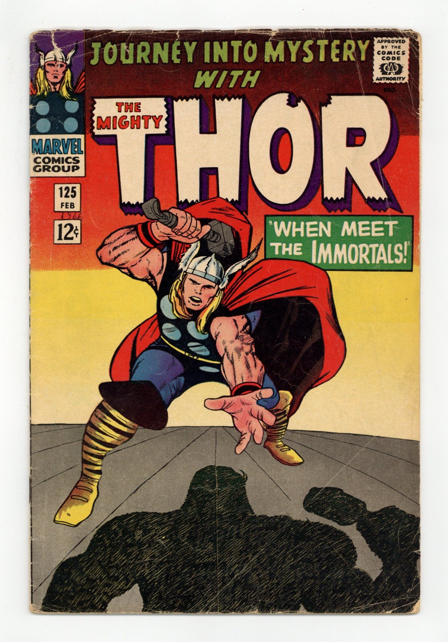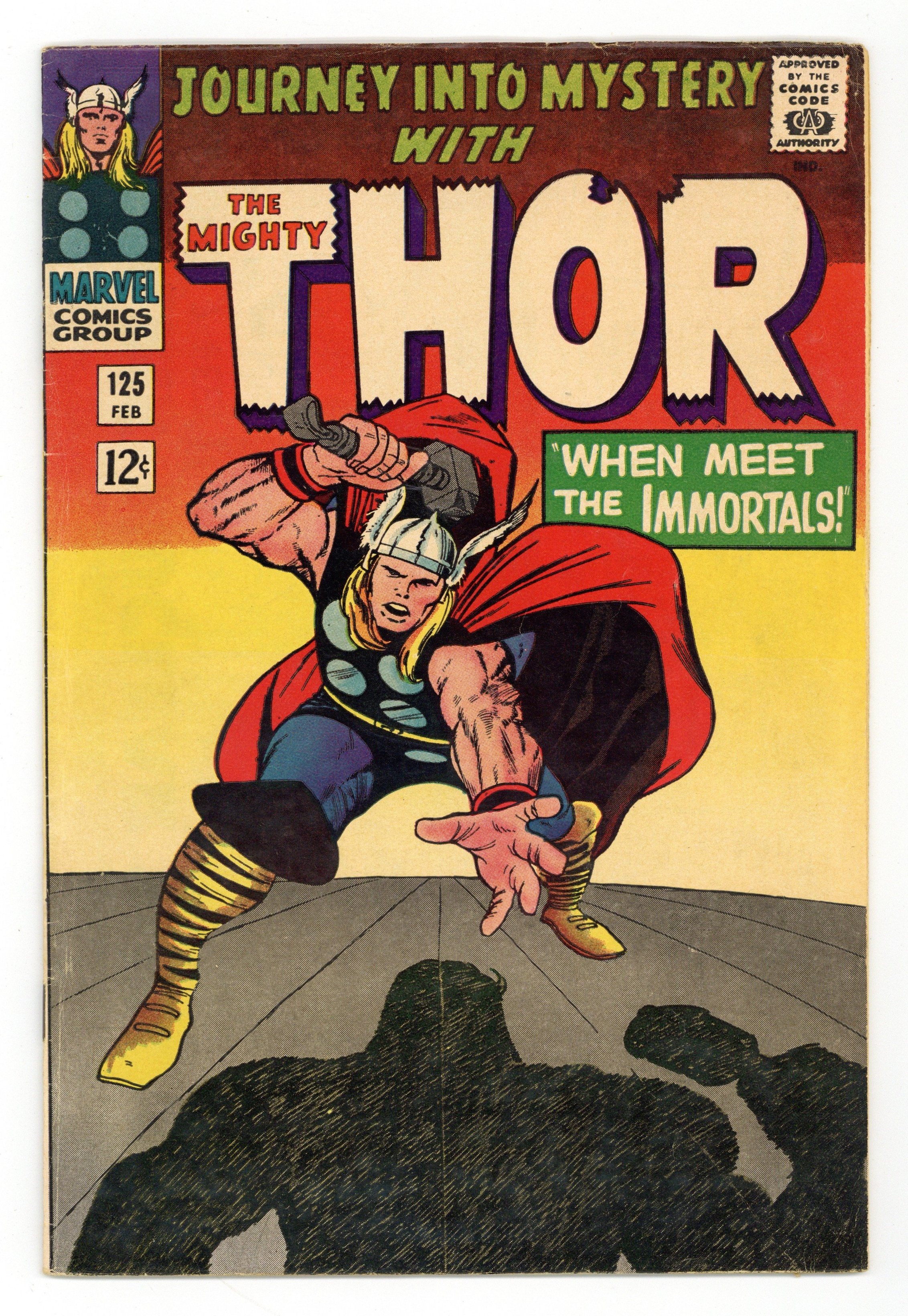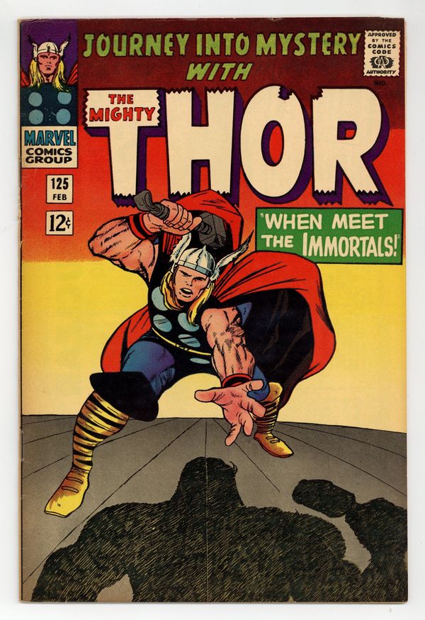 Cover pencils by Jack Kirby, inks by Vince Colletta. "When Meet the Immortals!", script by Stan Lee, pencils by Jack Kirby, inks by Vince Colletta; Thor grapples with "The Demon" to recover the Norn Stone, while Hercules blunders about the world of Man, crossing paths with Jane Foster. Marvel Bullpen Bulletins. Tale of Asgard: "The Queen Commands," script by Stan Lee, pencils by Jack Kirby, inks by Vince Colletta; Thor's plans for a peaceful parlay with the Flying Trolls is dashed when Loki unleashes a poison gas on them! Ad for Hulk Sweat Shirt, Spider-Man Pin-Up, Super-Hero Stationery Kit, and Thor T-Shirt. 36 pgs., full color. $0.12. Cover price $0.12.