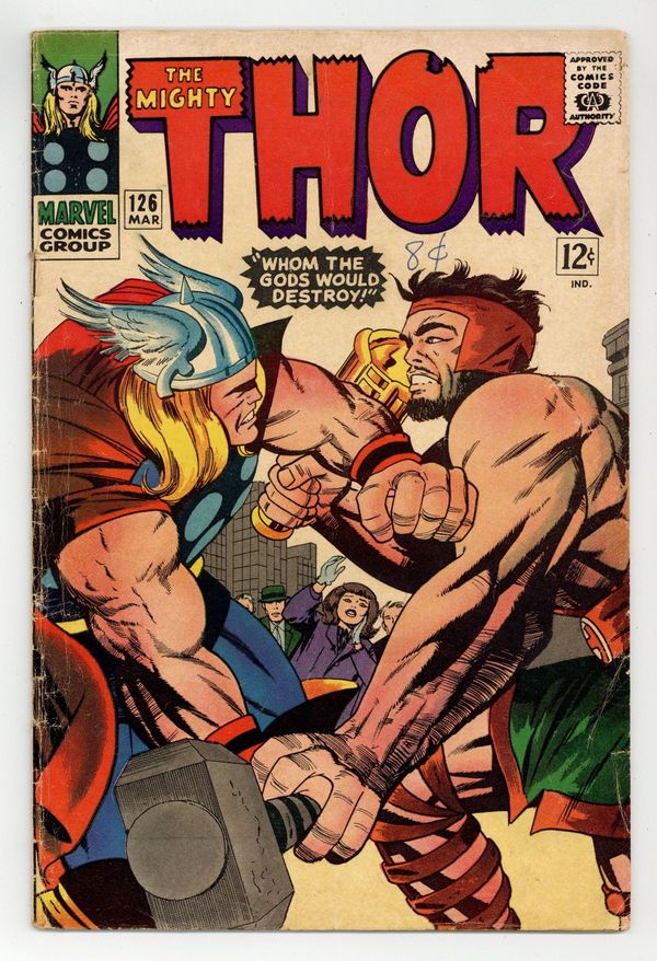 Ends Dec 8 9:42 PM CST Bid History 6 bids Current Bid $43 Your Secret Max Bid If you'd like to bid, please log in or register. Title becomes Thor; previously Journey Into Mystery. Cover pencils by Jack Kirby, inks by Vince Colletta. "Whom the Gods Would Destroy!", script by Stan Lee, pencils by Jack Kirby, inks by Vince Colletta; Thor and Hercules fight over Jane Foster; Odin, still angry because Thor revealed his identity to Jane, removes half Thor's powers by giving 'Odin Power' to Seidring. Hercules defeats Thor. Marvel Bullpen Bulletins. Tale of Asgard: "The Summons!", script by Stan Lee, pencils by Jack Kirby, inks by Vince Colletta; The Argonauts are called home to Asgard by Odin. Appearances by Balder, Hogun, Fandral, Volstagg, and Odin. The letters page contains a statement of ownership, management and circulation: average print run 377,663; average paid circulation 232,644. 36 pgs., full color. $0.12. Cover price $0.12.