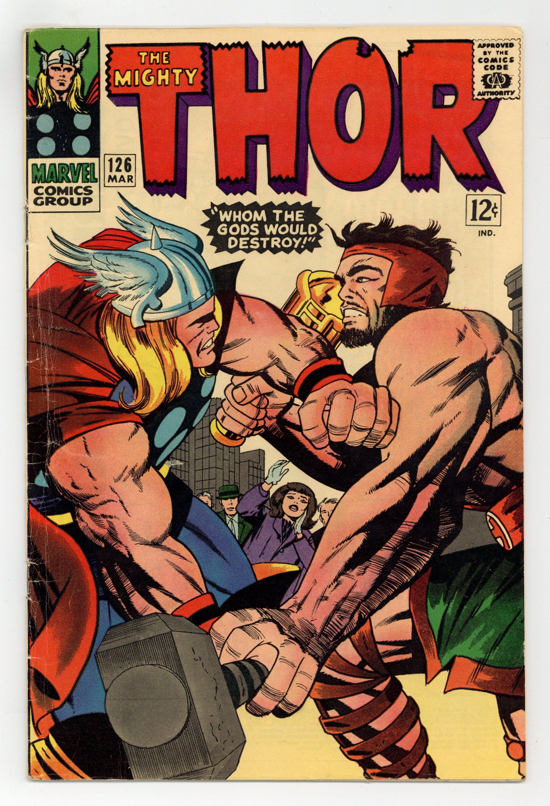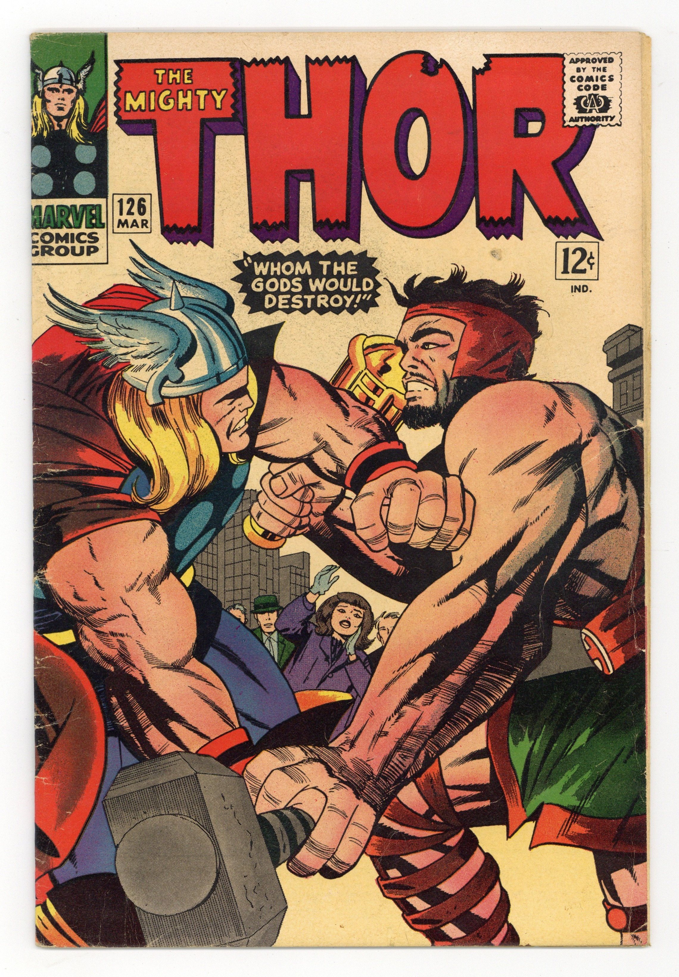 Title becomes Thor; previously Journey Into Mystery. Cover pencils by Jack Kirby, inks by Vince Colletta. "Whom the Gods Would Destroy!", script by Stan Lee, pencils by Jack Kirby, inks by Vince Colletta; Thor and Hercules fight over Jane Foster; Odin, still angry because Thor revealed his identity to Jane, removes half Thor's powers by giving 'Odin Power' to Seidring. Hercules defeats Thor. Marvel Bullpen Bulletins. Tale of Asgard: "The Summons!", script by Stan Lee, pencils by Jack Kirby, inks by Vince Colletta; The Argonauts are called home to Asgard by Odin. Appearances by Balder, Hogun, Fandral, Volstagg, and Odin. The letters page contains a statement of ownership, management and circulation: average print run 377,663; average paid circulation 232,644. 36 pgs., full color. $0.12. Cover price $0.12.