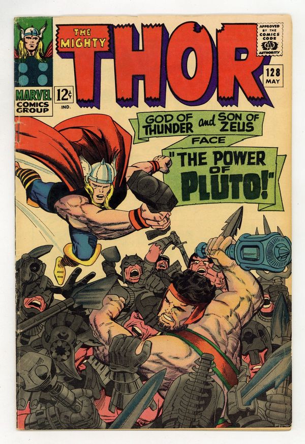 Cover pencils by Jack Kirby, inks by Vince Colletta. "The Power of Pluto!", script by Stan Lee, pencils by Jack Kirby, inks by Vince Colletta; Thor recovers from his injuries last issue and goes looking for a rematch with Hercules who has been tricked into signing a contract with Pluto. Appearances by Odin, Balder, and Volstagg. Tale of Asgard: "Aftermath!", script by Stan Lee, pencils by Jack Kirby, inks by Vince Colletta; The Asgardian gods deliberate over the coming of Ragnarok. Appearance by Odin; cameos by Balder, Hogun, Fandral, and Volstagg. 36 pgs., full color. $0.12. Cover price $0.12.