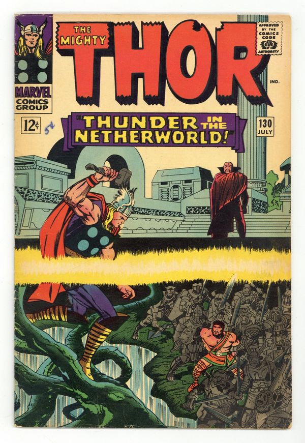 $19.25Cover pencils by Jack Kirby, inks by Vince Colletta. "Thunder in the Netherworld!", script by Stan Lee, pencils by Jack Kirby, inks by Vince Colletta; Thor does so much damage to Hades that Pluto gives in and releases Hercules from the contract; Tana sends Jane away wandering. Appearance by Jane Foster. Marvel Bullpen Bulletins. Tale of Asgard: "The Fateful Change!", script by Stan Lee, pencils by Jack Kirby, inks by Vince Colletta; Thor defeats Harokin and discovers they are nearly identical in appearance; The Warriors Three free Asgard's defenders from Harokin's dungeons. Ad for Thing Sweat Shirt and Hulk Sweat Shirt. Ad for Marvel Comics Group Official Swingin' Stationery, Thor T-Shirt, and Spider-Man Poster. The M.M.M.S. Still Wants You! ad. 36 pgs., full color. $0.12. Cover price $0.12.