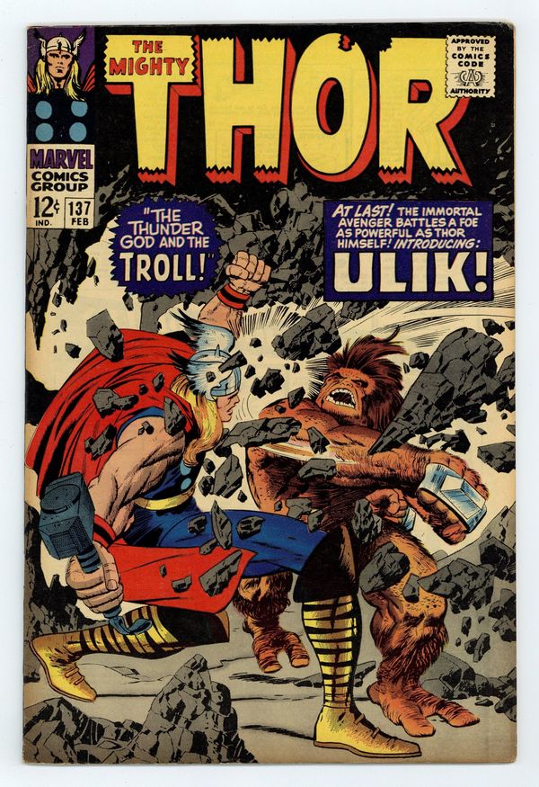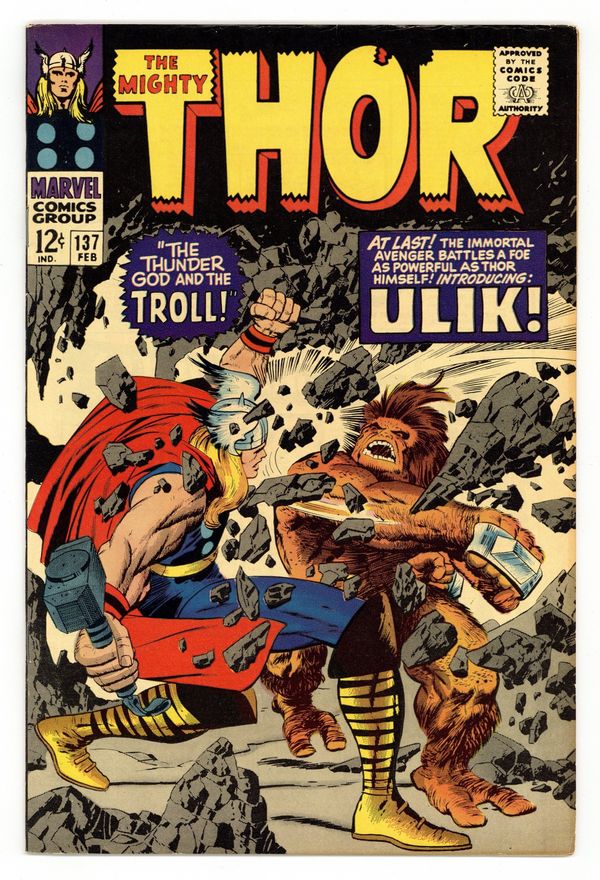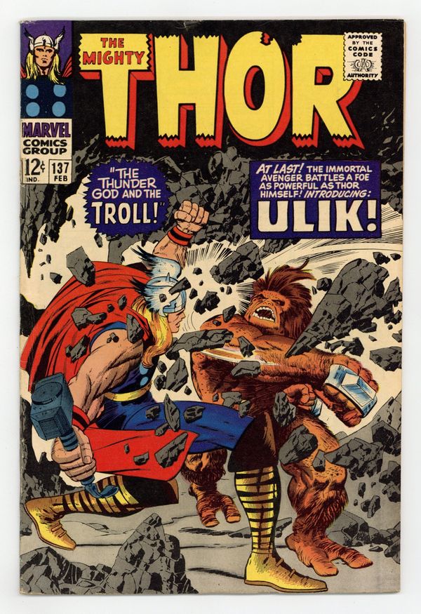 Tags: Marvel Legacy Numbering: Thor (part 137), Thor$30.00Cover pencils by Jack Kirby, inks by Vince Colletta. First appearance of Ulik of the Rock Trolls in "The Thunder God and the Troll!"; Geirrodur's trolls capture Sif and lure Thor after her; Thor must battle Ulik, mightiest of the Rock Trolls. Tale of Asgard: "The Tragedy of Hogun!", script by Stan Lee, pencils by Jack Kirby, inks by Vince Colletta; Thor and his companions find the dying Saguta who is a countryman of Hogun's; Hogun swears vengeance on Mogul, lord of the Mystic Mountain, who did this. 36 pgs., full color. $0.12. Cover price $0.12.