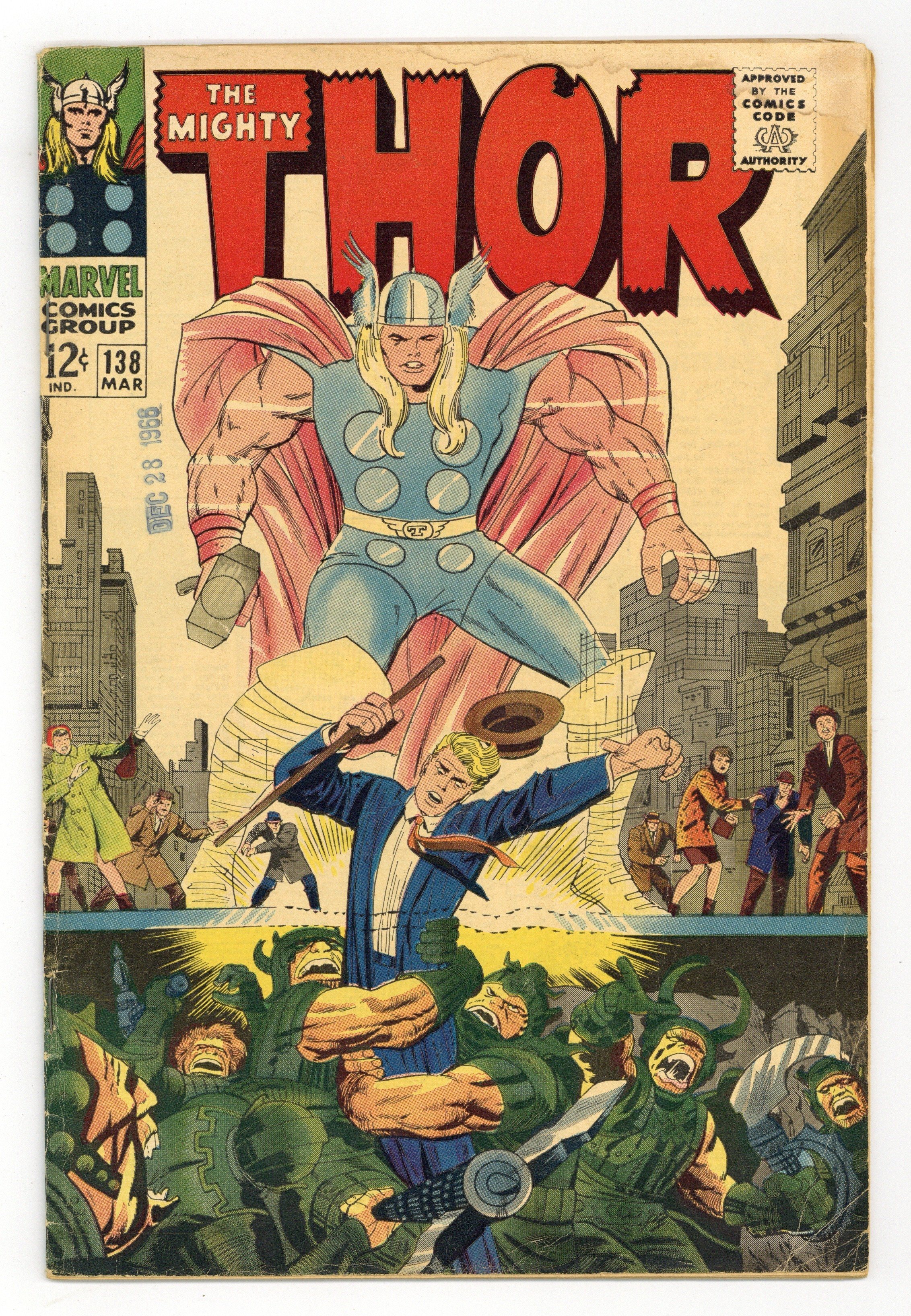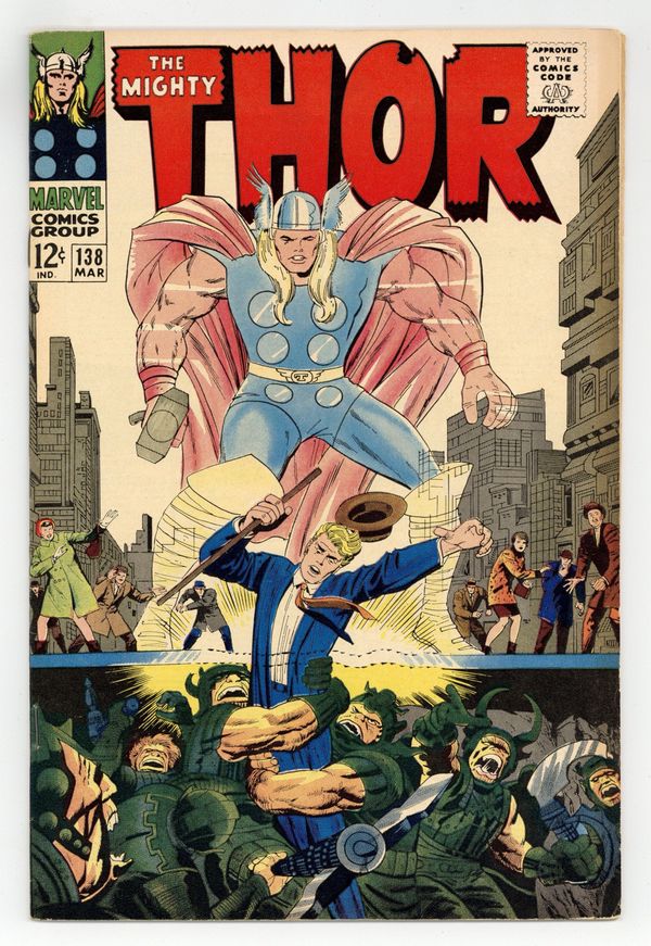 Tags: Marvel Legacy Numbering: Thor (part 138), Thor$29.00Cover pencils by Jack Kirby, inks by Vince Colletta. "The Flames of Battle!", script by Stan Lee, pencils by Jack Kirby, inks by Vince Colletta; The Trolls steal Thor's hammer while he's on earth using the Orb of Orikal which they have stolen from its owner. Appearances by Sif, Odin, and Ulik. Tale of Asgard: "The Quest for the Mystic Mountain!", script by Stan Lee, pencils by Jack Kirby, inks by Vince Colletta; Thor and companions defeat the one-eyed Ogur to speak with Wazir, the prophet. 36 pgs., full color. $0.12. Cover price $0.12.