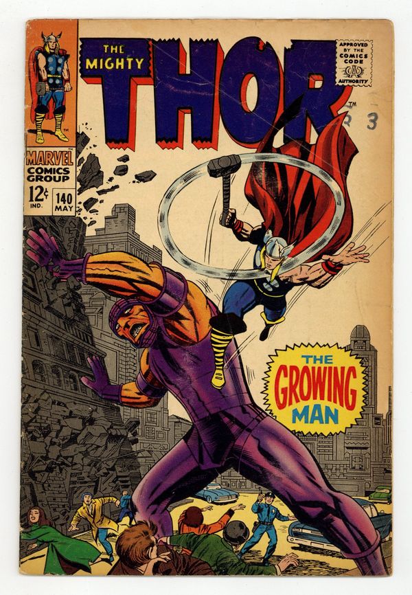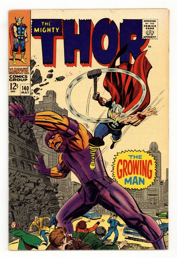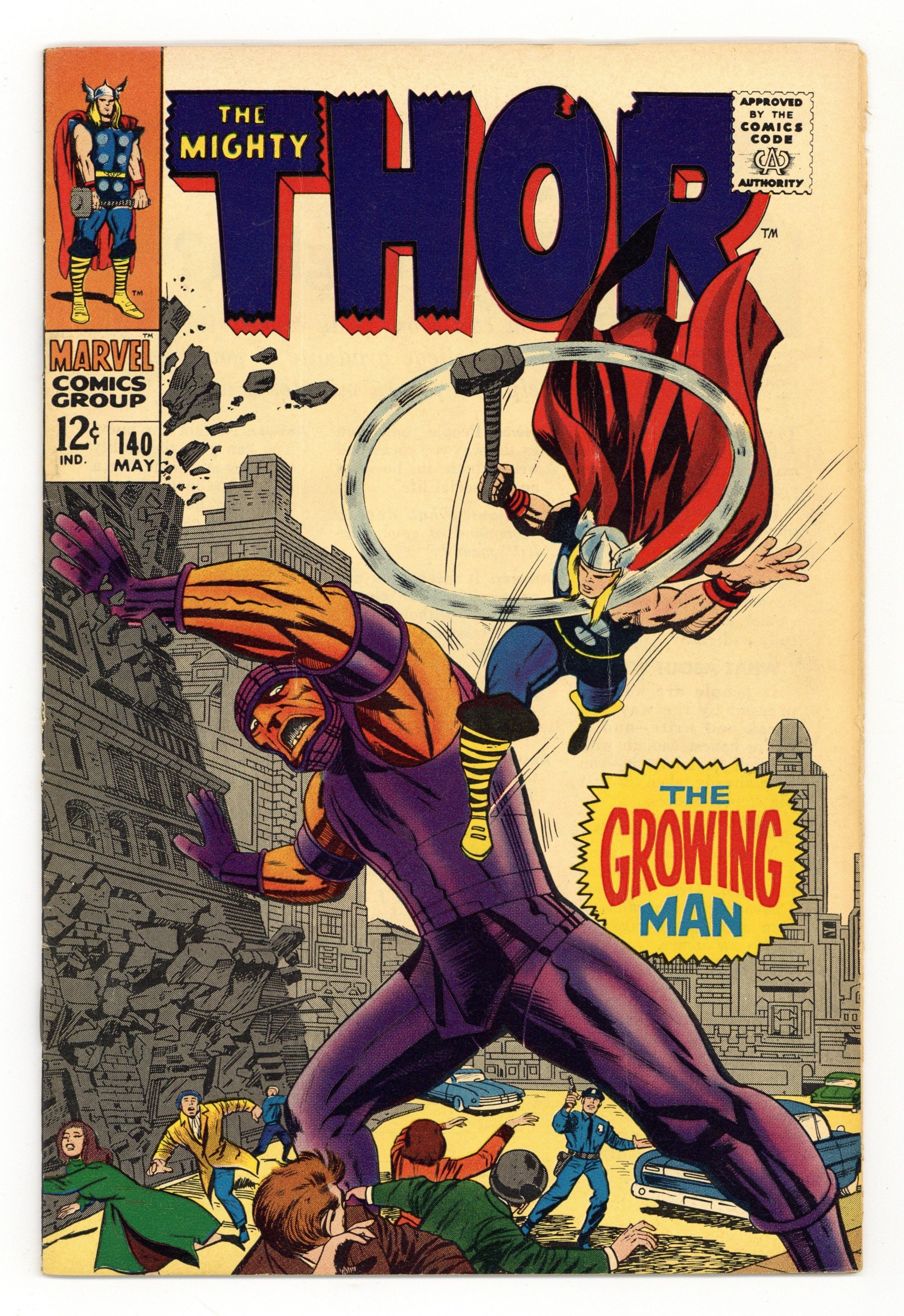 Tags: Marvel Legacy Numbering: Thor (part 140), Thor$23.00Cover pencils by Jack Kirby, inks by Vince Colletta. First appearance of the Growing Man in "The Growing Man!", script by Stan Lee, pencils by Jack Kirby, inks by Vince Colletta; After winning the battle against the Trolls last issue, the Asgardians are celebrating their victory; Thor tells Odin that he had spent too much time away from Earth and that he wants to come back; Meanwhile, a museum expedition had discovered a small doll that had grown to the size of a human; Thor is called to help the cops in defeating this Growing Man, and he discovers that the Growing Man's master is actually Kang. Appearances by Sif, Odin, and Kang the Conqueror. Tales of Asgard: "The Battle Begins!", script by Stan Lee, pencils by Jack Kirby, inks by Vince Colletta; Thor and companions defeat the Jinni Devil. 36 pgs., full color. $0.12. Cover price $0.12.