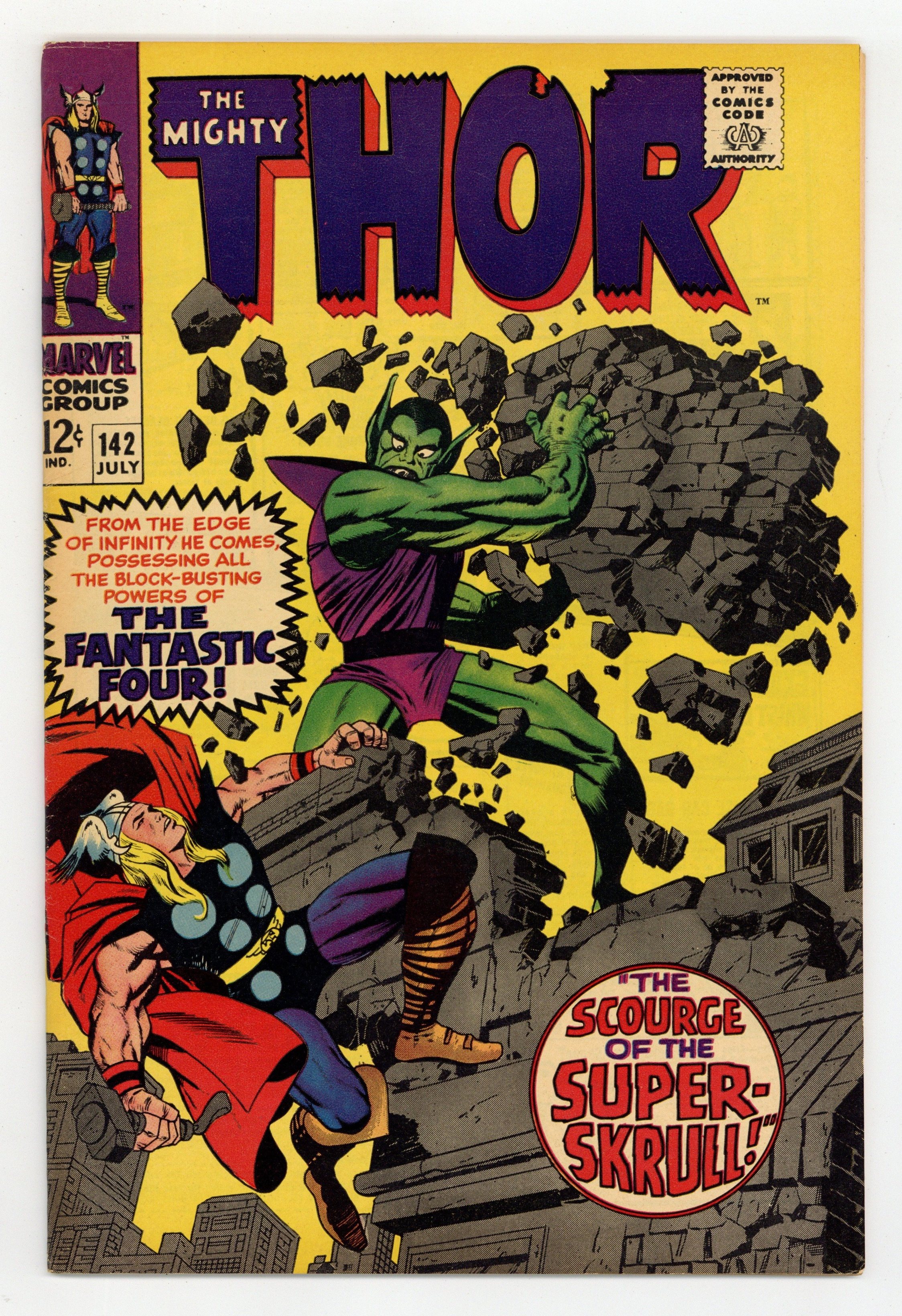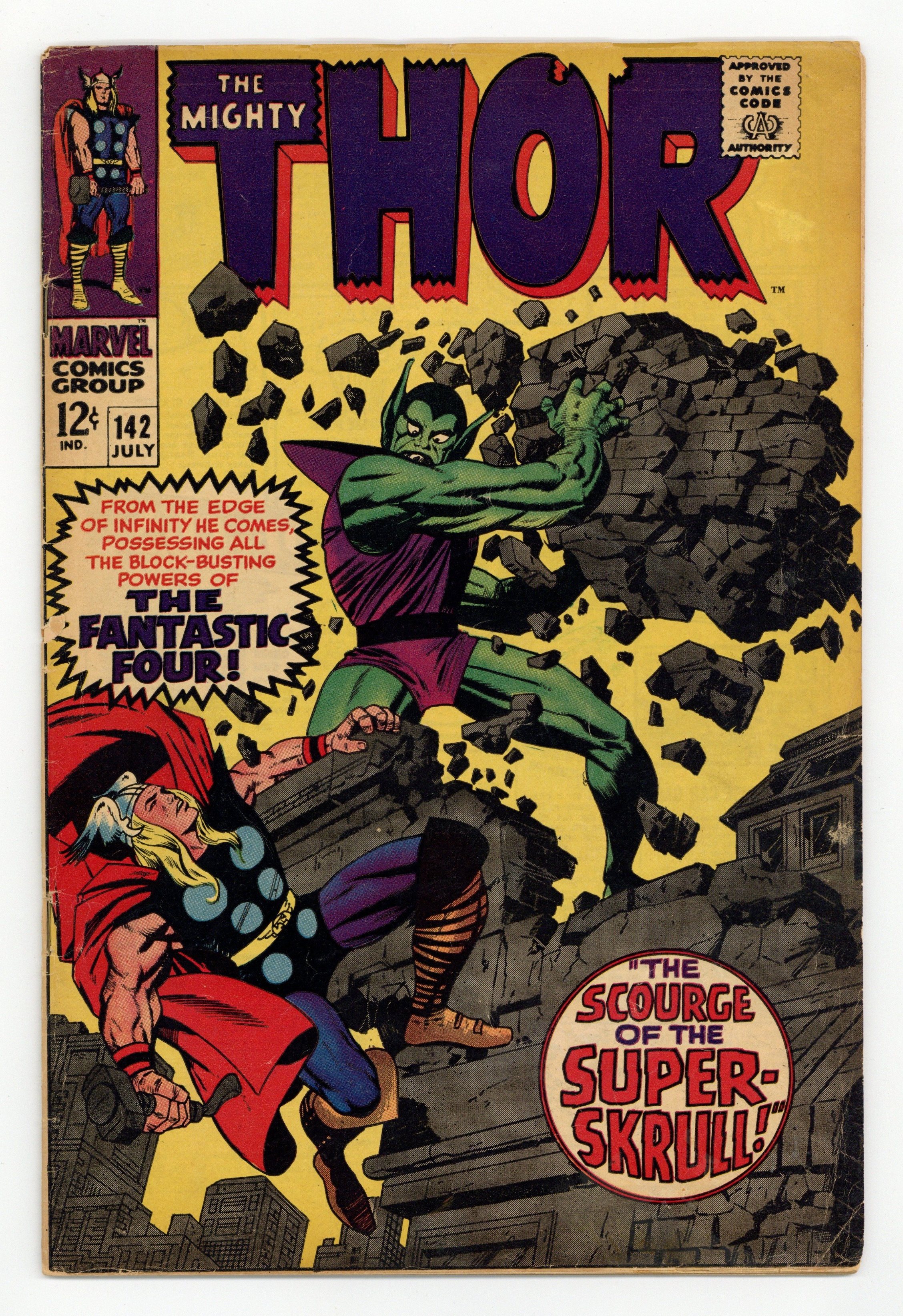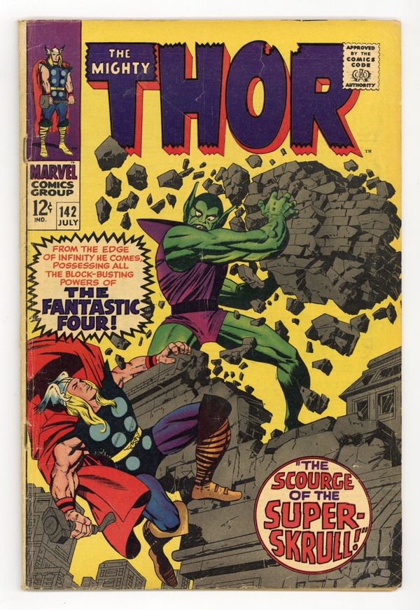 Tags: Marvel Legacy Numbering: Thor (part 142), Thor$31.00Cover pencils by Jack Kirby, inks by Vince Colletta. "The Scourge of the Super-Skrull!", script by Stan Lee, pencils by Jack Kirby, inks by Vince Colletta; The Super-Skrull, influenced by Loki, attacks and is beaten by Thor; Meanwhile, Odin sends Sif and Balder to find the evil Enchanters in the land of Ringsfjord. Tale of Asgard: "We, Who Are About to Die...!", script by Stan Lee, pencils by Jack Kirby, inks by Vince Colletta; Mogul's Demon Riders attack Thor and his companions. 36 pgs., full color. $0.12. Cover price $0.12.