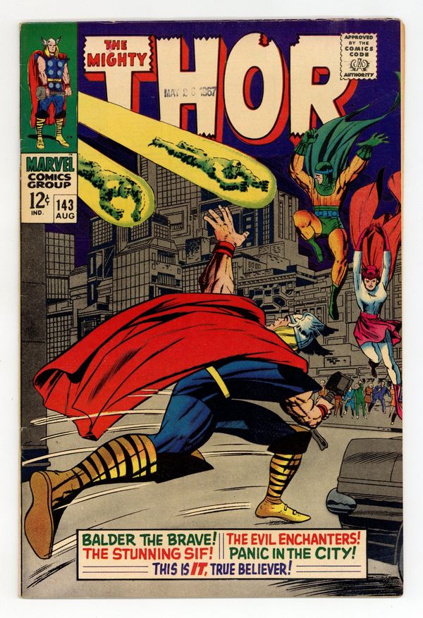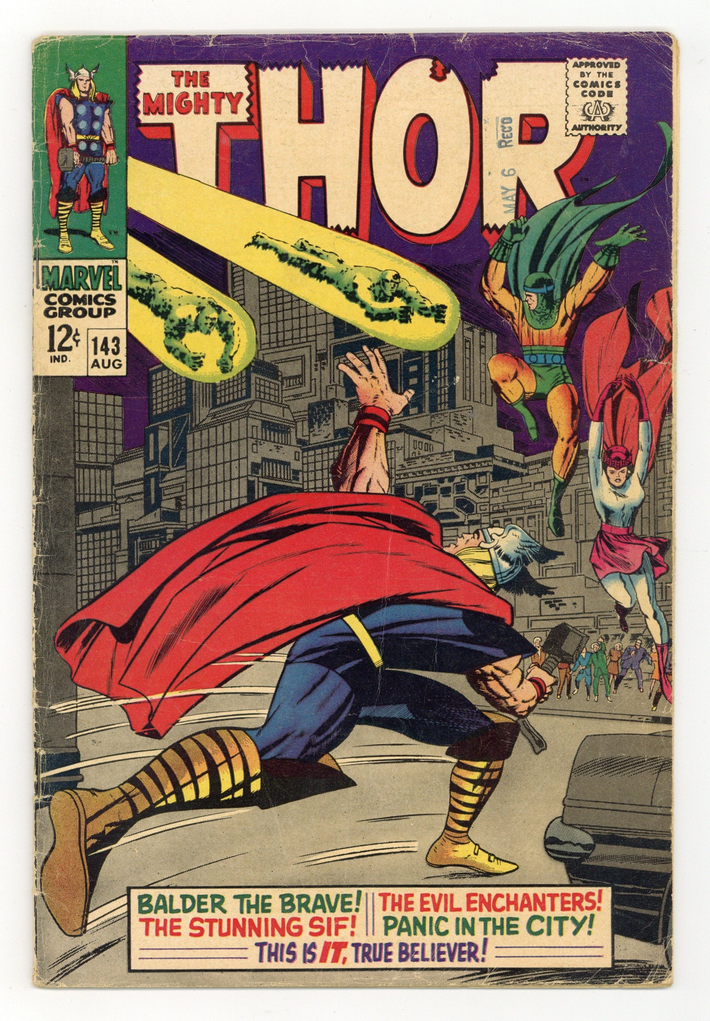 Tags: Marvel Legacy Numbering: Thor (part 143), Thor$14.00Cover pencils by Jack Kirby, inks by Vince Colletta. "And, Soon Shall Come: the Enchanters!", script by Stan Lee, pencils by Jack Kirby, inks by Bill Everett; Thor, Sif and Balder face the Enchanters Three and the Living Talisman. Marvel Bullpen Bulletins. Tales of Asgard: "To The Death!", script by Stan Lee, pencils by Jack Kirby, inks by Bill Everett; Volstagg finds the Idol of the Mystic Mountain and the Rod of Wondrous Wizard Power; Thor faces the Demon Riders. 36 pgs., full color. $0.12. Cover price $0.12.