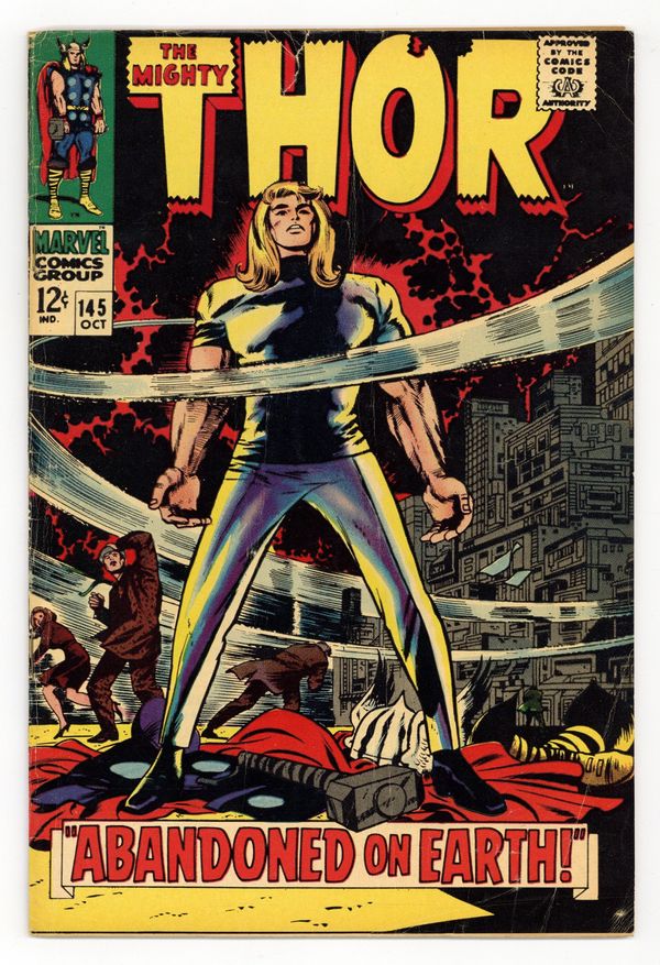 Tags: Marvel Legacy Numbering: Thor (part 145), Thor$9.00Cover pencils by Jack Kirby and John Romita (alterations), inks by Vince Colletta and John Romita (alterations). "Abandoned on Earth!", script by Stan Lee, pencils by Jack Kirby, inks by Vince Colletta; Odin defeats Forsung and demands all Asgardians return; Thor refuses and his powers are removed (except Asgardian Strength); The Ringmaster hypnotizes Thor into joining the Circus of Crime. Appearances by Balder, Sif, Odin, and the Circus of Crime. Tale of Asgard: "The End!", script by Stan Lee, pencils by Jack Kirby, inks by Vince Colletta; Alibar and Hogun defeat Mogul's spotted plague. 36 pgs., full color. $0.12. Cover price $0.12.