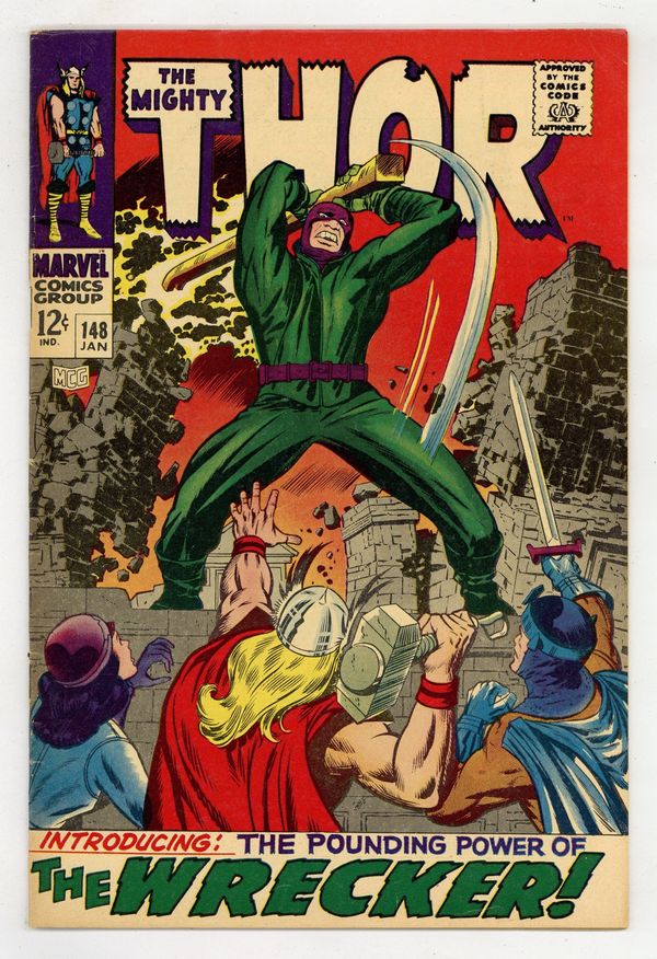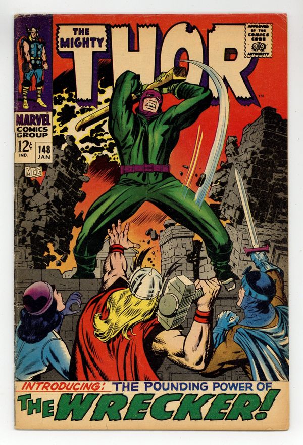 Cover pencils by Jack Kirby, inks by Vince Colletta. First appearance of the Wrecker in "Let There Be... Chaos!", script by Stan Lee, pencils by Jack Kirby, inks by Vince Colletta; All the Asgardians on earth have their powers removed by Odin; Loki, trying to get power from Karnilla, accidentally creates the Wrecker who attacks Thor. Appearances by Balder, Sif, Odin, and Loki. Spider-Man cameo. Origins of the Inhumans back-up: "And Finally: Black Bolt!", script by Stan Lee, pencils by Jack Kirby, inks by Joe Sinnott; Agon and Rynda have altered their infant son's genetic pattern to give him the powers of levitation and electron manipulation, but they discover that he has a more dangerous and destructive power in his voice. 36 pgs., full color. $0.12. Cover price $0.12.