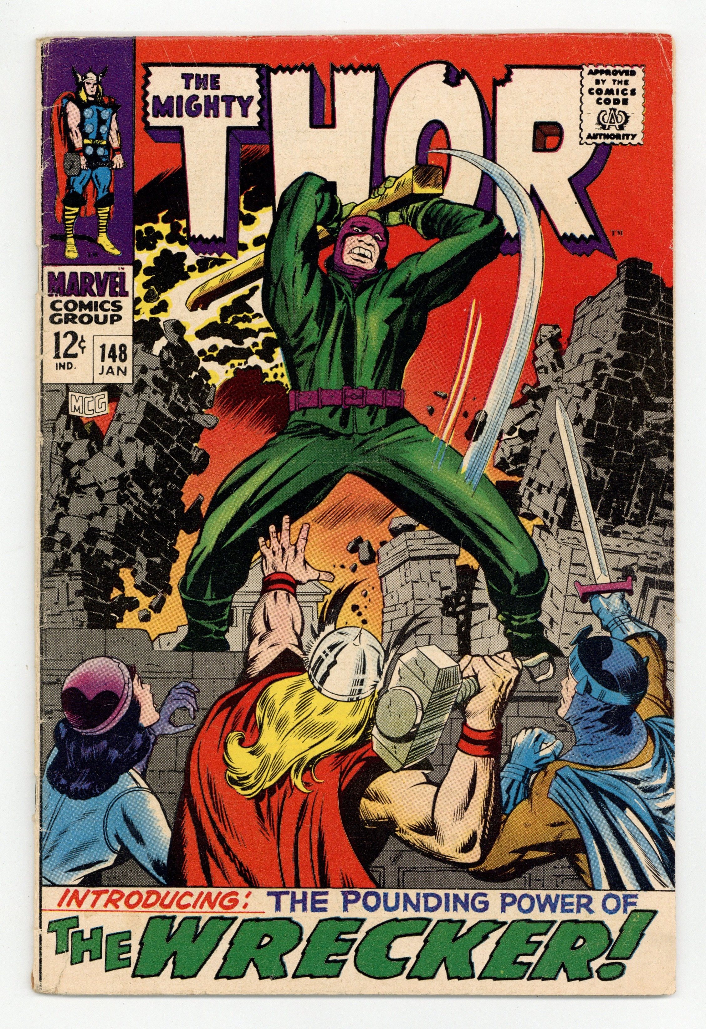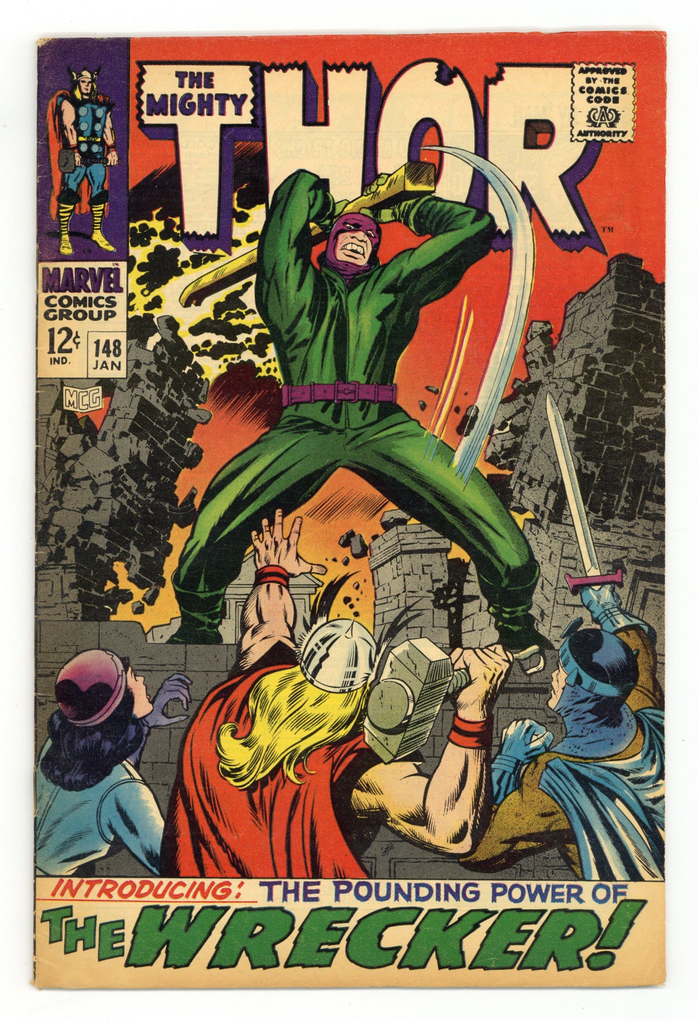 Starts Feb 2 Cover pencils by Jack Kirby, inks by Vince Colletta. First appearance of the Wrecker in "Let There Be... Chaos!", script by Stan Lee, pencils by Jack Kirby, inks by Vince Colletta; All the Asgardians on earth have their powers removed by Odin; Loki, trying to get power from Karnilla, accidentally creates the Wrecker who attacks Thor. Appearances by Balder, Sif, Odin, and Loki. Spider-Man cameo. Origins of the Inhumans back-up: "And Finally: Black Bolt!", script by Stan Lee, pencils by Jack Kirby, inks by Joe Sinnott; Agon and Rynda have altered their infant son's genetic pattern to give him the powers of levitation and electron manipulation, but they discover that he has a more dangerous and destructive power in his voice. 36 pgs., full color. $0.12. Cover price $0.12.
