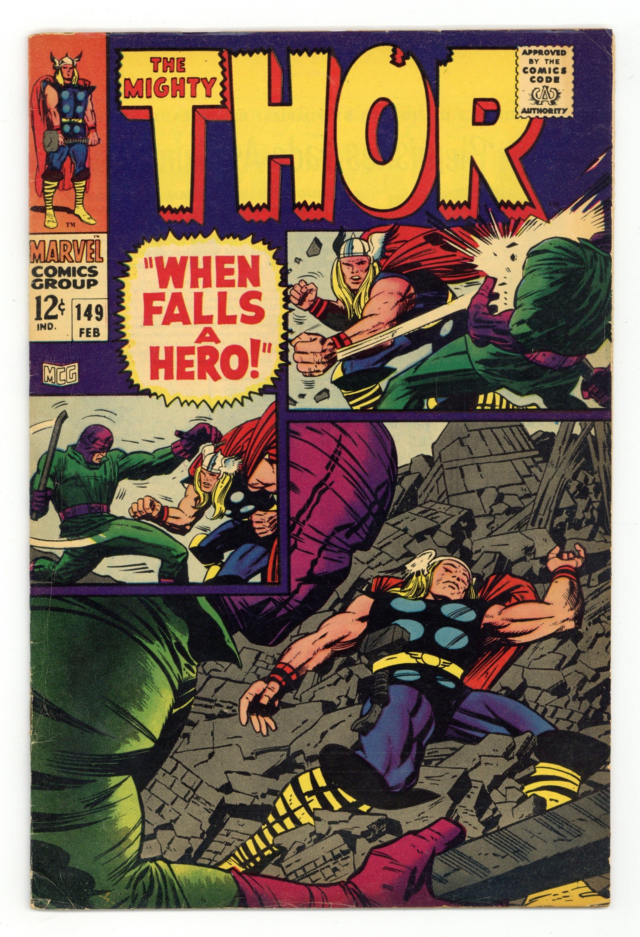 Tags: Marvel Legacy Numbering: Thor (part 149), Thor$21.00Cover pencils by Jack Kirby, inks by Vince Colletta. "When Falls a Hero!", script by Stan Lee, pencils by Jack Kirby, inks by Vince Colletta; Stripped of his Godly powers, Thor must now face the Wrecker, who has been granted mystical powers accidentally by Karnilla the Norn Queen; As their battle rages on in New York City, Thor can only maintain a defensive and is soon easily beat into submission by the simple minded crook; While in faraway Asgard, Balder and Sif can only watch in horror as their friend and ally is savaged on Earth; No longer able to stand being idle and doing nothing, Sif convinces Balder to join her in trying to convince Odin to come to Thor's rescue; Overhearing this, Loki decides to steal the mystic crystal; Plot crossover with the Fantastic Four 73. "Origins of the Inhumans" back-up: "Silence or Death!", script by Stan Lee, pencils by Jack Kirby, inks by Joe Sinnott; Black Bolt, who has been kept in isolation because of his deadly voice, finally meets his cousins and his brother Maximus; Maximus attacks Black Bolt hoping to make Black Bolt speak and prove himself unworthy to rule; Origins of Black Bolt, Medusa, Crystal, Maximus, Gorgon, and Karnak. 36 pgs., full color. Cover price $0.12.