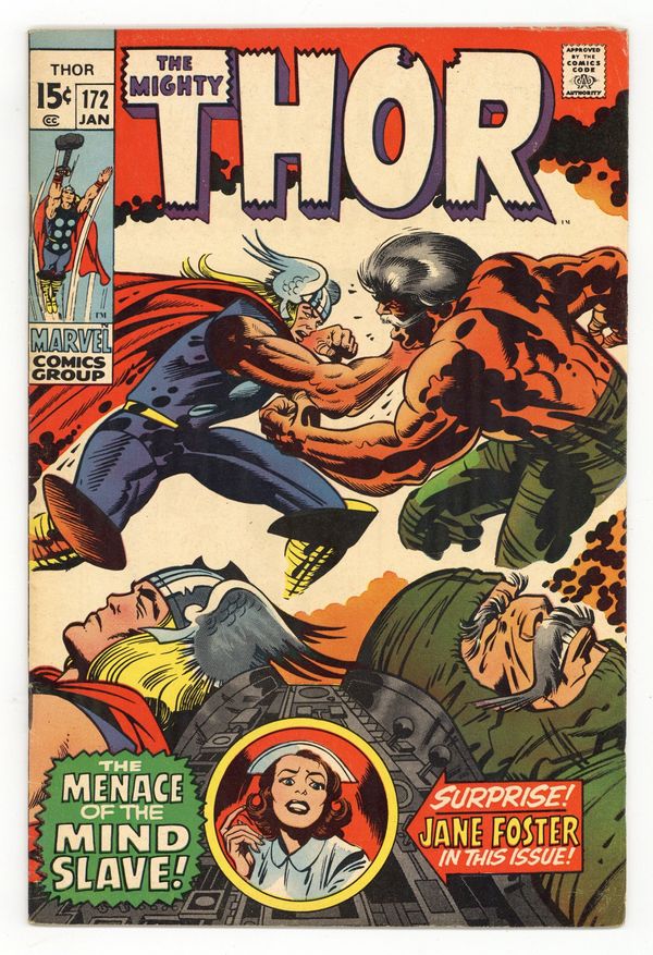 Tags: Marvel Legacy Numbering: Thor (part 172), Thor$15.50Cover pencils by Jack Kirby, inks by Bill Everett. "The Immortal and the Mind-Slave!", script by Stan Lee, pencils by Jack Kirby, inks by Bill Everett; Jane Foster, kidnapped!; No longer under the protection of Donald Blake, Jane finds herself vulnerable to a blackmailing scheme by billionaire Kornin Krask; Will Thor call on the power of the All-Father to save the woman he loves? Appearance by Odin. Cameos by Balder, Karnilla, and Loki. 36 pgs., full color. $0.15. Cover price $0.15.