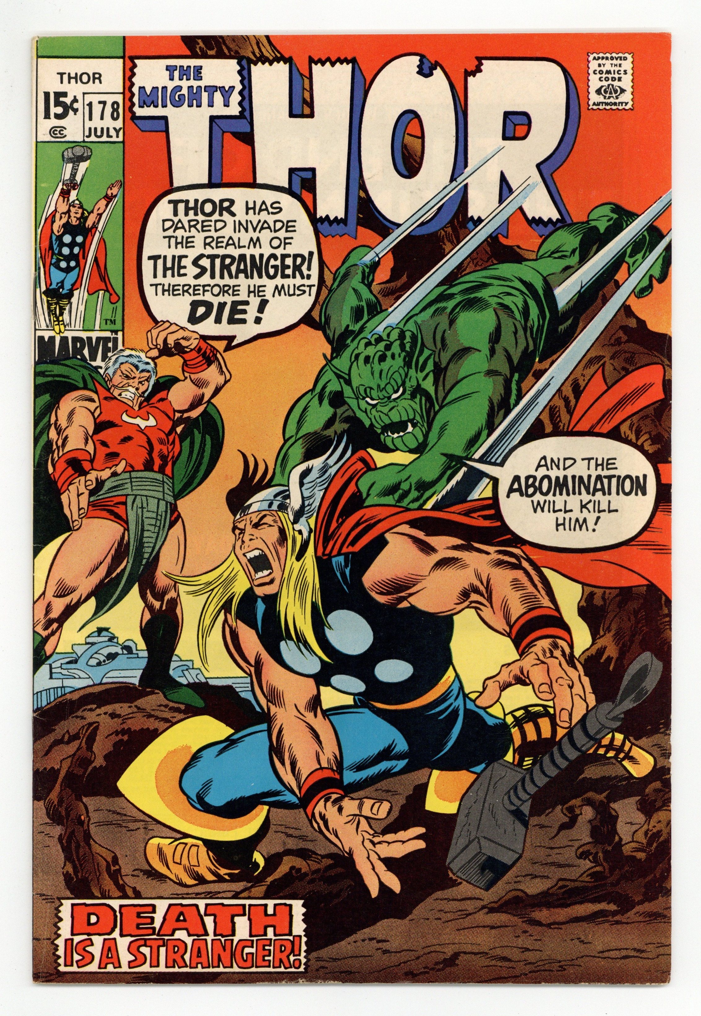 Tags: Marvel Legacy Numbering: Thor (part 178), Thor$15.50Cover pencils by John Buscema, inks by John Verpoorten. "Death Is a Stranger," script by Stan Lee, pencils by John Buscema, inks by Vince Colletta; Following the defeat of Surtur, Odin has reclaimed the throne in Asgard, although there is much celebration, Sif notices that Thor is concerned over when Loki may return to attack Asgard anew; While in the deep reaches of space, the Abomination re-materializes on the Stranger's world following his defeat at the hands of the Silver Surfer; Finding himself outside of the Stranger's citadel, the Abomination sneaks into it to try and find a means of defeating his captor so that he might escape. Cameos by the Silver Surfer and Warlock Prime. Ad for Conan the Barbarian #1. 36 pgs., full color. $0.15. Cover price $0.15.