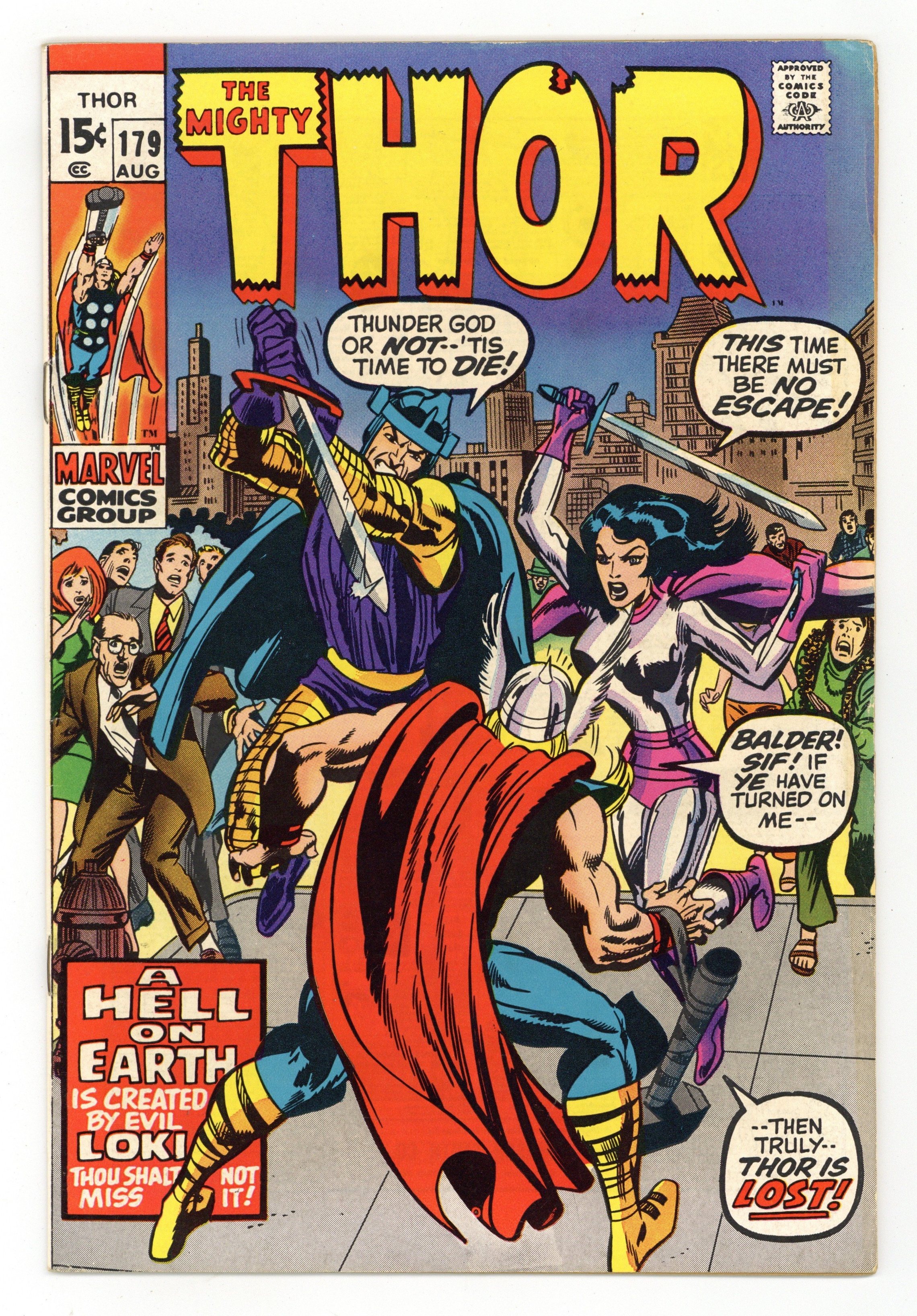 Tags: Marvel Legacy Numbering: Thor (part 179), Thor$15.50Cover pencils by Neal Adams and John Romita (alterations). Loki switches bodies with Thor in "No More the Thunder God!", script by Stan Lee, pencils by Jack Kirby, inks by Vince Colletta and John Verpoorten; Surveying the battle done by Surtur, Thor and the Warriors Three encourage the warriors of Asgard to rebuild and repair the damage done; Later Thor meets with Sif and the two have a brief romantic moment before Thor is greeted by Odin, who wishes the Thunder God to go to Earth and search for Loki; As Odin transports Thor to Earth, Loki has shacked up in a posh penthouse using his magical tricks to make it appear that he is wealthy; He awaits Thor's arrival as his magician is preparing a special trap to use against the Thunder God. Letter to the editor from DC Comics editor Neal Pozner. 36 pgs., full color. $0.15. Cover price $0.15.