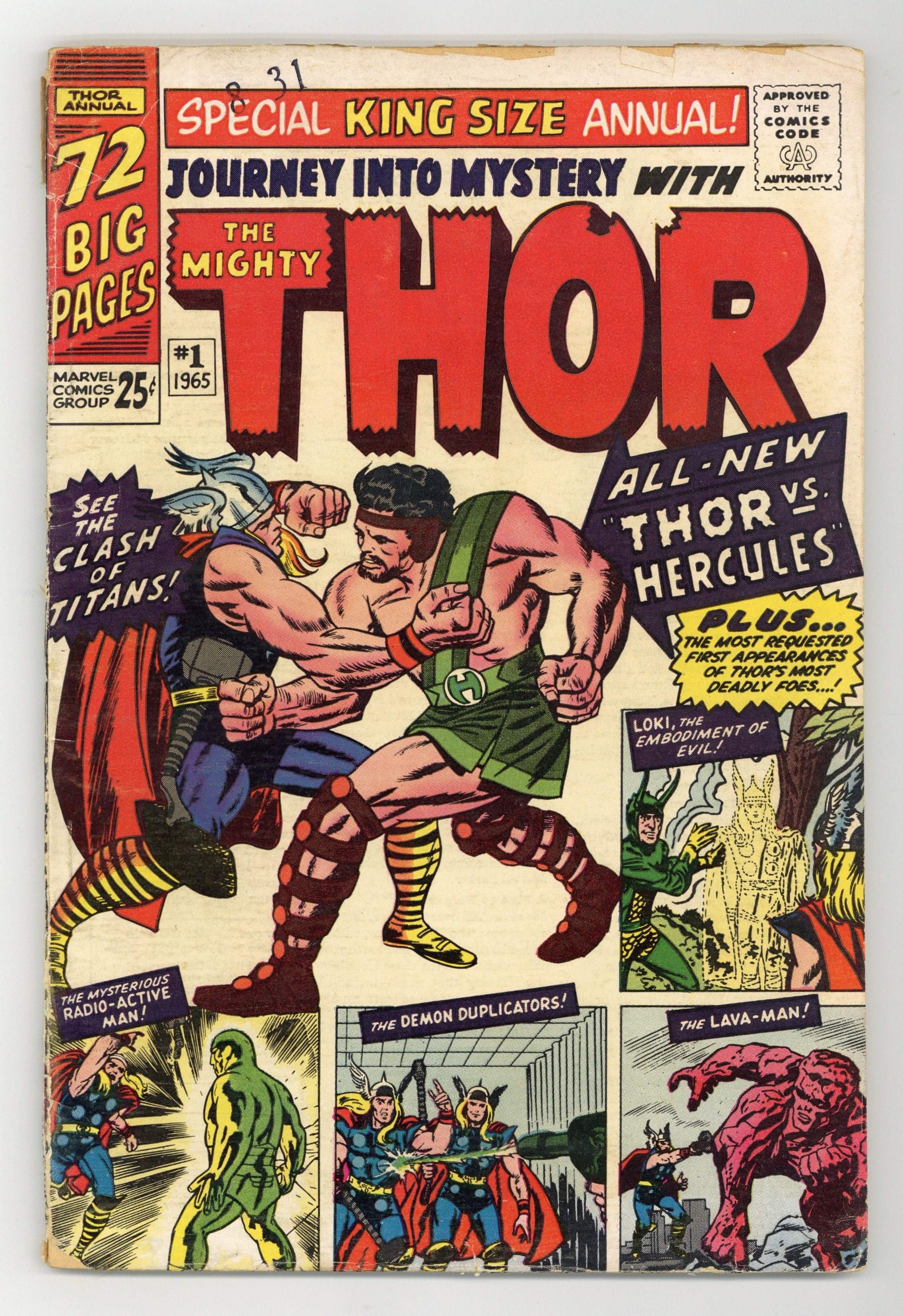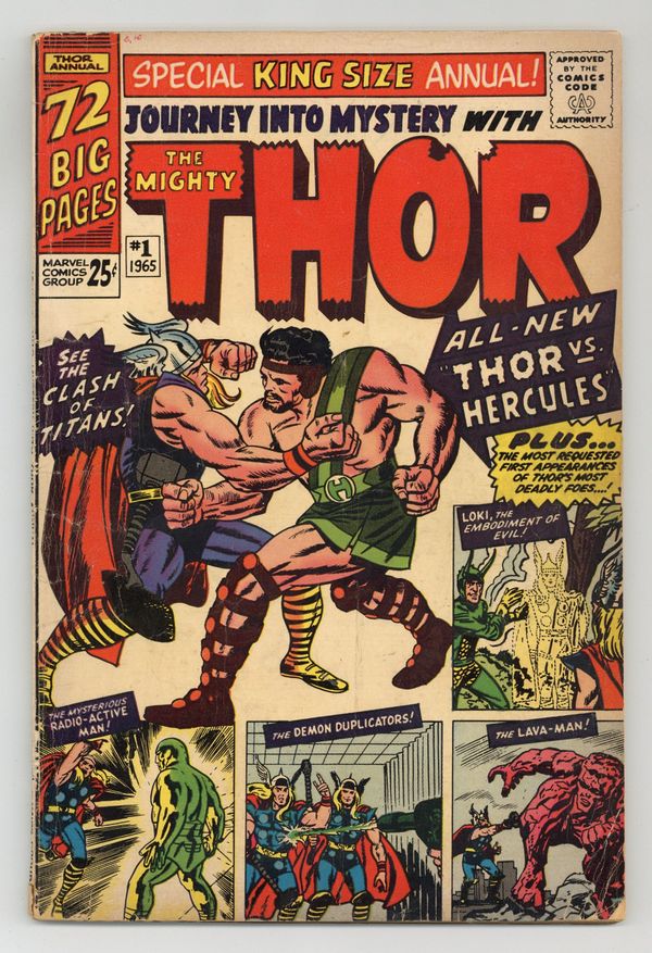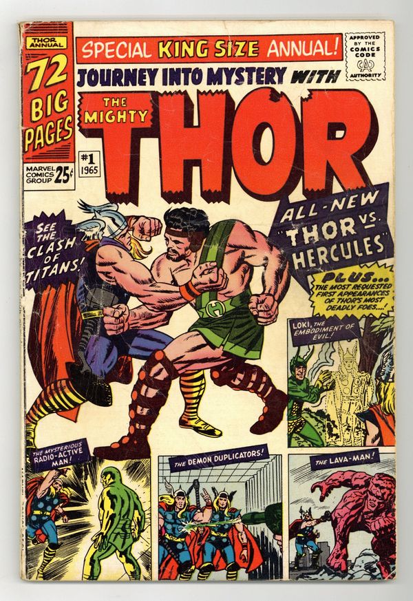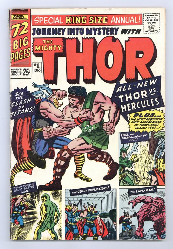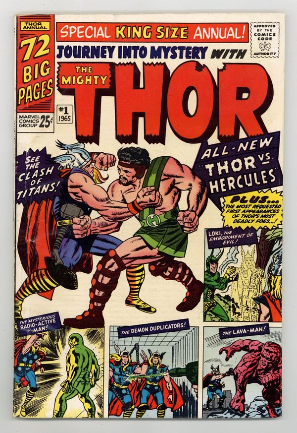 72 page giant. First appearance of Hercules in "When Titans Clash!" Cover by Jack Kirby. Script by Stan Lee, pencils by Jack Kirby, inks by Vince Colletta. Loki appearance. This issue also includes a diagram of Asgard and Thor reprints: "Trapped by Loki, the God of Mischief" (from Journey Into Mystery 85); "The Mysterious Radio-Active Man" (JIM 93); "The Demon Duplicators" (JIM 95); and "The Mighty Thor Battles the Lava Man" (JIM 97). Kirby cover. 76 pages, full color. Cover price $0.25.