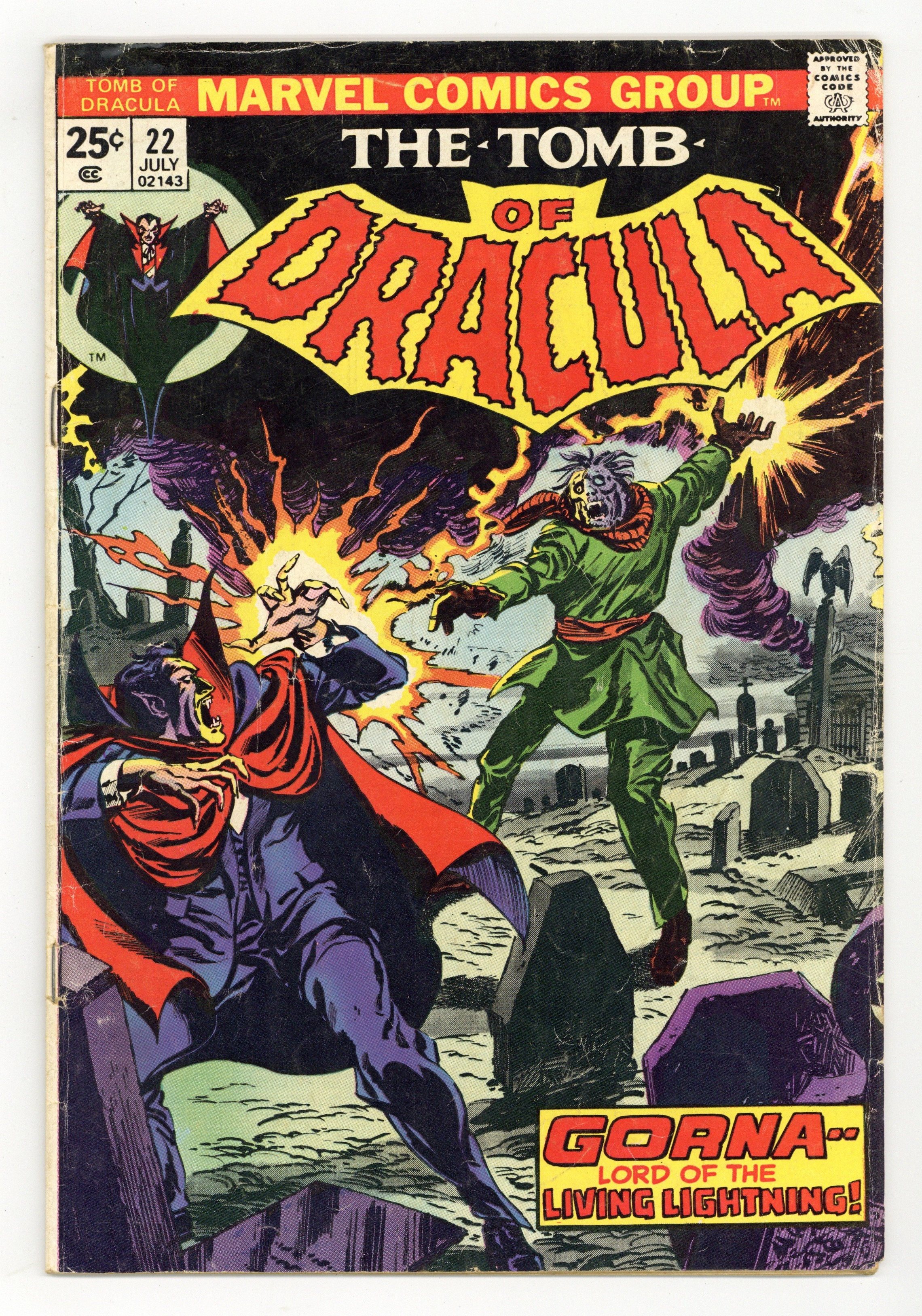 "In Death Do We Join!" Written by Marv Wolfman. Art by Gene Colan and Tom Palmer. Behind the Iron Curtain Dracula must face the macabre power of Gorna, Lord of the Living Lightning! 32 pages, FC. NOTE: The letters page contains Marvel Value Stamp series A # 27 (the Black Widow by John Romita Sr.). Gil Kane/Palmer cover. Cover price $0.25.