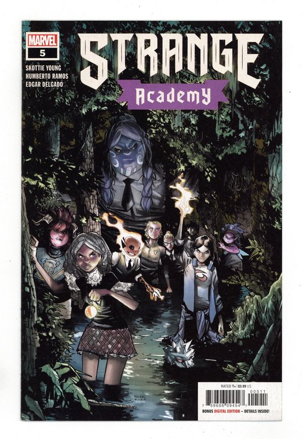 Tags: Doctor Strange$5.00Written by Skottie Young. Art and Cover by Humberto Ramos. The founding of the Strange Academy came with some gigantic risks. So far the students and teachers haven't felt the sting of those risks. That changes this issue. o Something horrible is bubbling up in the bayous outside New Orleans and the students of Strange Academy are going to have to wade in and uncover an evil that they are not ready to handle. 28 pages, full color. Rated T+ Cover price $3.99.
