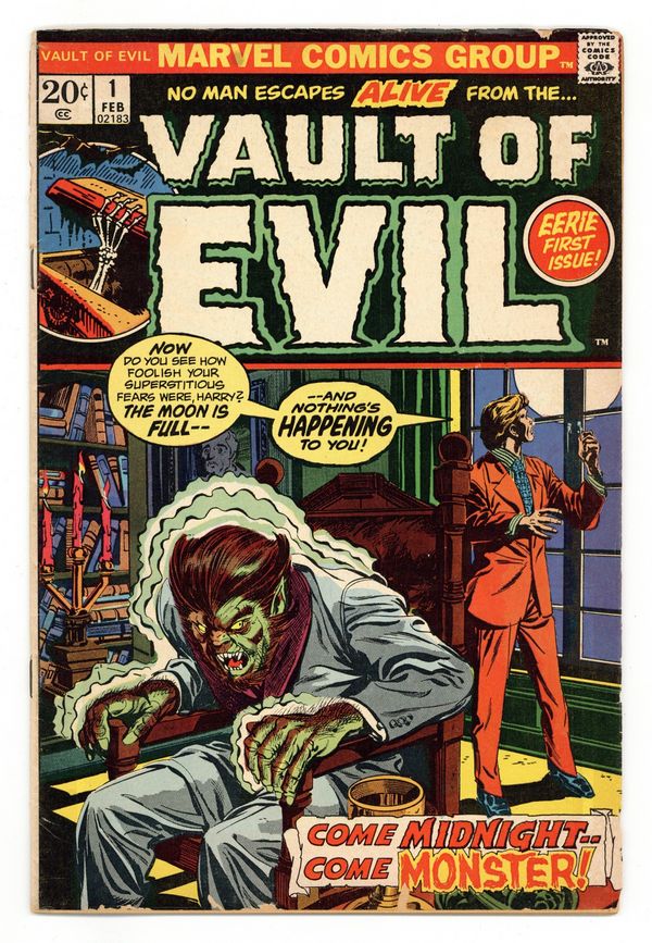 Cover by Gil Kane and Tom Palmer. The Thing that Grew!; Professor Borglum creates a new life when his blood is accidently mixed with an experiment; When it continues to grow and kill people for their blood he tries to find a way to kill it. The Withered Hand, art by Paul Reinman; While in Tibet John Clay steals a priceless ruby that a monk tells him contains a sinner's soul. House ad for Fear (Marvel, 1970 series) #12 (February 1973), featuring Man-Thing art. The Man in the Box!, script, pencils by Bill Benulis, inks by Jack Abel; The story of a little (roughly inch tall) man who lives in a little green box and comes out every night to do a good deed. Poor Mister Watkins, script by Stan Lee, art by Werner Roth; Henry Higgins is an obnoxious man who enjoys being mean to others and harrasses a young lady at the library. 36 pgs., full color. $0.20. Cover price $0.20.