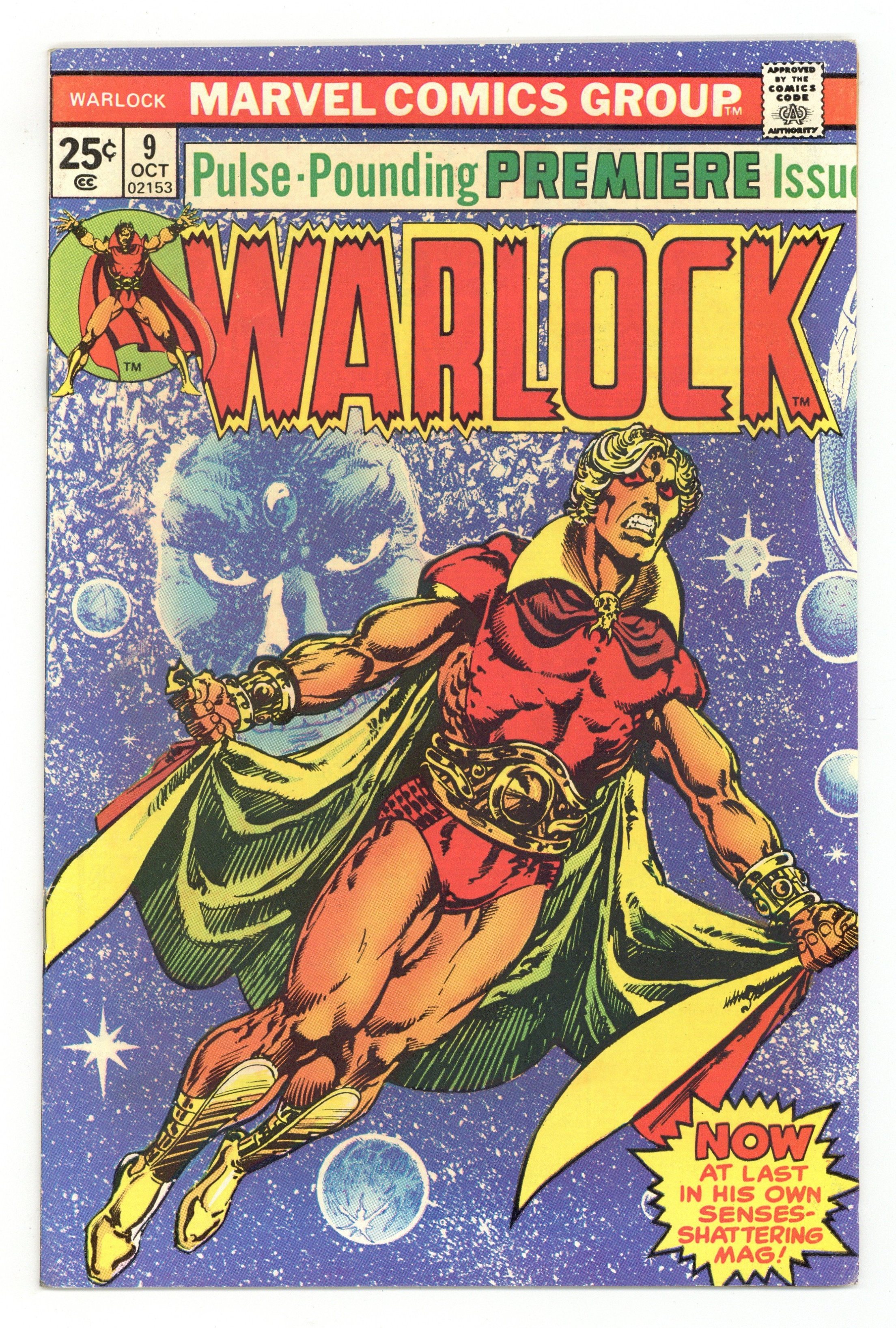 First 25-cent cover price. Cover pencils by Jim Starlin, inks by Alan Weiss. "The Infinity Effect," script and pencils by Jim Starlin, inks by Steve Leialoha; The story picks up after Strange Tales #181, where Warlock, Gamora, and Pip have just come face to face with the deadly Magus!; First mention of the In-Betweener (no actual appearance); At the end Thanos shows up telling that he was behind Gamora's plan to defeat Magus all the time; This issue also tells the story about Magus being an old version of Warlock and about Universal Church of Truth. Letter to the editor from comics historian Peter Sanderson. Starlin cover. Note: First appearance of the In-Betweener. 36 pgs., full color. $0.25. Cover price $0.25.