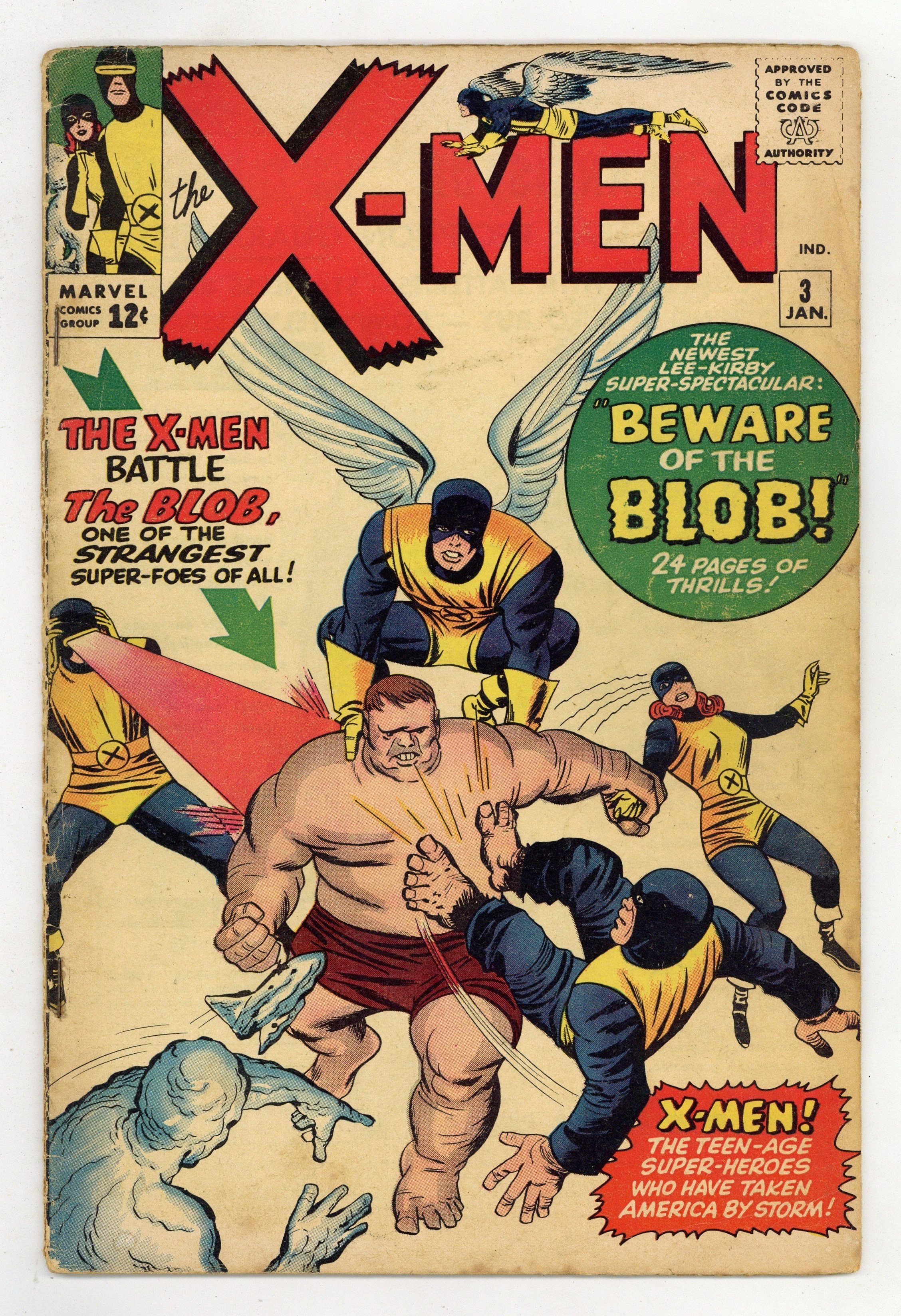 First appearance of the Blob. Cover pencils by Jack Kirby. Beware of the Blob!, script by Stan Lee, pencils by Jack Kirby, inks by Paul Reinman; Professor X detects a new mutant and sends the X-Men to investigate; They arrive at a carnival and encounter the Blob, a very fat sideshow attraction who can bounce bullets off of his malleable hide as well as anchor himself to the earth and become immovable; The X-Men bring him back to the mansion as a potential member but the Blob spurns their invitation and returns to the carnival; Realizing that the Blob knows their secret, the X-Men lure him back to the mansion where Xavier wipes his memory. 36 pgs. $0.12. Cover price $0.12.