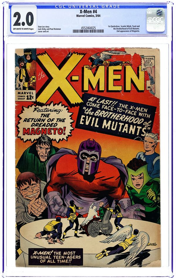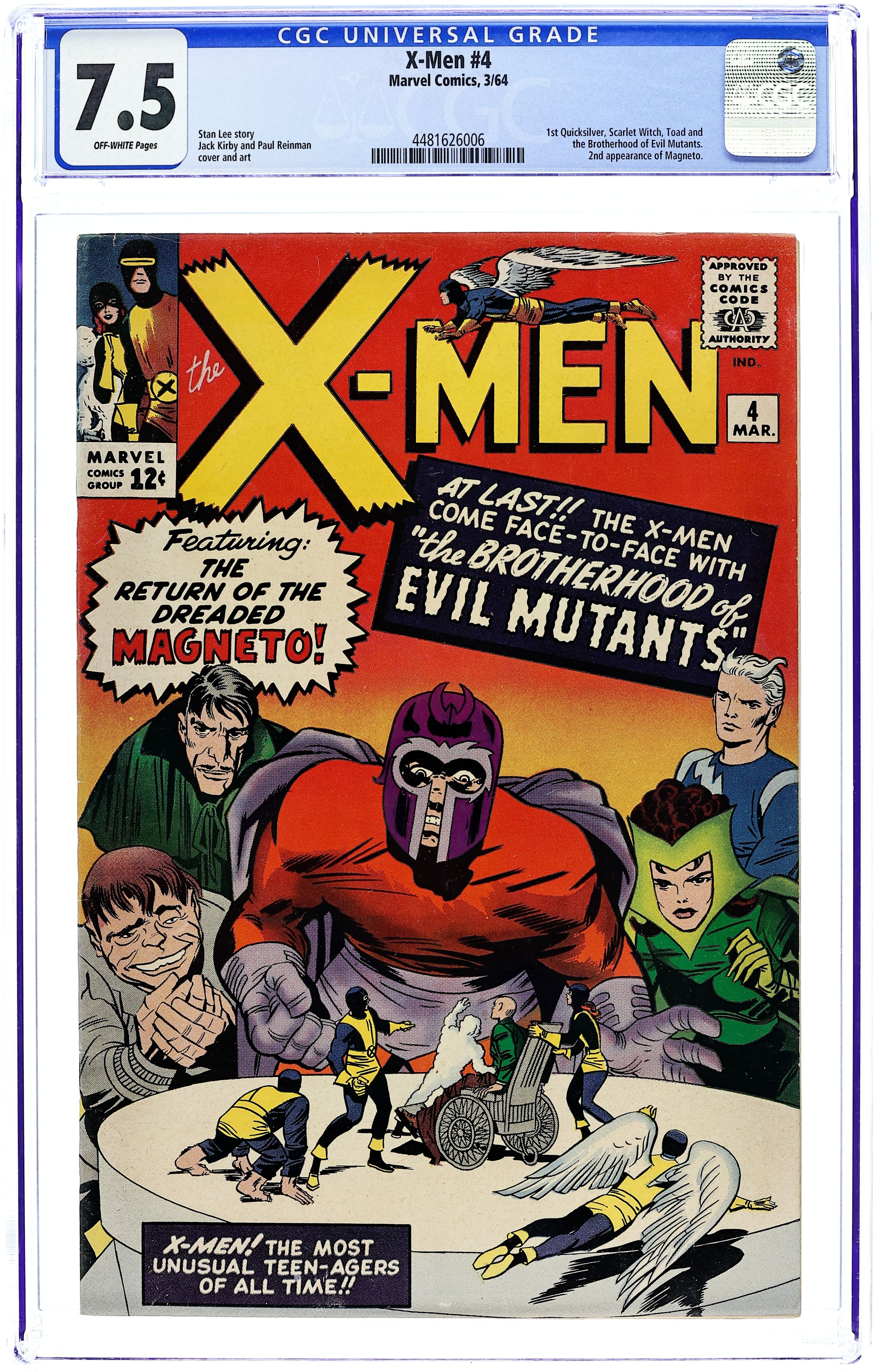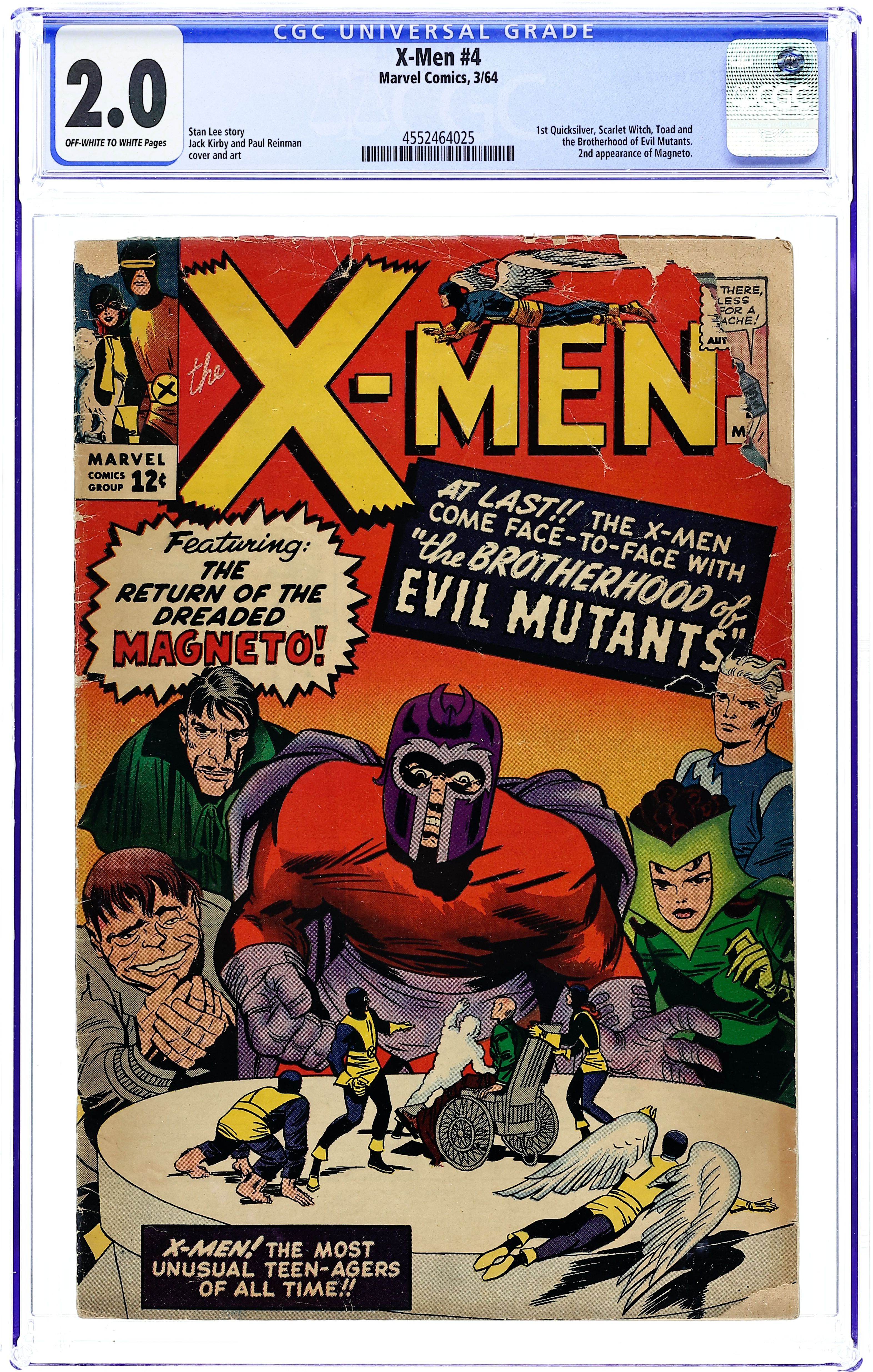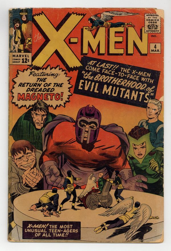 Quicksilver, Scarlet Witch, Mastermind, and Toad appear for the 1st time, and Magneto makes his 2nd appearance. Cover pencils by Jack Kirby. The Brotherhood of Evil Mutants!, script by Stan Lee, pencils by Jack Kirby, inks by Paul Reinman; Magneto and his new Brotherhood of Evil Mutants steals a freighter and uses it to take over the South American nation of Santo Marco; The X-Men invade and take the country back; Xavier is caught in an explosion and loses his mental powers. 36 pgs.