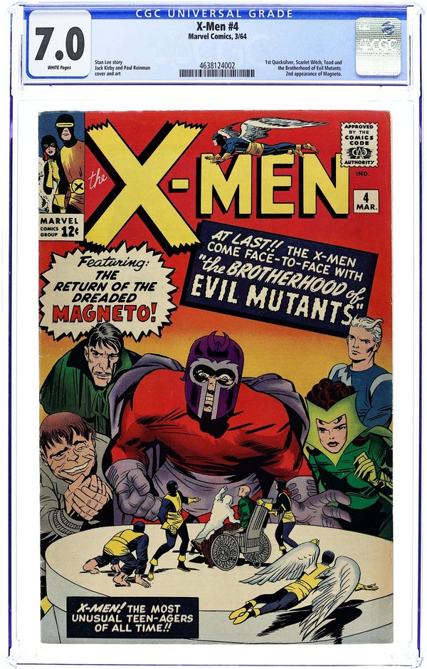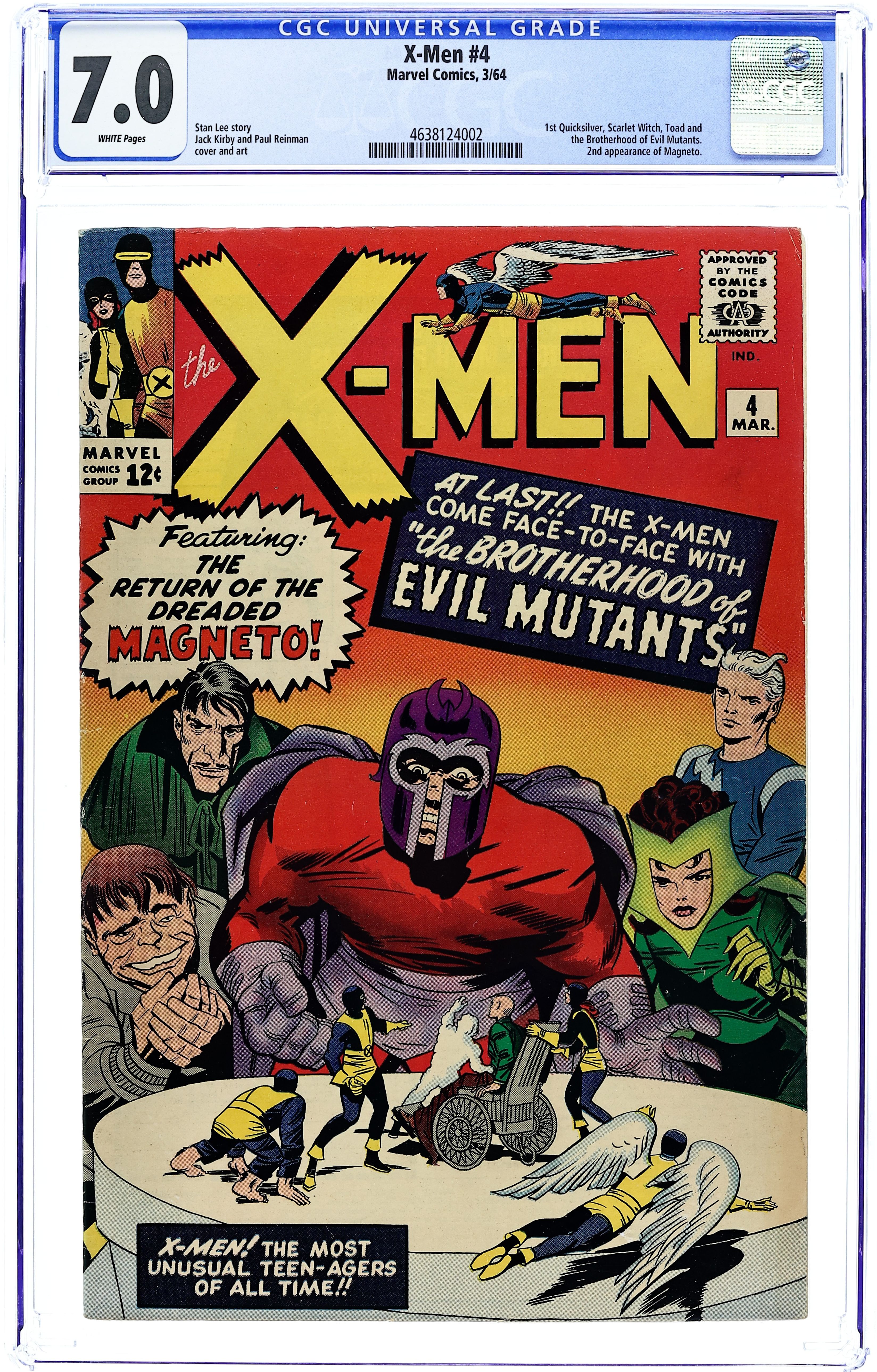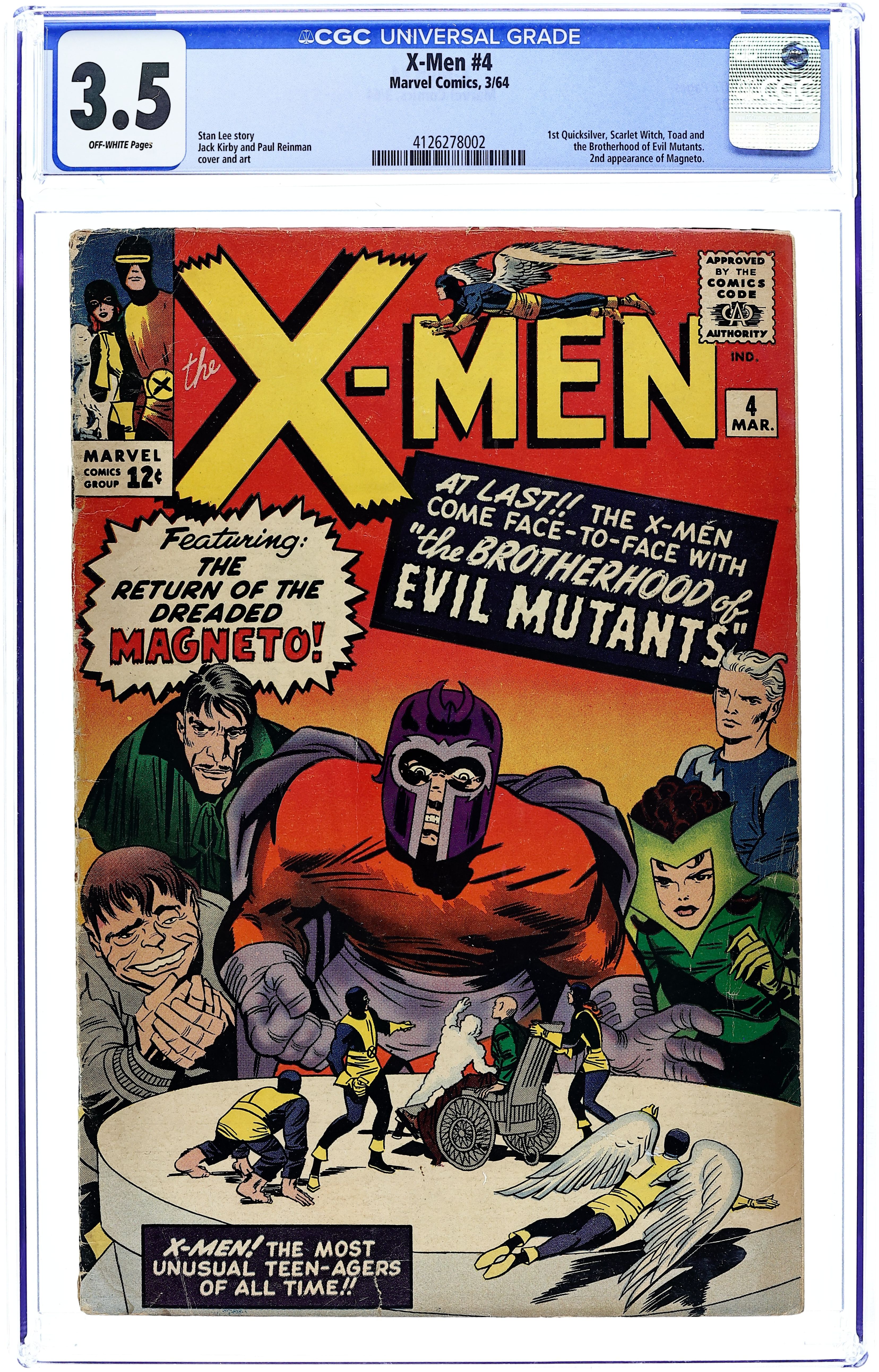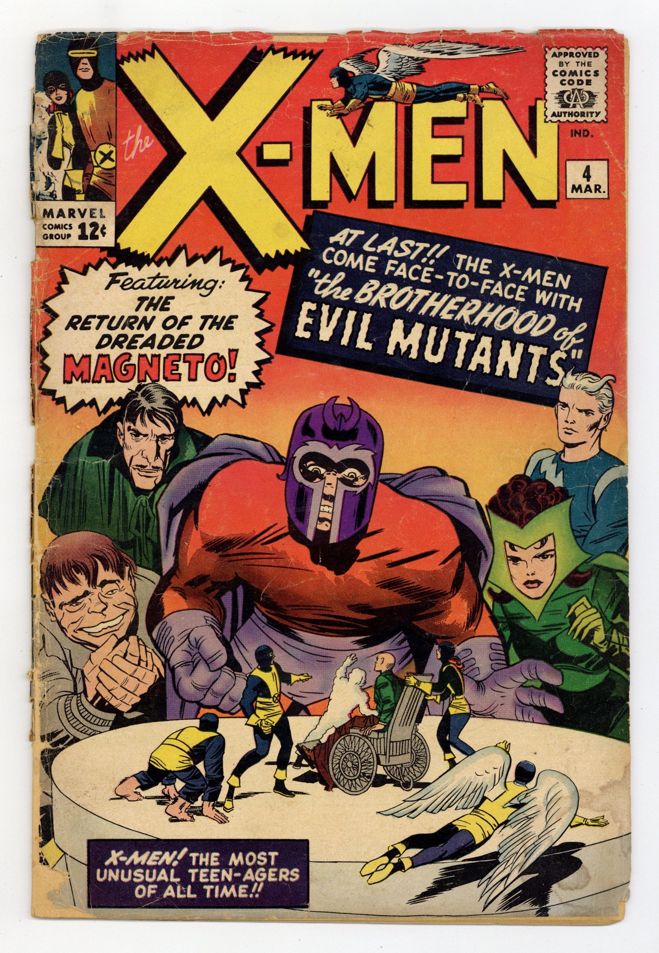 Quicksilver, Scarlet Witch, Mastermind, and Toad appear for the 1st time, and Magneto makes his 2nd appearance. Cover pencils by Jack Kirby. The Brotherhood of Evil Mutants!, script by Stan Lee, pencils by Jack Kirby, inks by Paul Reinman; Magneto and his new Brotherhood of Evil Mutants steals a freighter and uses it to take over the South American nation of Santo Marco; The X-Men invade and take the country back; Xavier is caught in an explosion and loses his mental powers. 36 pgs.