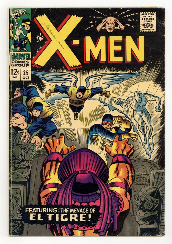 First full appearance of El Tigra. Cover pencils by Jack Kirby, inks by Dick Ayers. The Power and the Pendant!, script by Roy Thomas, pencils by Werner Roth, inks by Dick Ayers; while taking Jean to Metro College, the X-Men stop to help an orphanage that is on fire; in Central America, El Tigra and co. look for Mayan gold of Kukulcan. Letter to the dditor from Carlos Pacheco (the comic artist?). 36 pgs. $0.12. Cover price $0.12.