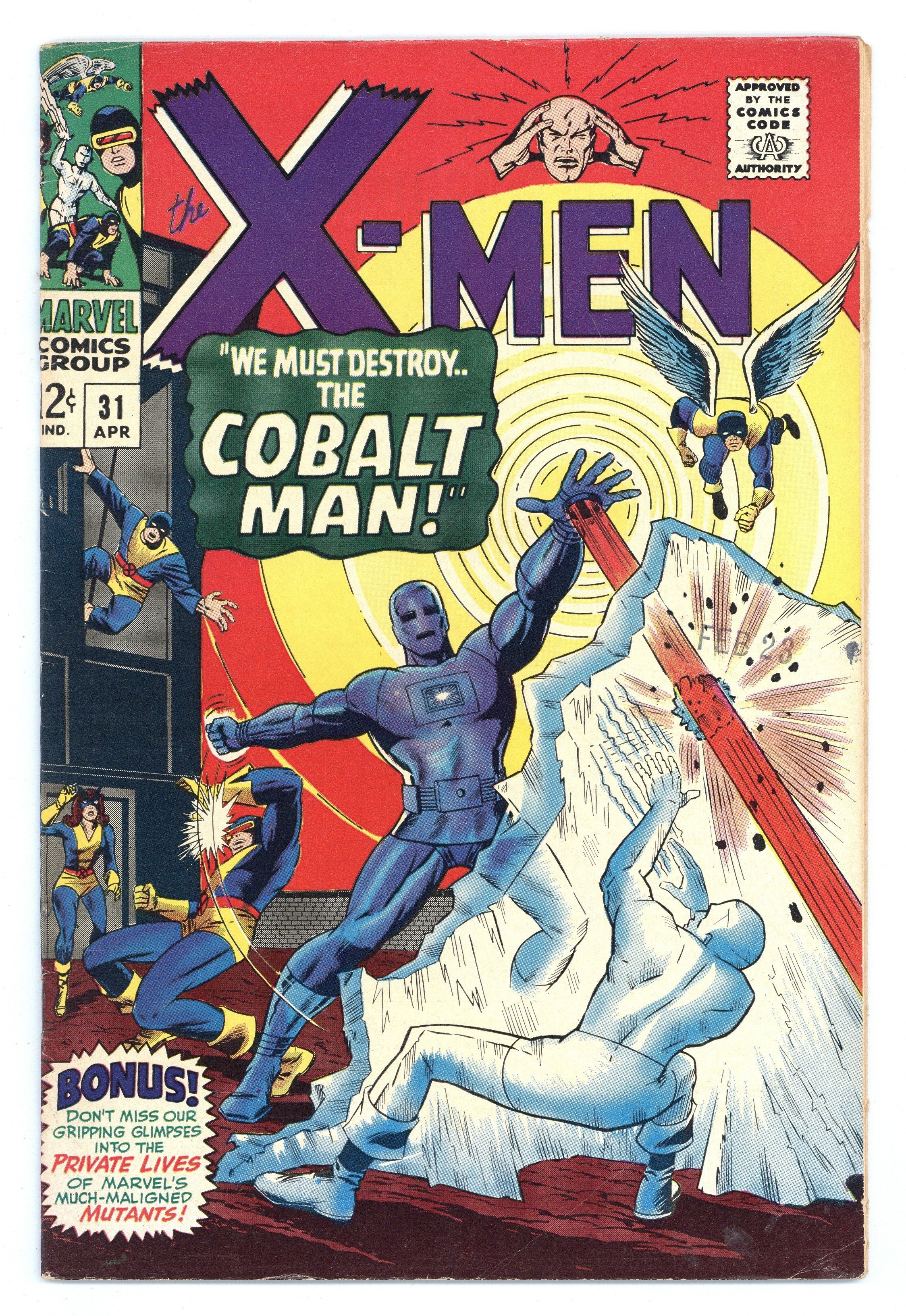 Cover art by Dan Adkins. We Must Destroy...the Cobalt Man!, script by Roy Thomas, pencils by Werner Roth, inks by John Tartaglione; The X-Men are given a weekend off and head out for some fun; Cyke and Angel visit Jean in college and find her engaged with brothers Ted and Ralph Roberts; Ralph, who used to work for Tony Stark, takes them all to his lab where he puts on his new Cobalt Man suit to impress his brother; Going a little batty, Cobalt Man wrecks the lab and heads out to Stark Industries to confront his old boss; The X-Men assemble to battle him before his suit becomes radioactive and blows up; Iron Man and Juggernaut cameos.. 36 pgs. $0.12. Cover price $0.12.